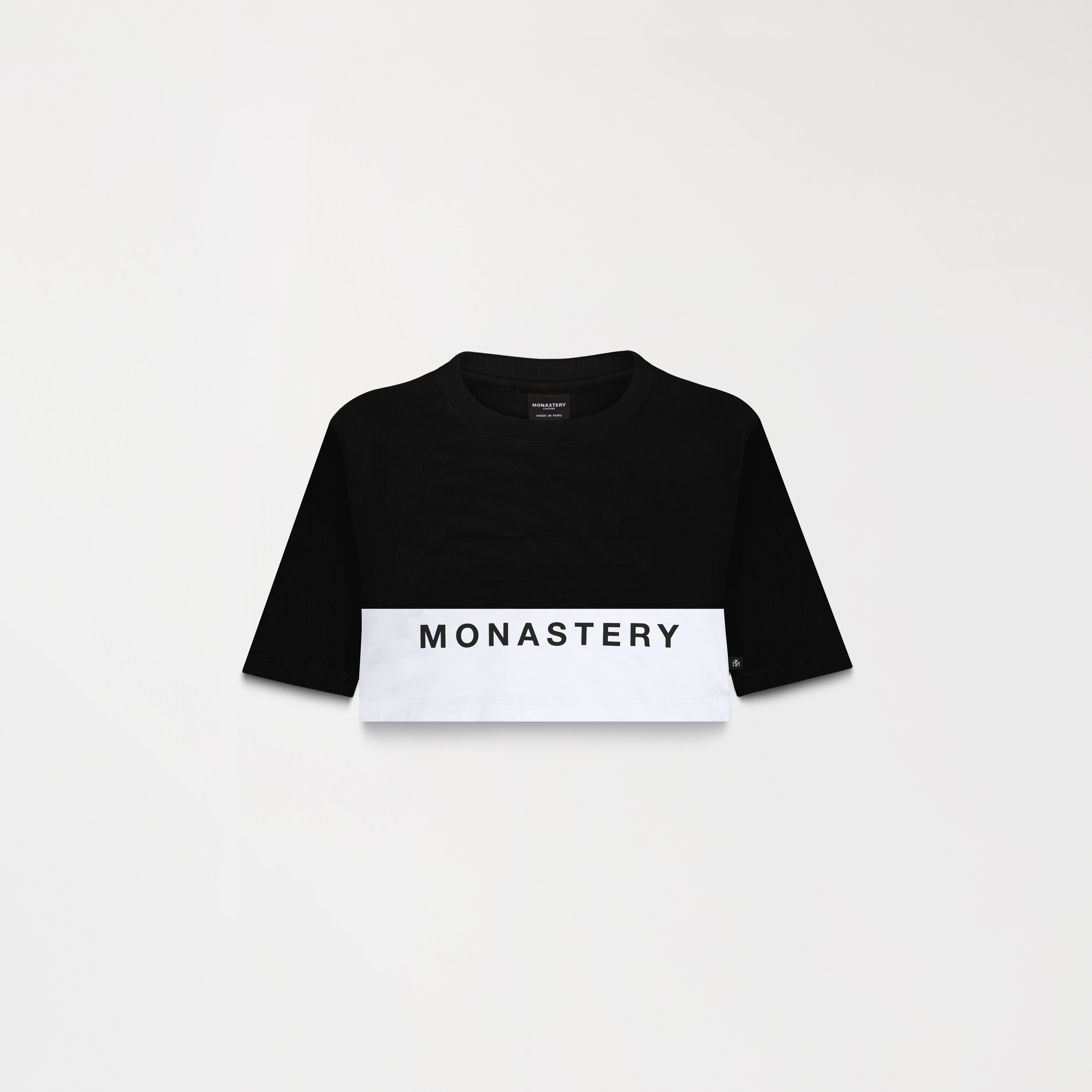Women's crop top in Peruvian cotton exclusively for Monastery, crafted in a petite silhouette, featuring a cut-out at the front at the waistline, the iconic Monastery logo printed flat below the cutout, and insignia logos printed flat on the back. Arwen is a dynamic garment that brings elegance and versatility to your wardrobe.