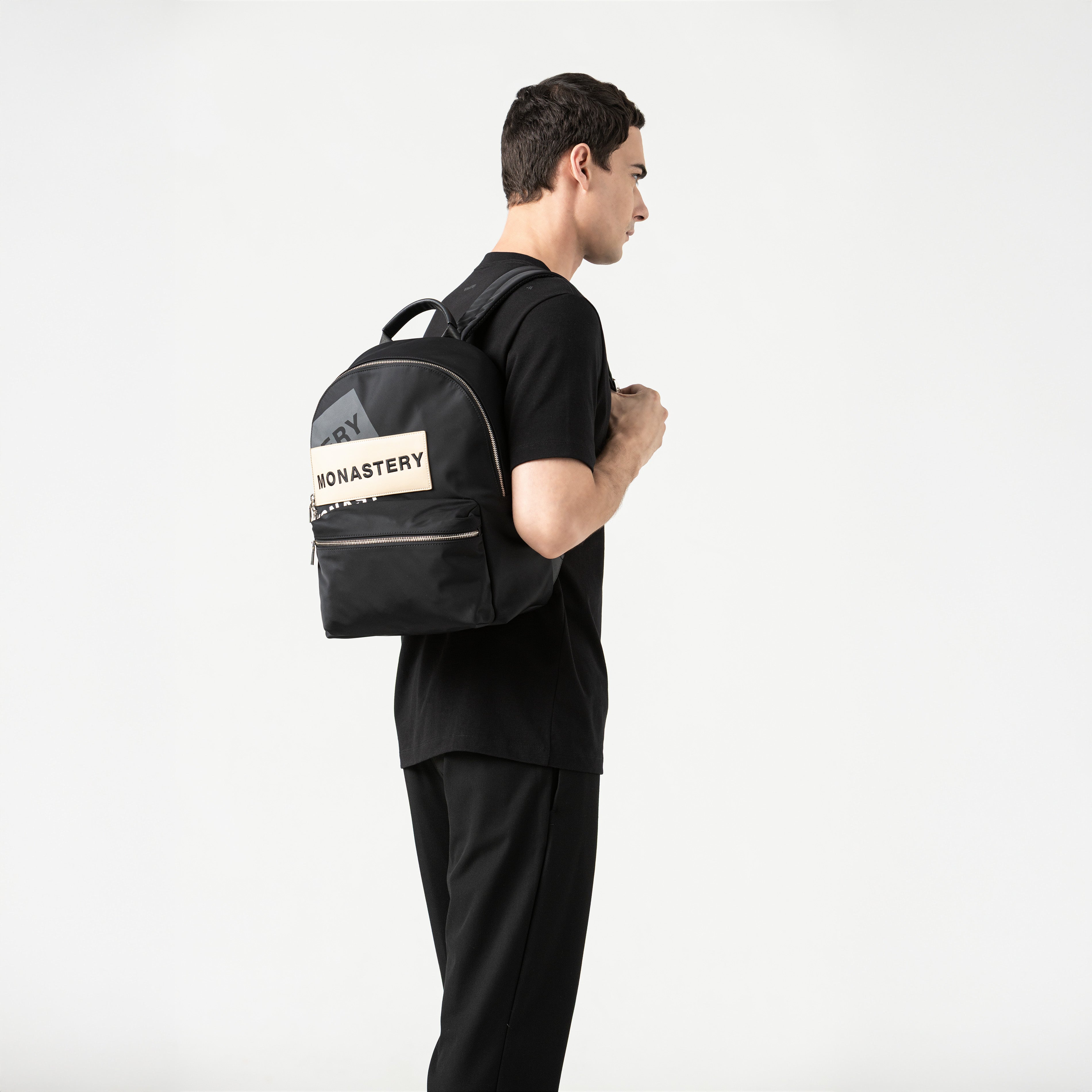 Cosmo is a unisex black backpack that fuses graphic design, durable materials, and functional details. Designed for those who move with style and purpose. Crafted from high-quality polyamide, a lightweight, durable material perfect for everyday use, the front features a printed design accompanied by 3D embroidery. It features two compartments: a large main compartment and a more accessible one for quick organization of personal belongings. The back features a strap for easy attachment to a suitcase, ideal for comfortable travel. Additionally, the Monasterio logo is embossed in low relief, subtle yet distinctive, reinforcing the piece's authenticity. Cosmo is a backpack designed for the contemporary pace: urban, versatile, and with attitude.