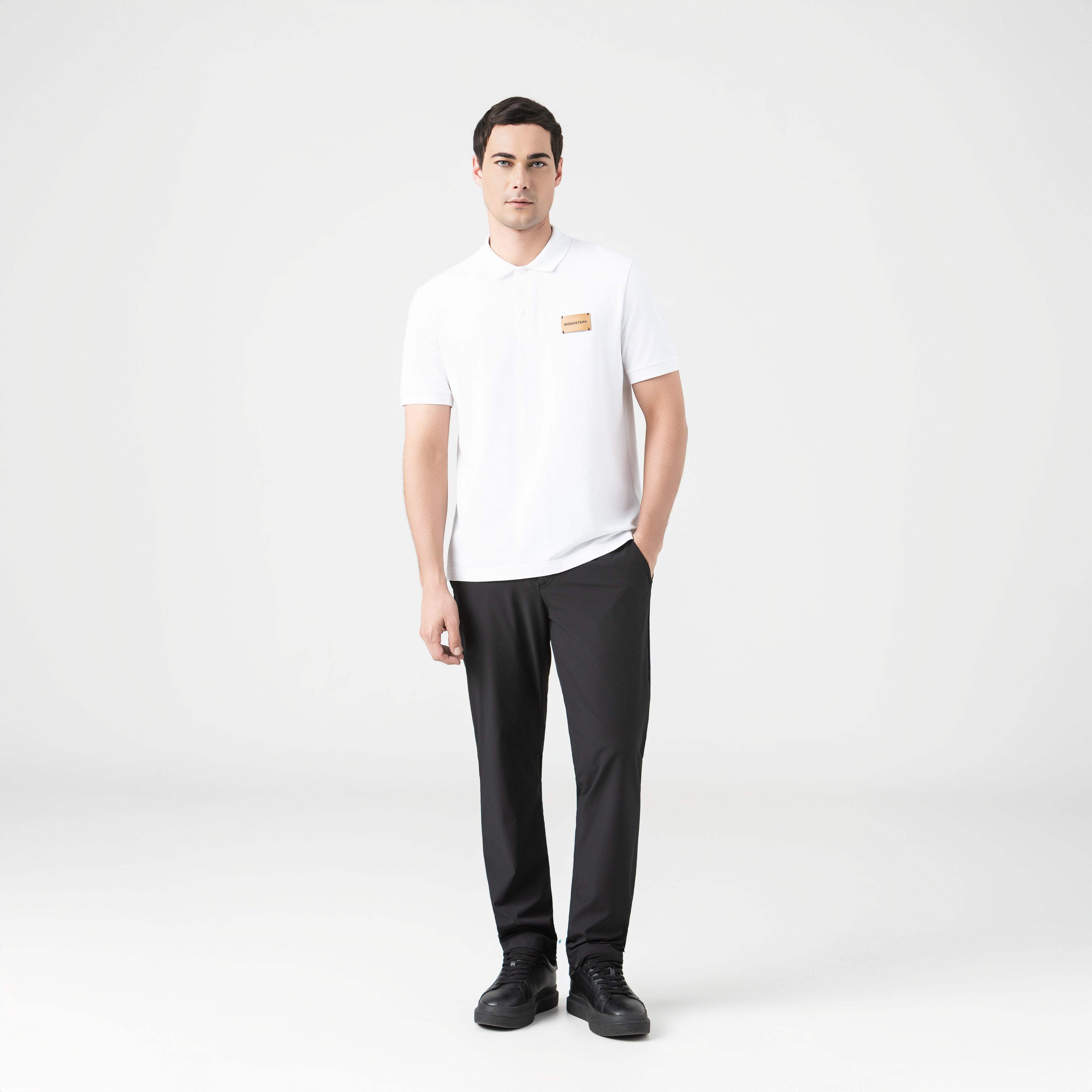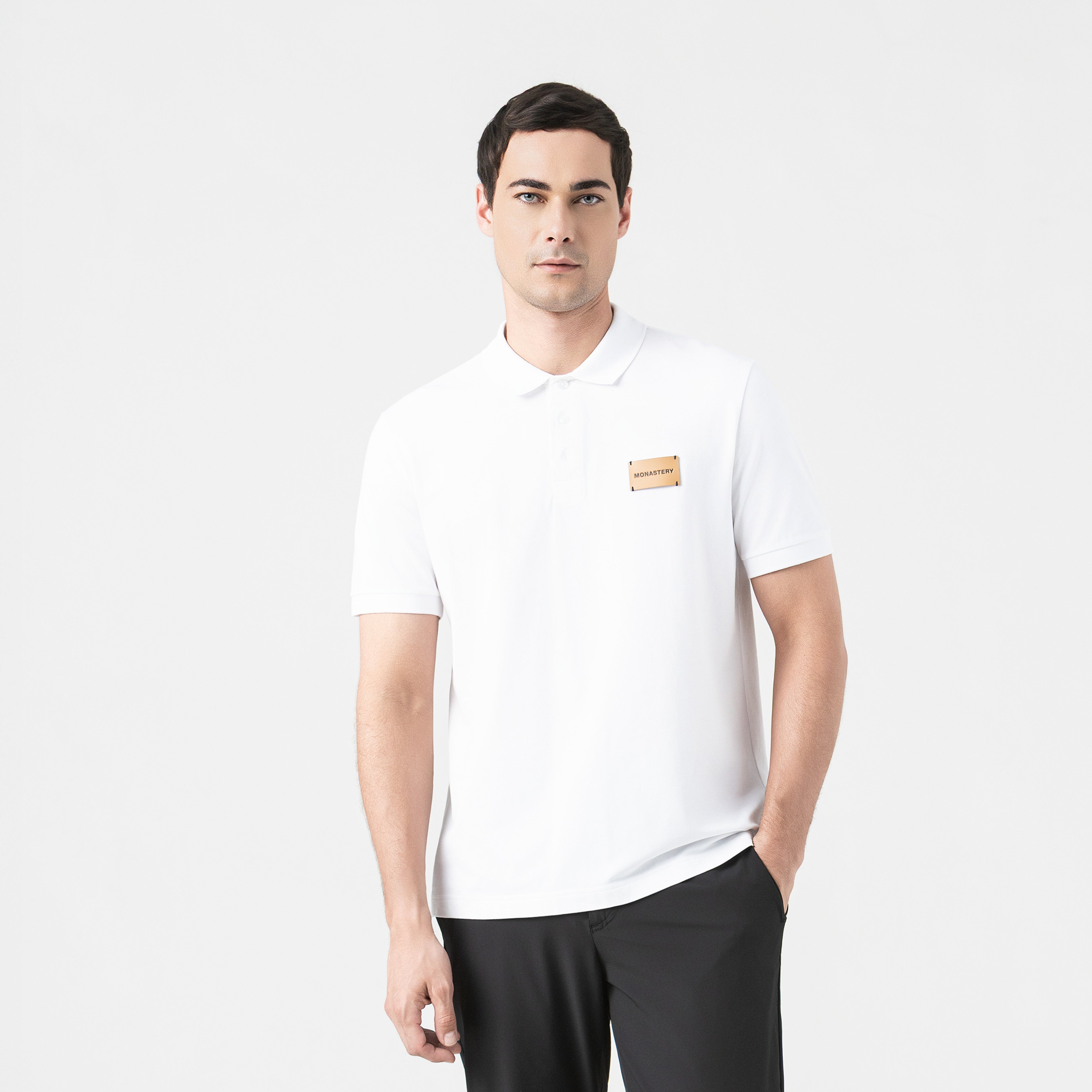 Brunello is a men's polo shirt, crafted in a regular fit, from 100% Peruvian Pima cotton exclusively for Monastery. This men's polo shirt fuses classic design with high-end details. Crafted with a straight collar and knit cuffs that provide structure and sophistication, it features contrasting buttons and a front appliqué with the Monastery logo. On the back, a subtle flat print enhances its distinctive character. Ideal for a casual look with effortless elegance.