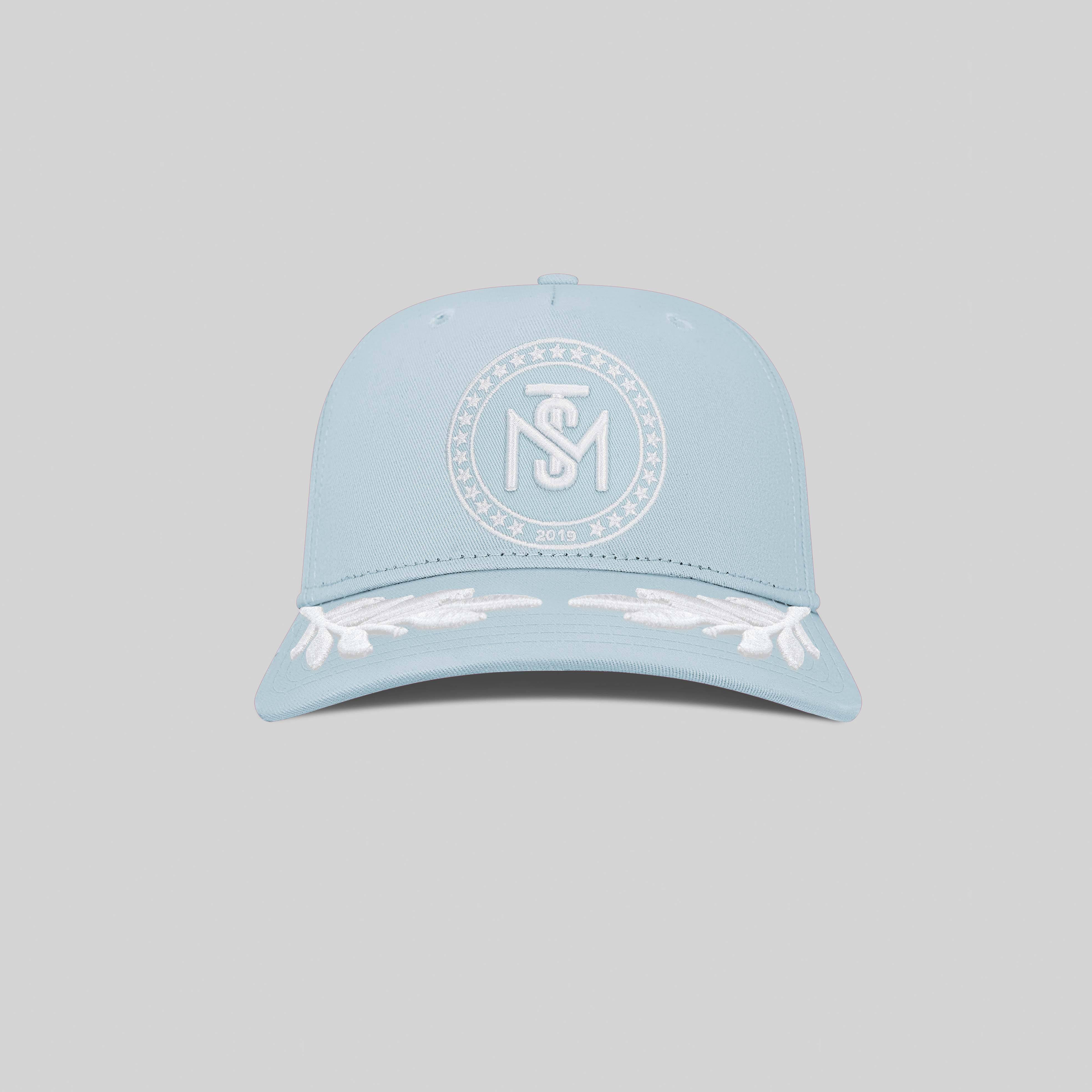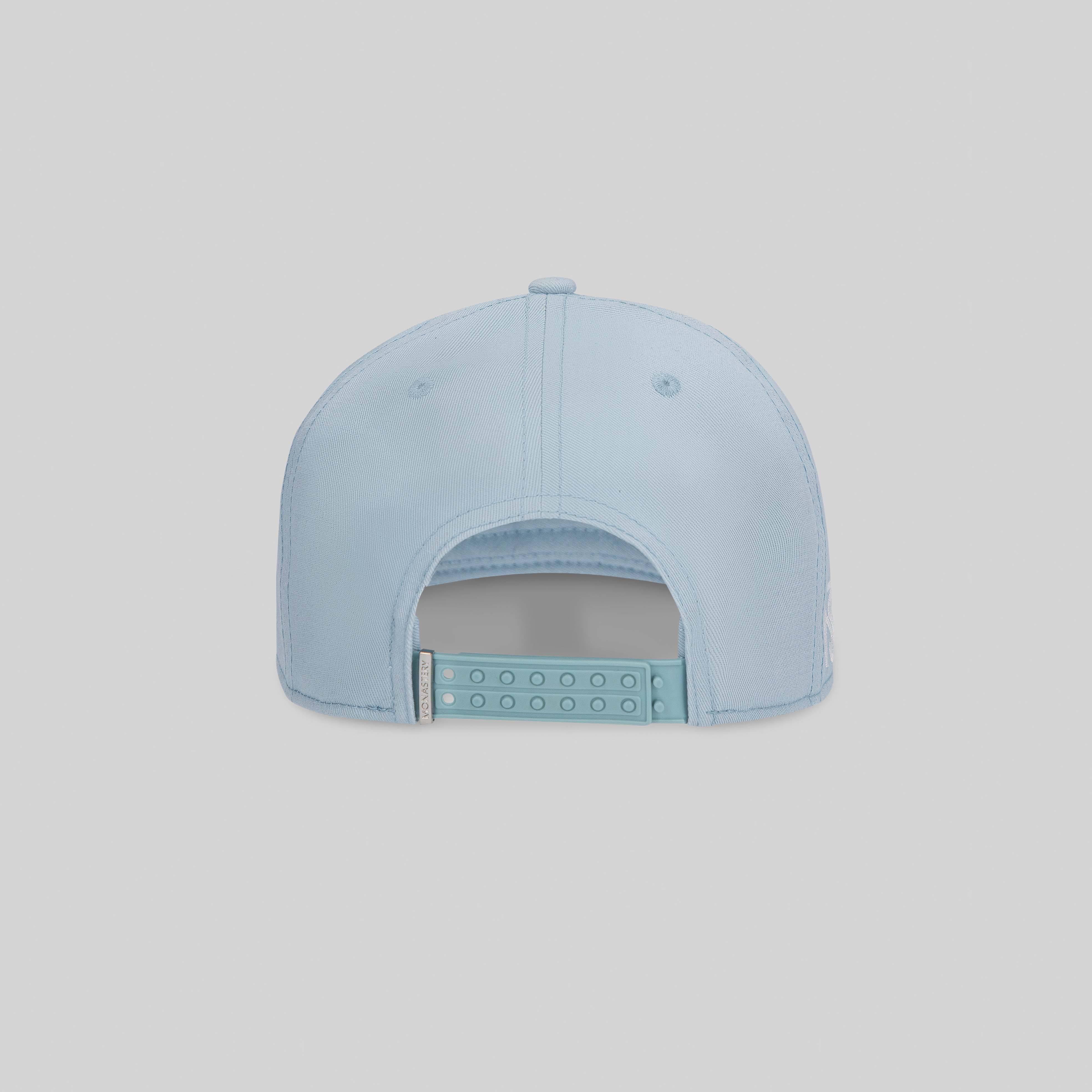 Cap made of 100% cotton twill, in baby blue, the main color of the season, with flat embroidery and 3D embroidery. Its design is a tribute to the teams in the world of car racing. Gino is a dynamic and classic accessory, which also features a 100% leather strap closure system with embossed brand logo.
