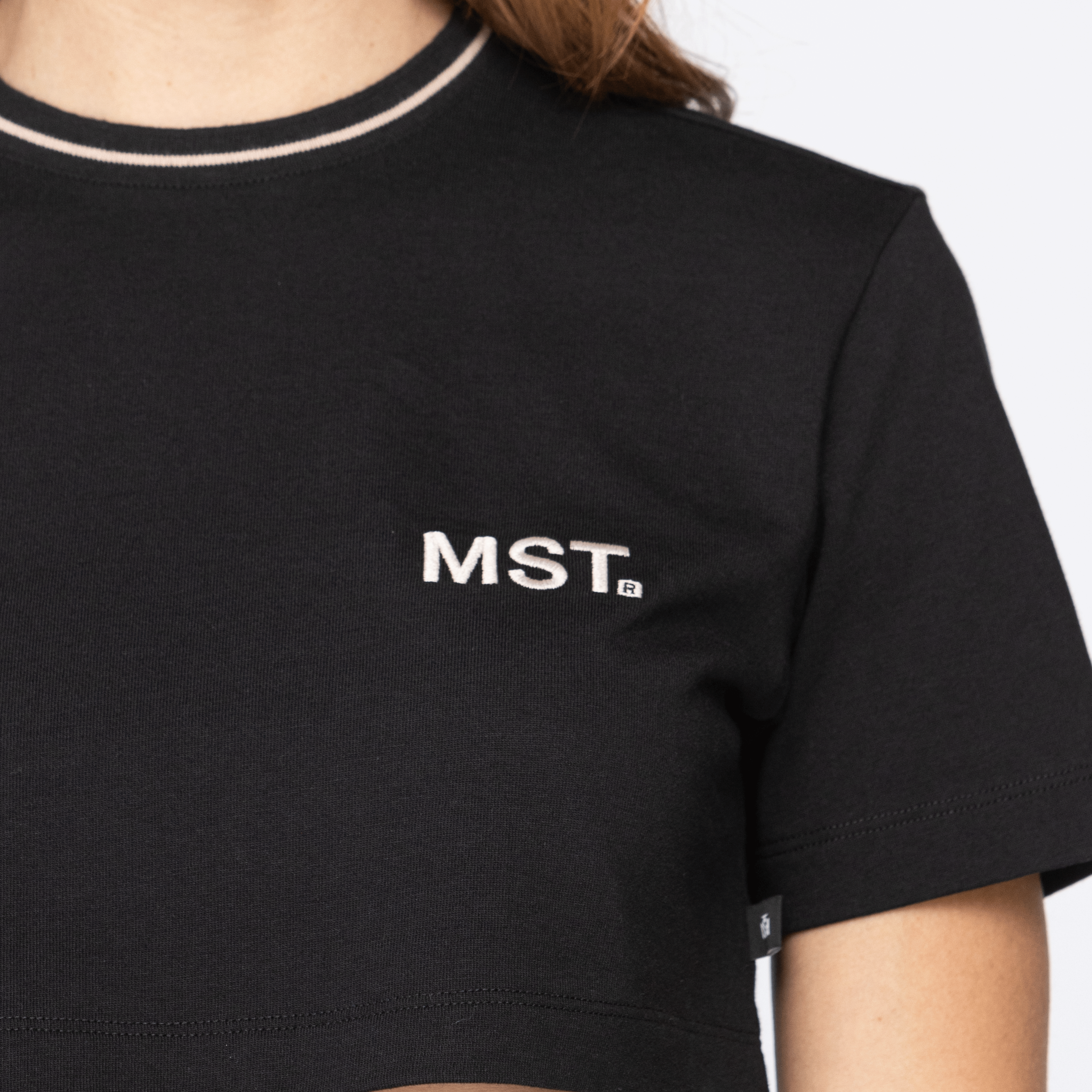Women's 100% cotton crop top exclusive to Monastery, made in a petite silhouette, Elden features a heart stitch embroidery of the iconic MST logo, which adds a relevant touch of the brand identity, this reference has a straight knit collar which is a versatile option, perfect to combine with a variety of outfits.