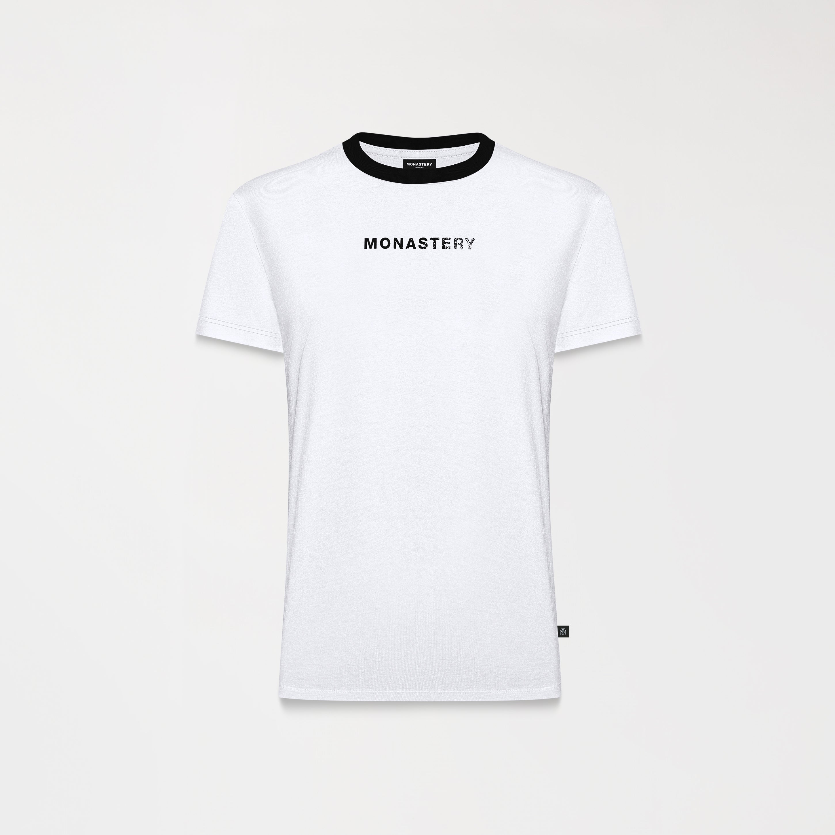 A women's T-shirt crafted in a small silhouette designed to highlight the feminine figure through its fresh, fitted textile base. Emmeline features a contrasting collar and features our MONASTERY logo in the center front using a plastisol technique, while the back features flat prints of our iconic logos. This style is crafted from our premium cotton textile base with elastane for greater comfort, allowing a better fit on the feminine silhouette.