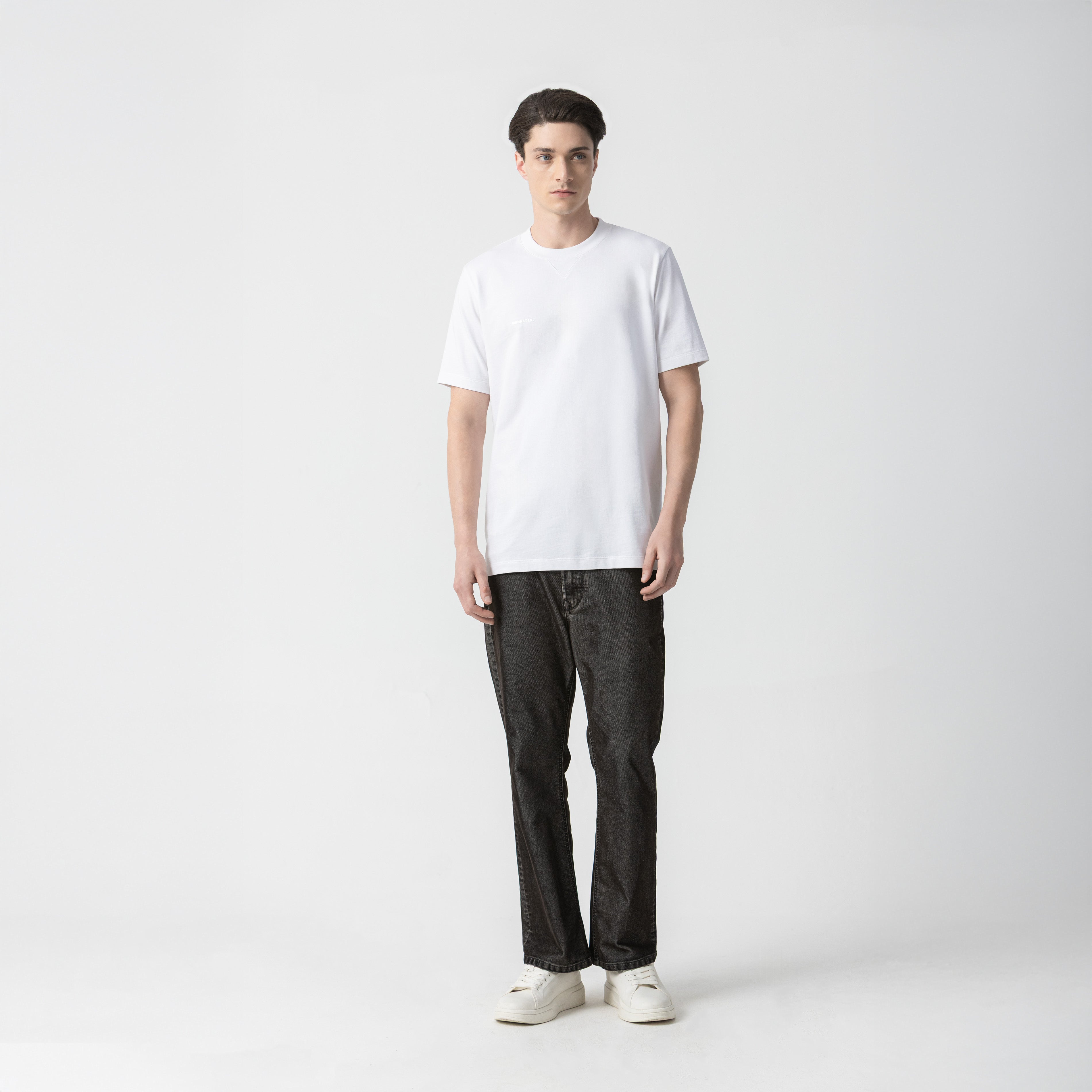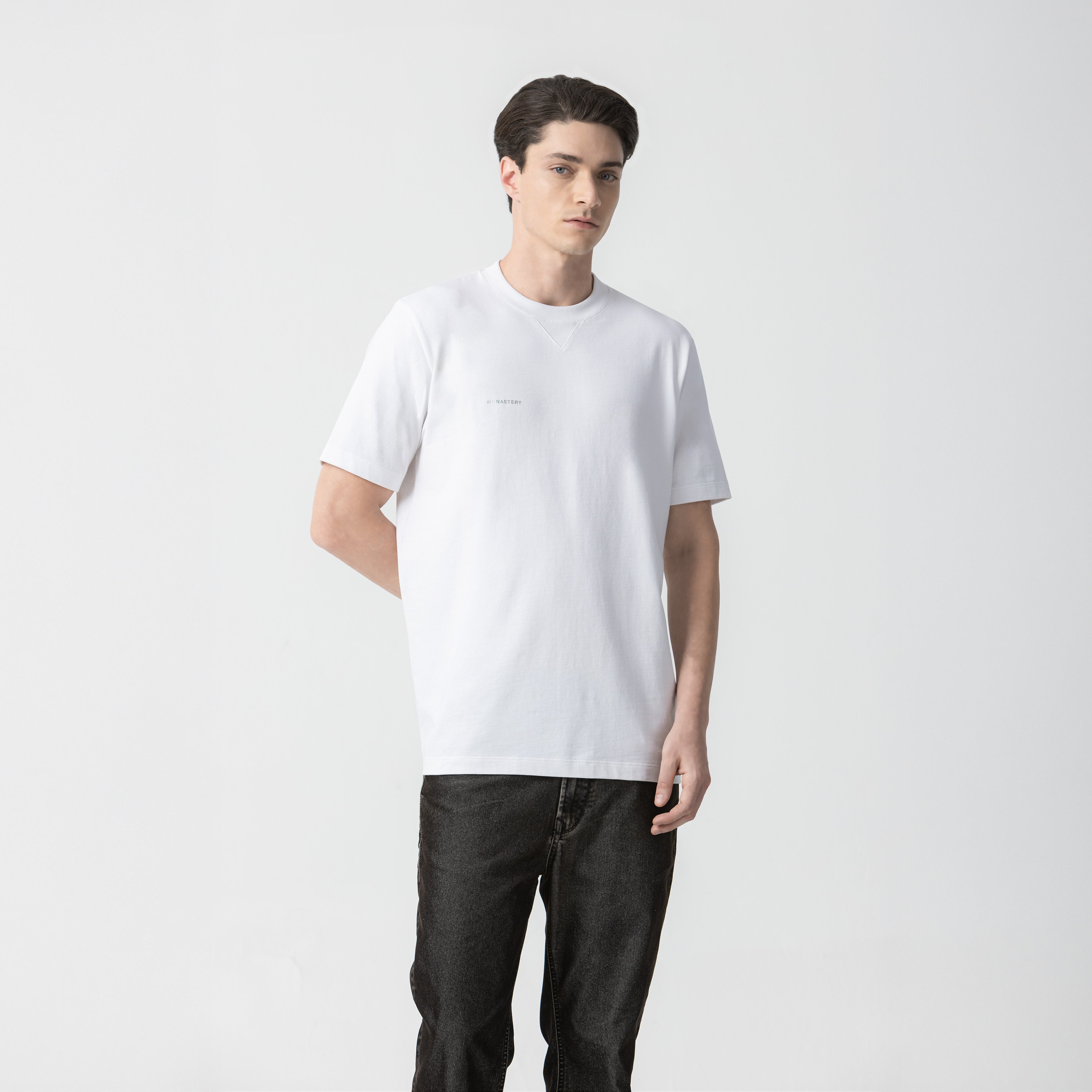 Hudson is a men's regular-fit t-shirt made from Monastery 2 fabric, a premium cotton that provides softness and structure.It features a distinctive triangular detail at the neckline that reinforces its technical design. On both the front and back, the logo is applied using a silver foil technique, creating metallic reflections that enhance its visual presence.