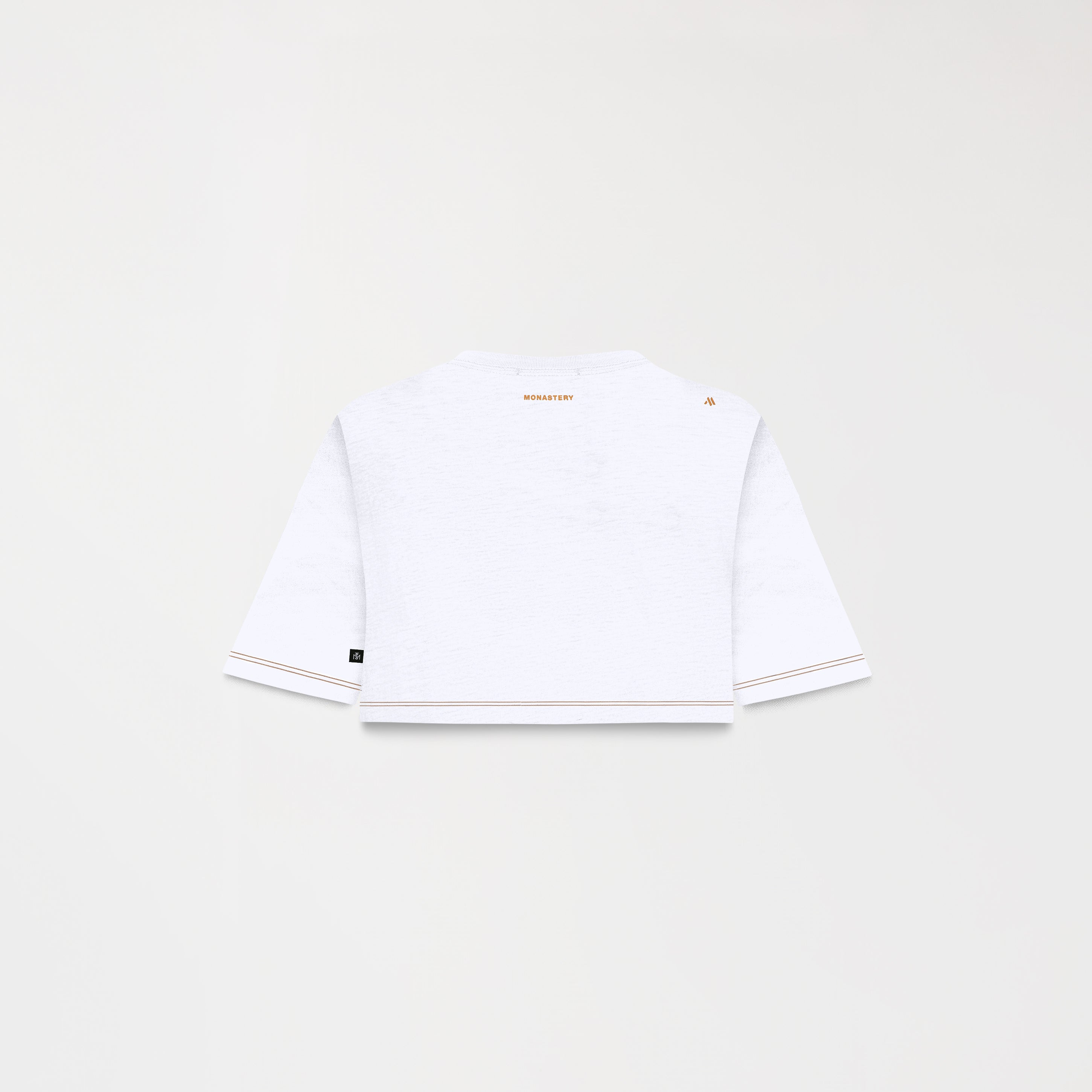 Keona is a crop top made from 100% high-quality, ultra-siliconized cotton, offering softness, breathability, and a perfect fit. Designed in a petite silhouette and available in black or white, it features a front graphic applied using a distressed technique, achieving a worn and authentic finish. The back incorporates a flat print, while the sleeves stand out with their biscuit-colored stitching, a signature shade of the collection that provides a subtle and original contrast.