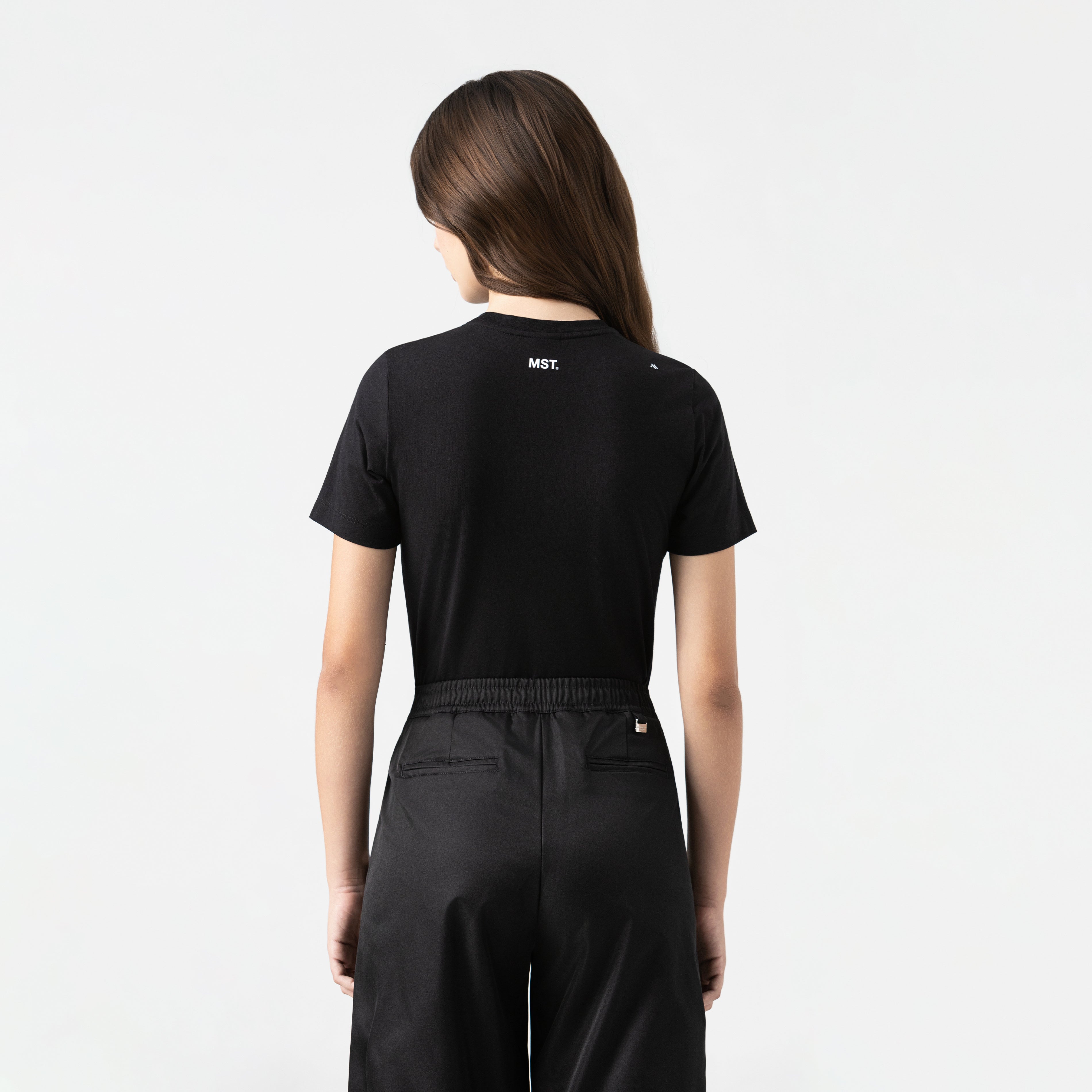 A women's T-shirt crafted in a small silhouette designed to highlight the feminine figure through its fresh, fitted textile base. Marie features MST artwork on the front using a Flock + Plastisol technique. It is a dynamic garment thanks to its textured front and its combination of techniques, accompanied by our signature logos on the back. This garment features details that give it a unique and exclusive touch, while maintaining the comfort and versatility of a basic garment.
