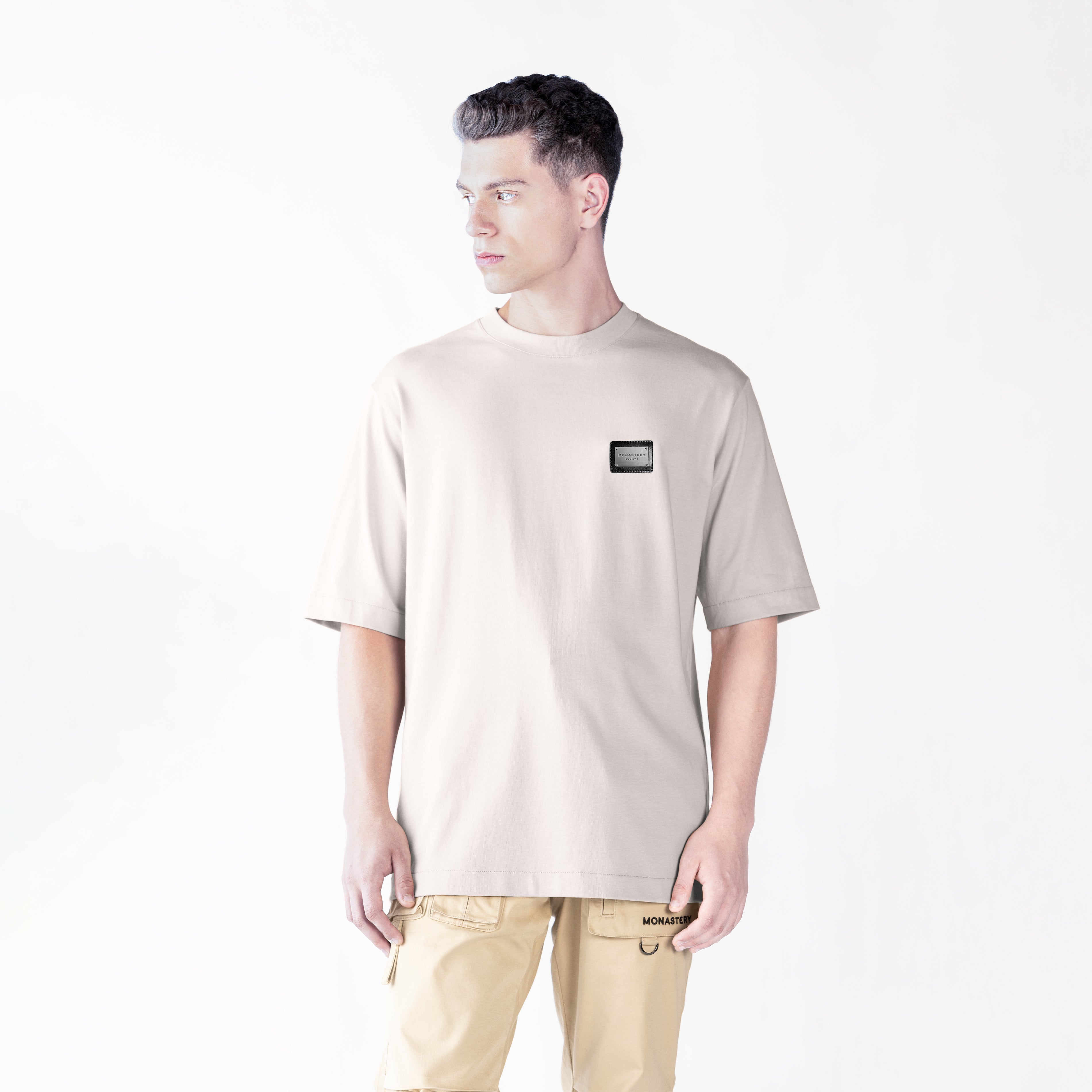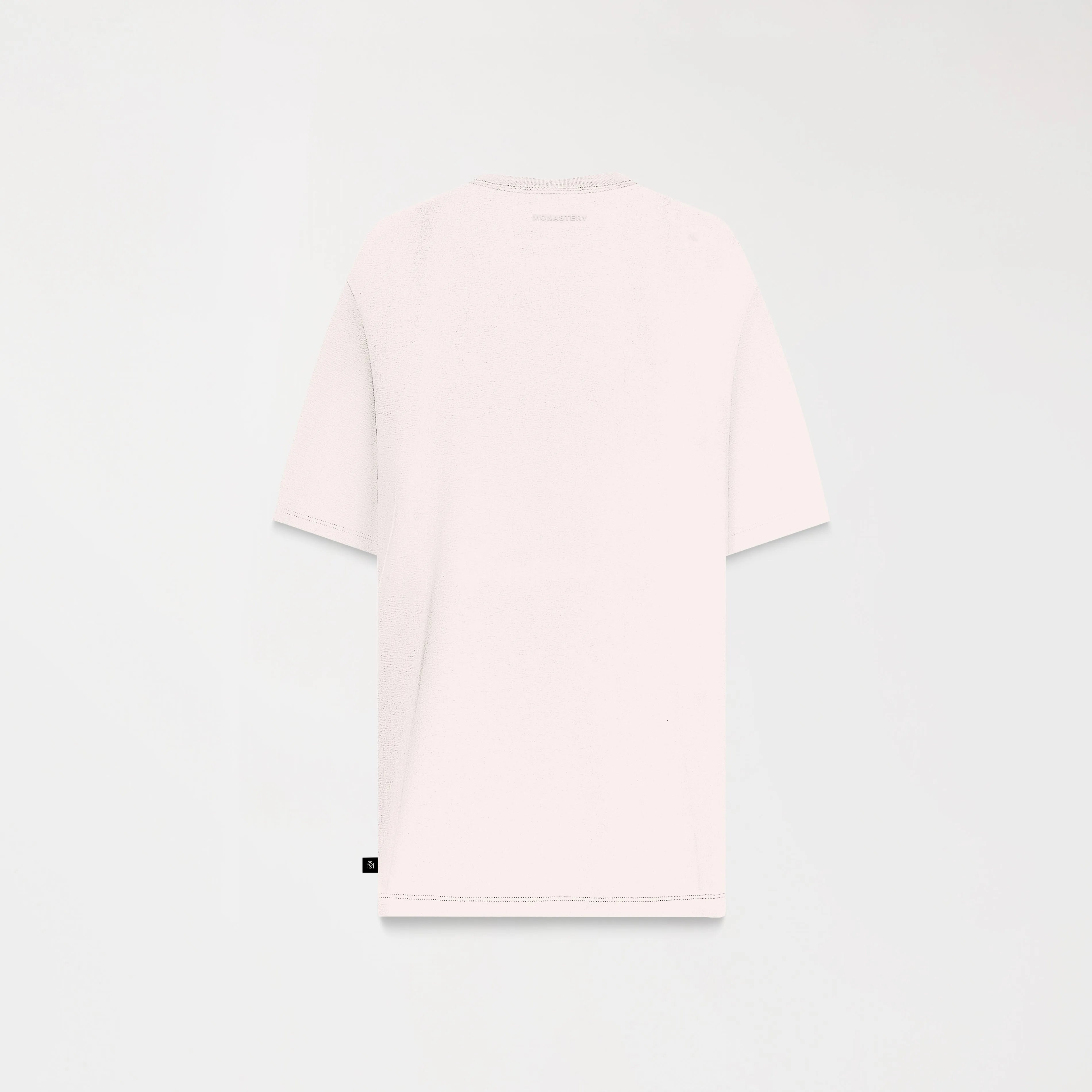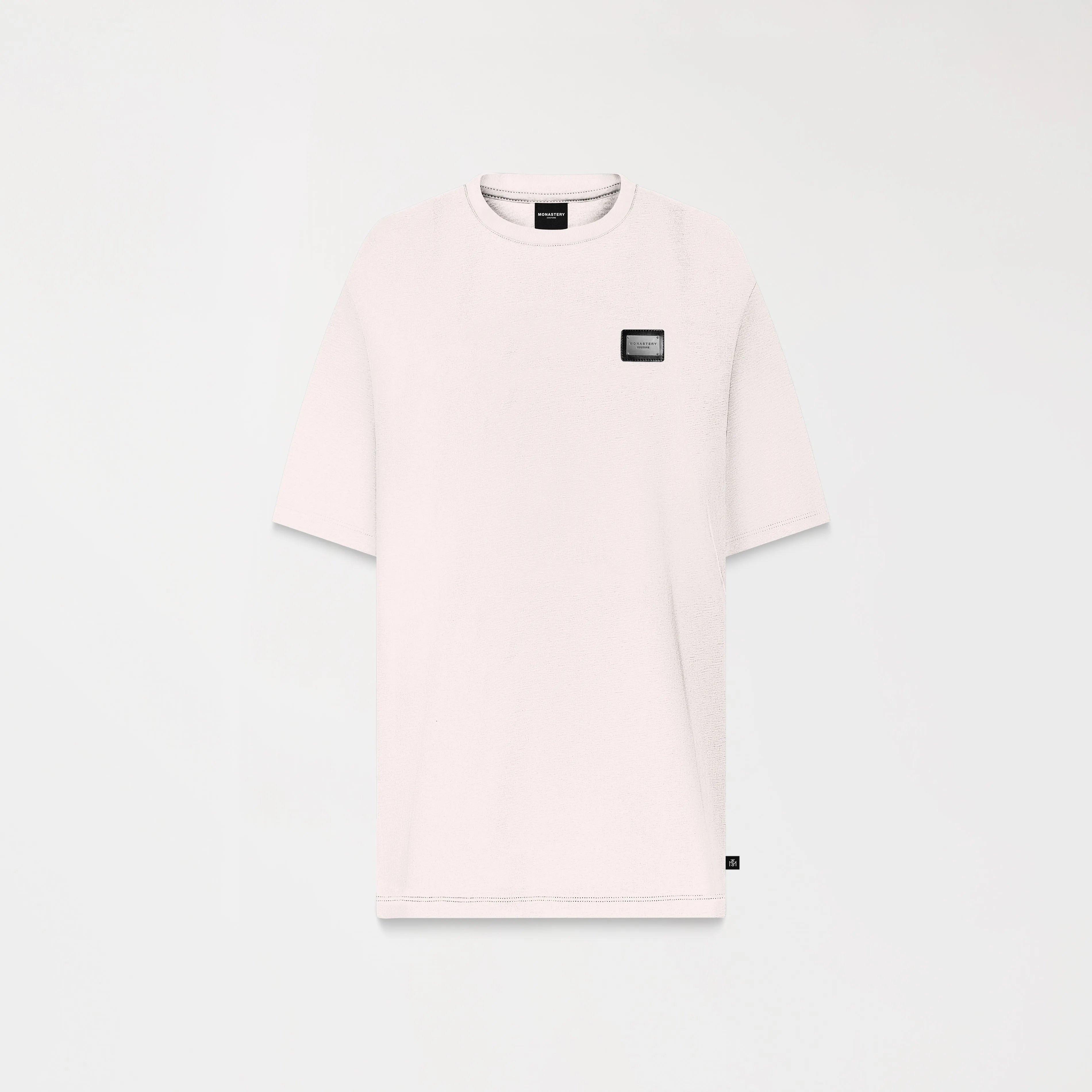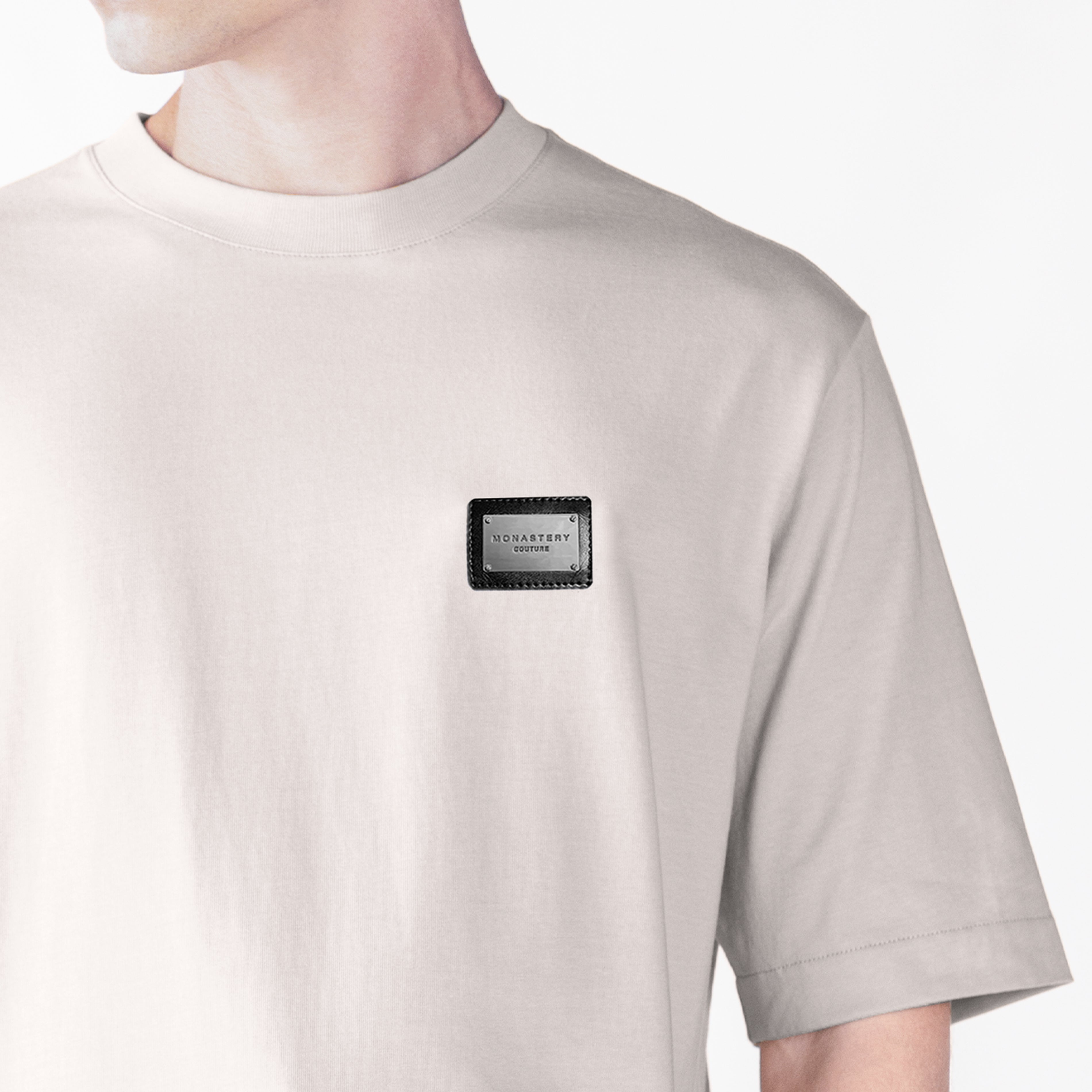 Oldingham is an oversized men's T-shirt with a 2.5cm ribbed collar and crafted from Monastery cotton. This style features a counter-marked Monastery Couture metallic appliqué at the heart-stitch level. The back features a combination of our Monastery logo and the iconic astronaut Phillip in a high-density knitting technique, offering a sleek and contemporary design. Ideal for those seeking a comfortable and fashionable look.