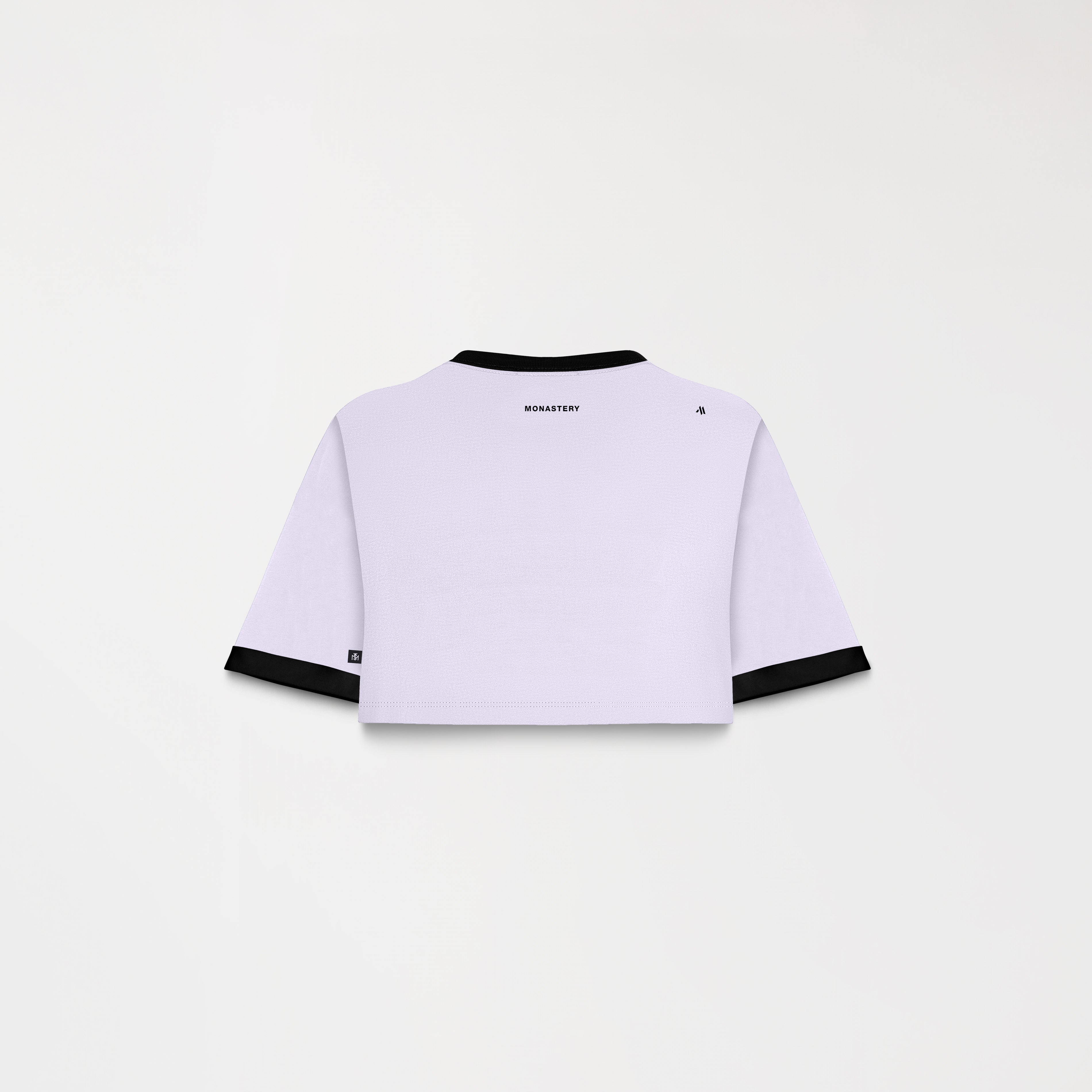 Women's crop top in Peruvian cotton exclusively for Monastery, crafted in a small silhouette, Senn features the Monastery logo and insignia in a plastisol + glossy transfer technique. This style features contrasting details that give it a distinctive and modern touch. This crop top is ideal for those seeking a comfortable and sophisticated look thanks to its large textile base.