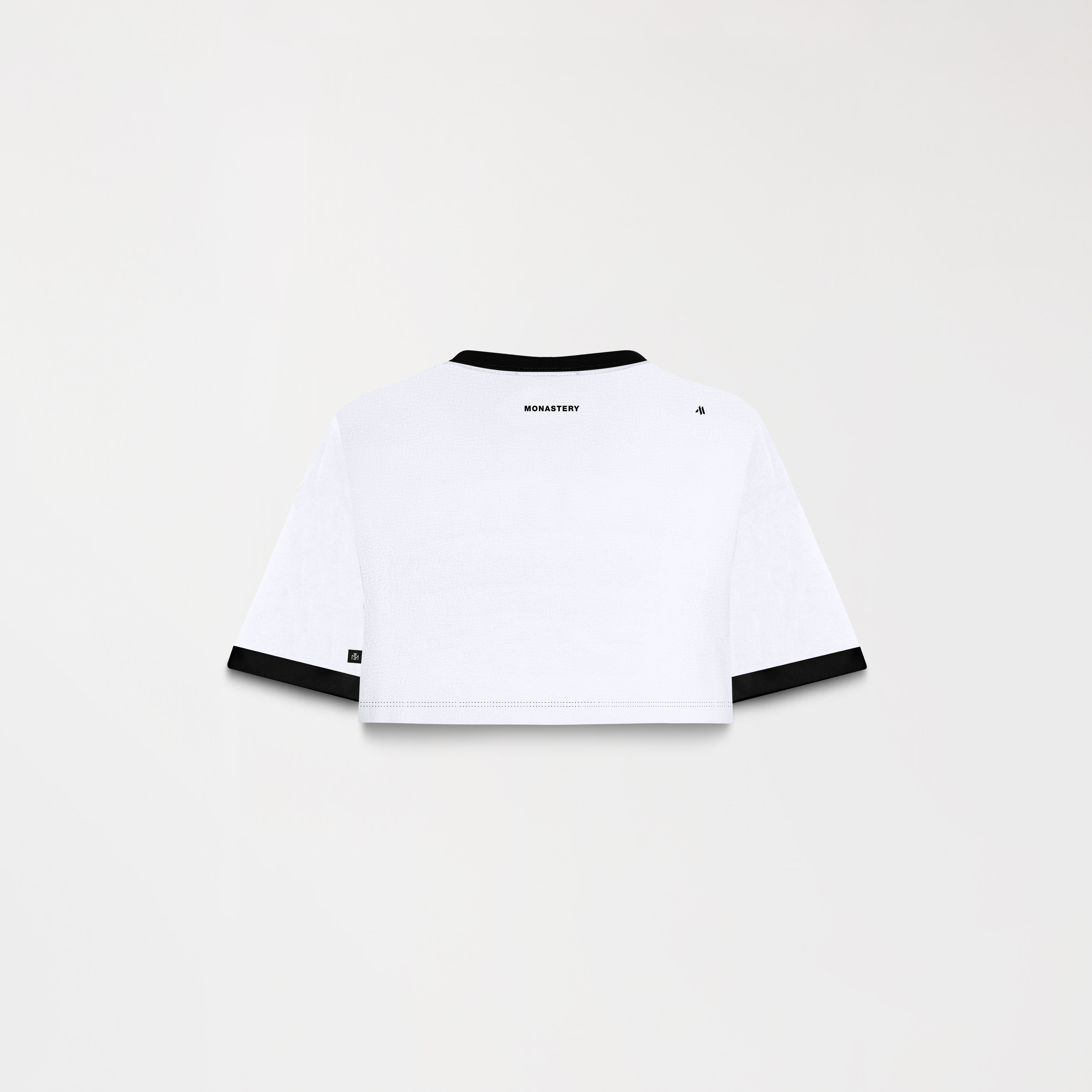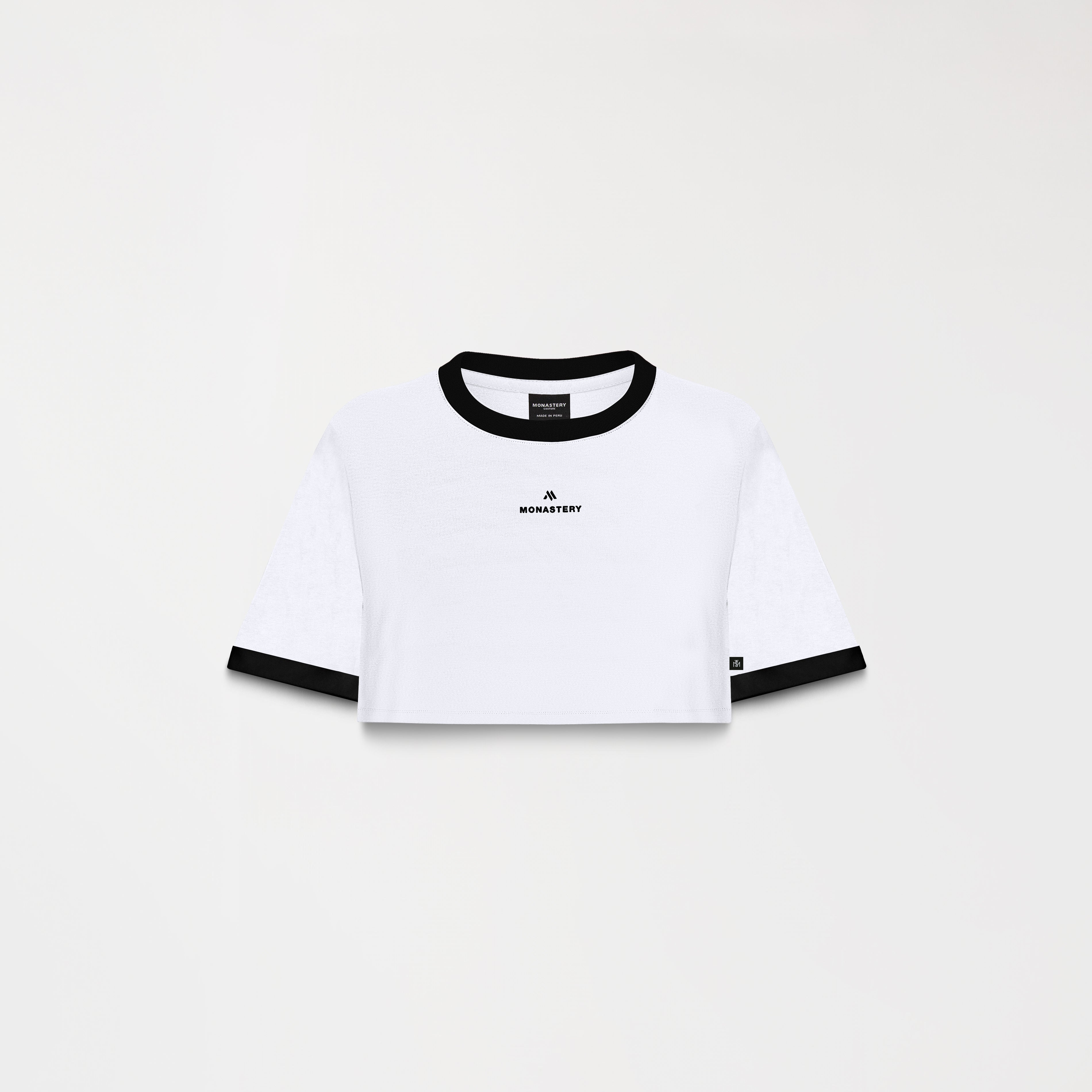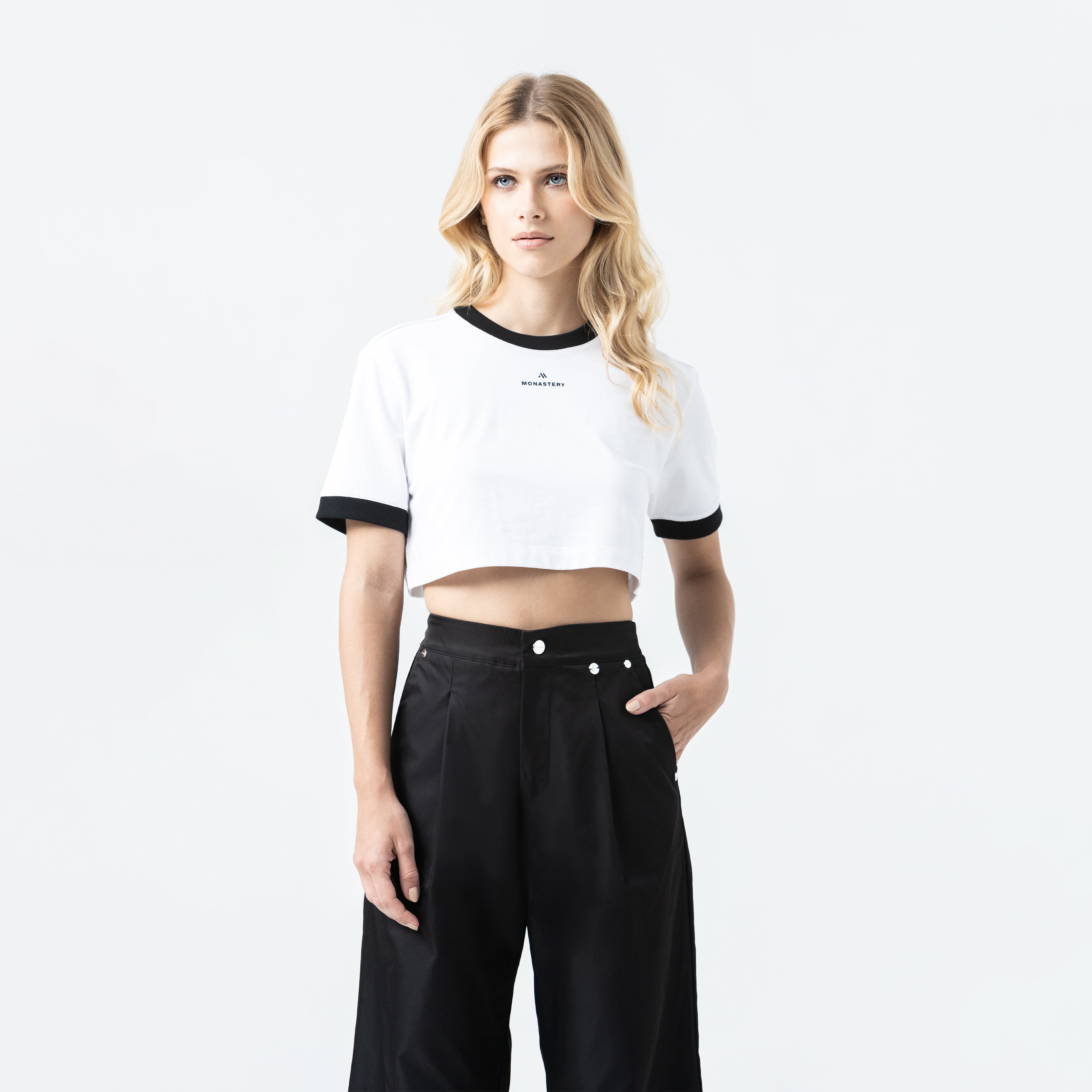 Women's crop top in Peruvian cotton exclusively for Monastery, crafted in a small silhouette, Senn features the Monastery logo and insignia in a plastisol + glossy transfer technique. This style features contrasting details that give it a distinctive and modern touch. This crop top is ideal for those seeking a comfortable and sophisticated look thanks to its large textile base.