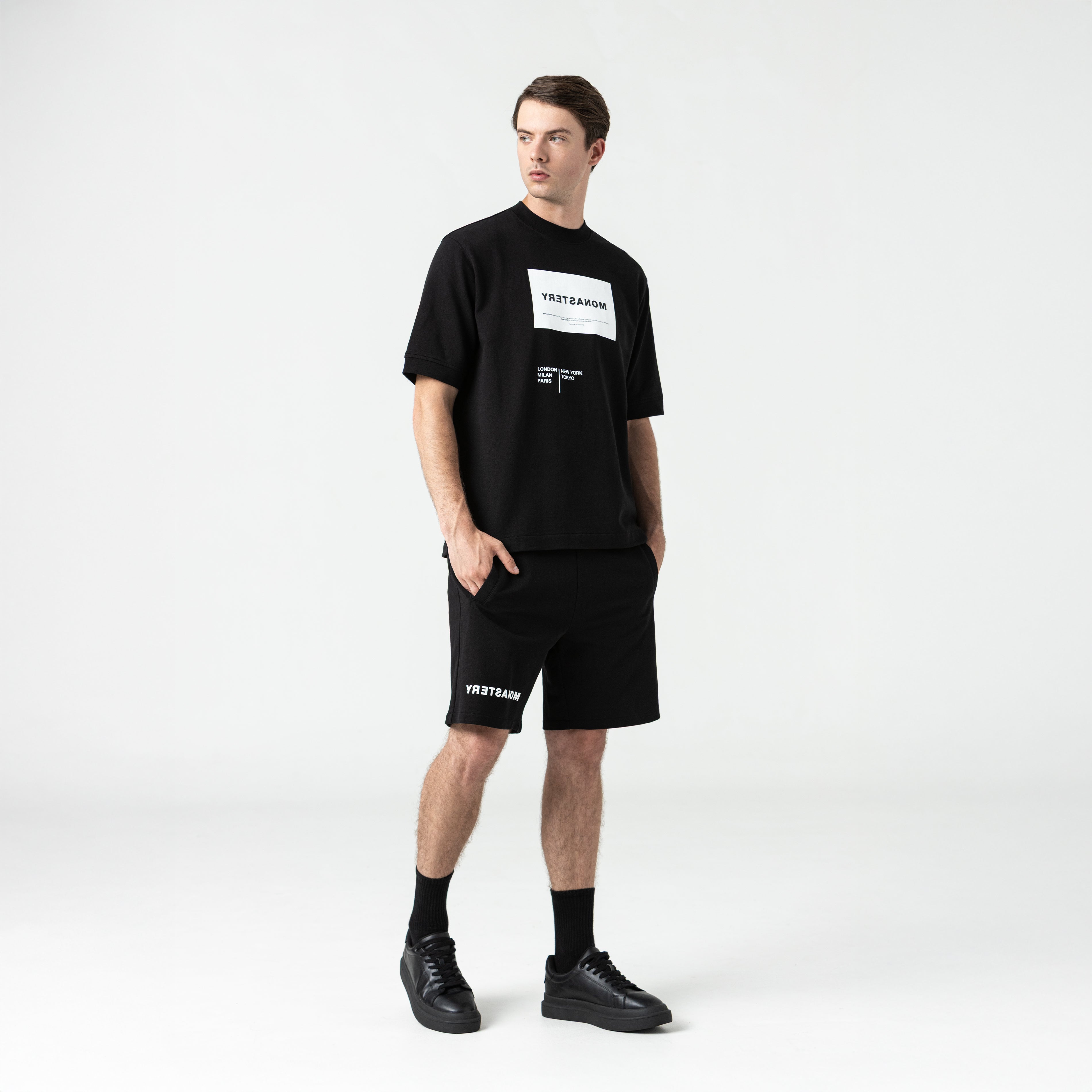 Witton is a men's coarse set made from a cotton and polyester blend. Its t-shirt is crafted in an oversized silhouette with Monastery logo artwork using a high-density and flat print technique. The shorts are crafted in a regular silhouette with our Monastery logo artwork using a high-density technique. Witton is a modern, dynamic, and comfortable item, created to stand out in your everyday life.