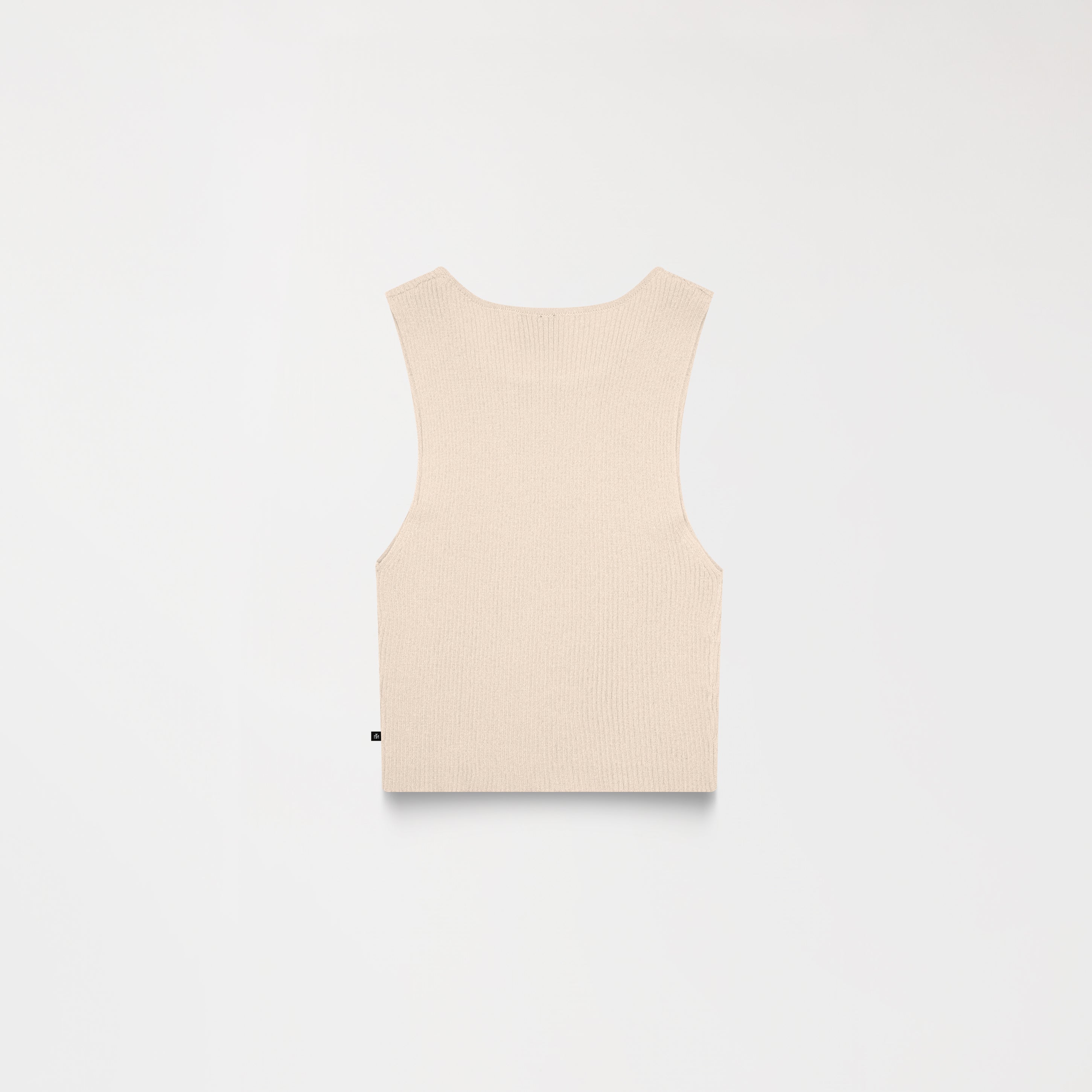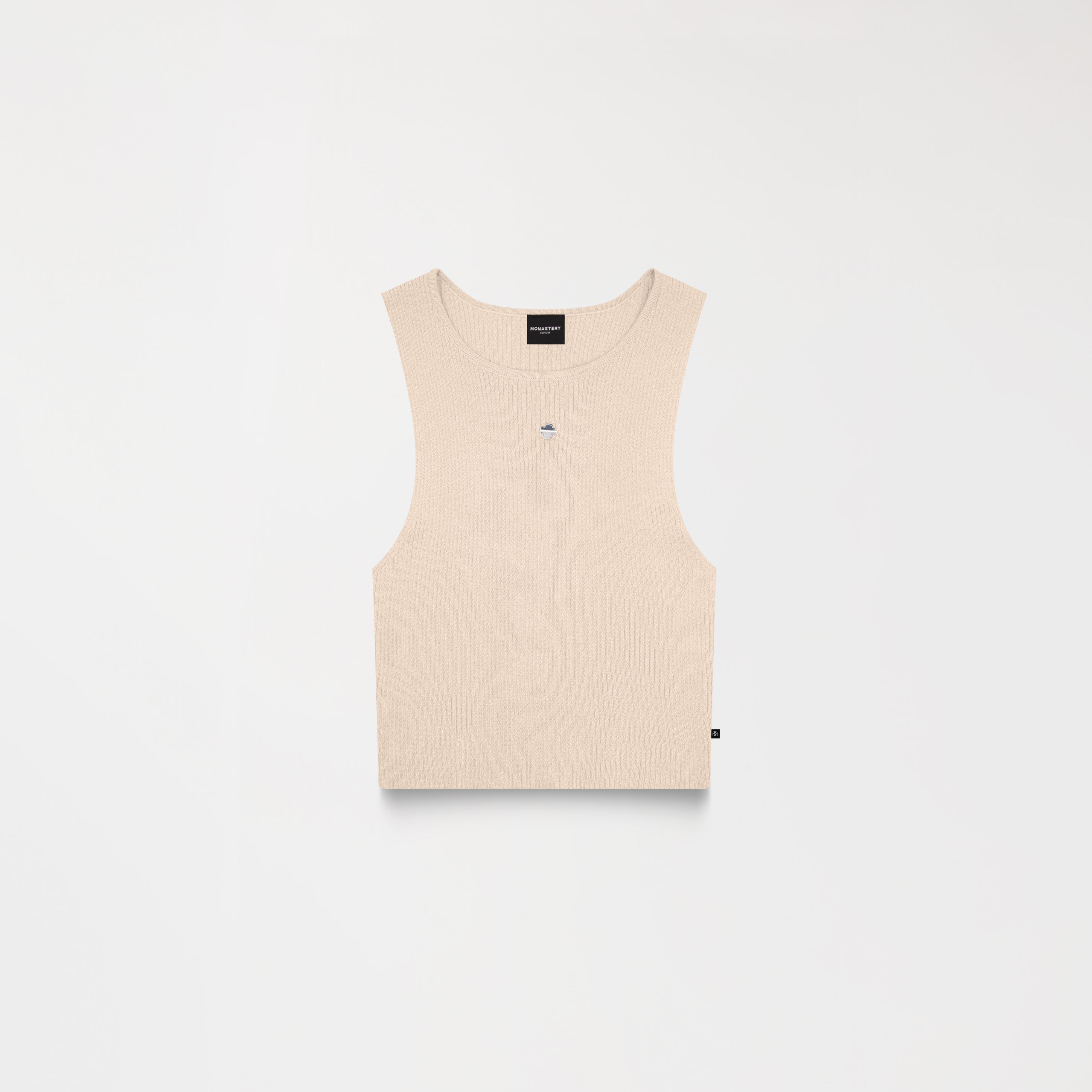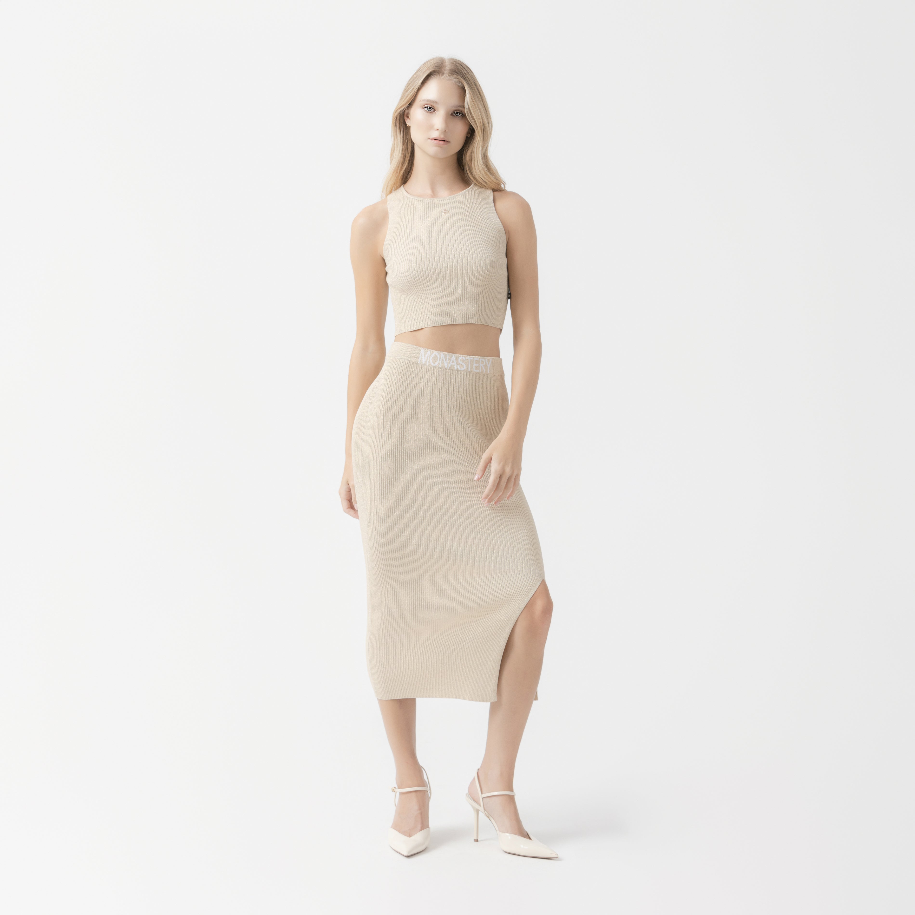 Feminine set featuring a sleeveless top and midi skirt, crafted in ribbed fabric with a soft touch and a structured look. The top features a straight silhouette with a high neck and a metallic appliqué on the front that adds a subtle touch of shine. The straight-cut skirt includes a discreet side slit and a waistband with the MONASTERY brand name in contrast, highlighting the garment's character. Ideal for a stylish casual look or to elevate a minimalist outfit.