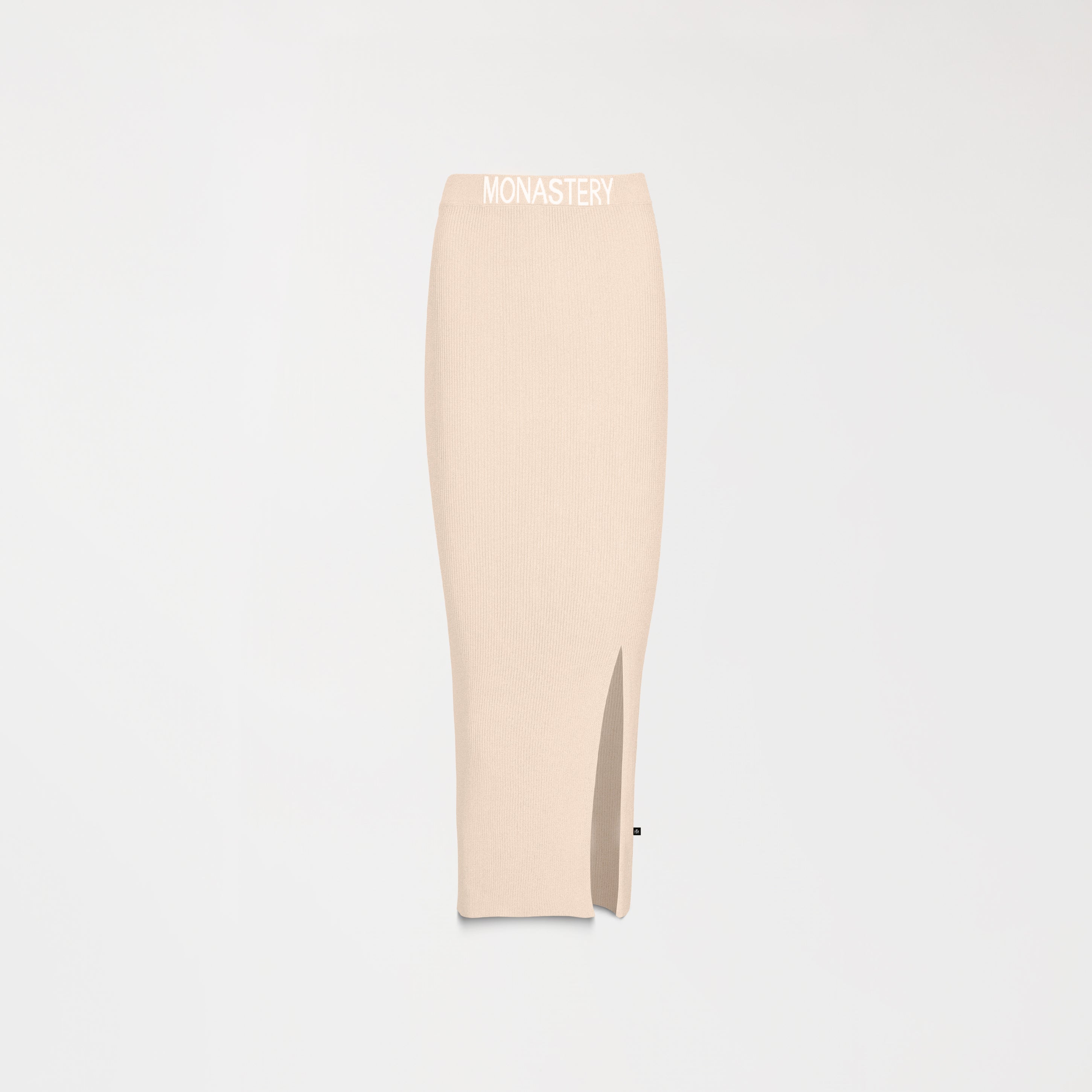 Feminine set featuring a sleeveless top and midi skirt, crafted in ribbed fabric with a soft touch and a structured look. The top features a straight silhouette with a high neck and a metallic appliqué on the front that adds a subtle touch of shine. The straight-cut skirt includes a discreet side slit and a waistband with the MONASTERY brand name in contrast, highlighting the garment's character. Ideal for a stylish casual look or to elevate a minimalist outfit.