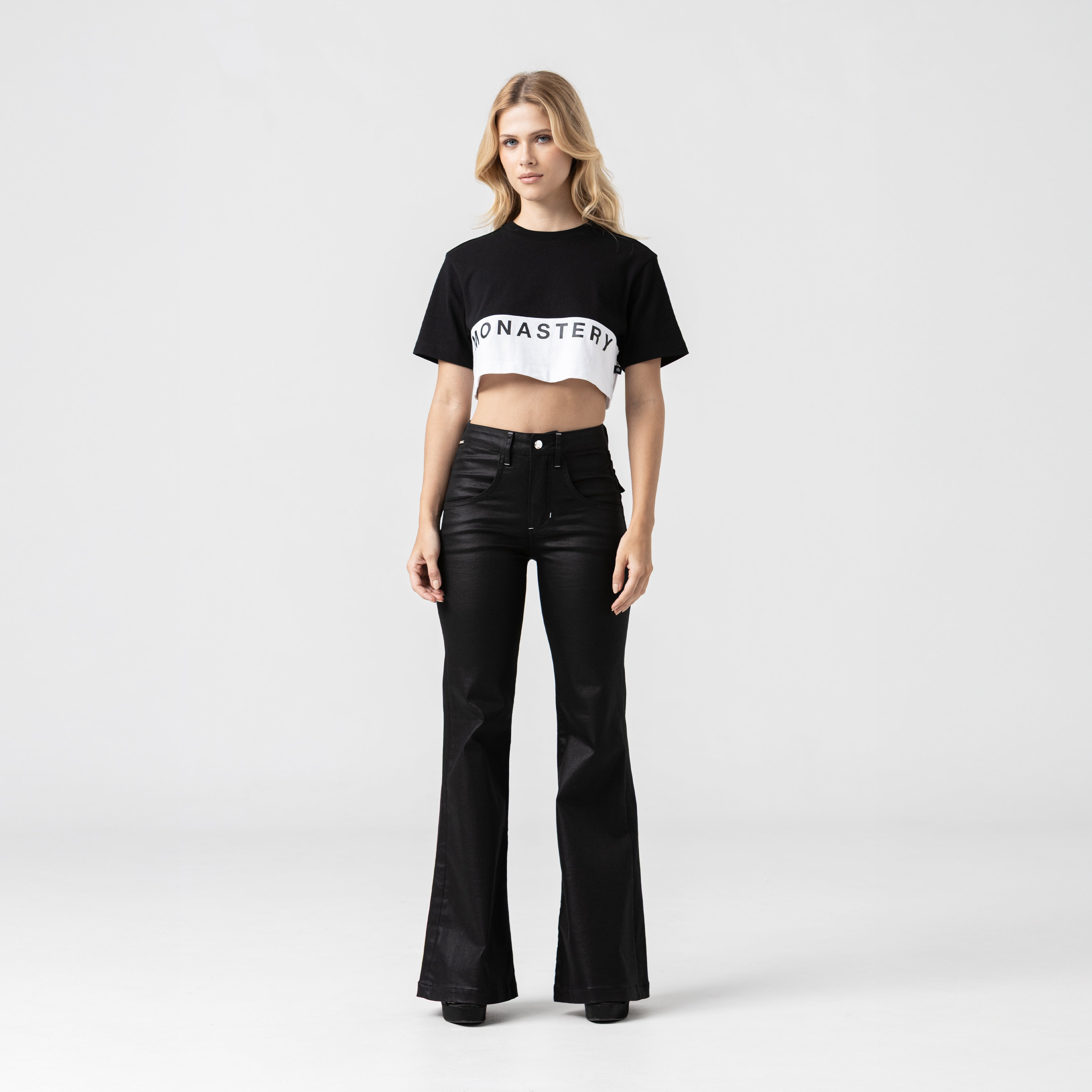 Women's crop top in Peruvian cotton exclusively for Monastery, crafted in a petite silhouette, featuring a cut-out at the front at the waistline, the iconic Monastery logo printed flat below the cutout, and insignia logos printed flat on the back. Arwen is a dynamic garment that brings elegance and versatility to your wardrobe.