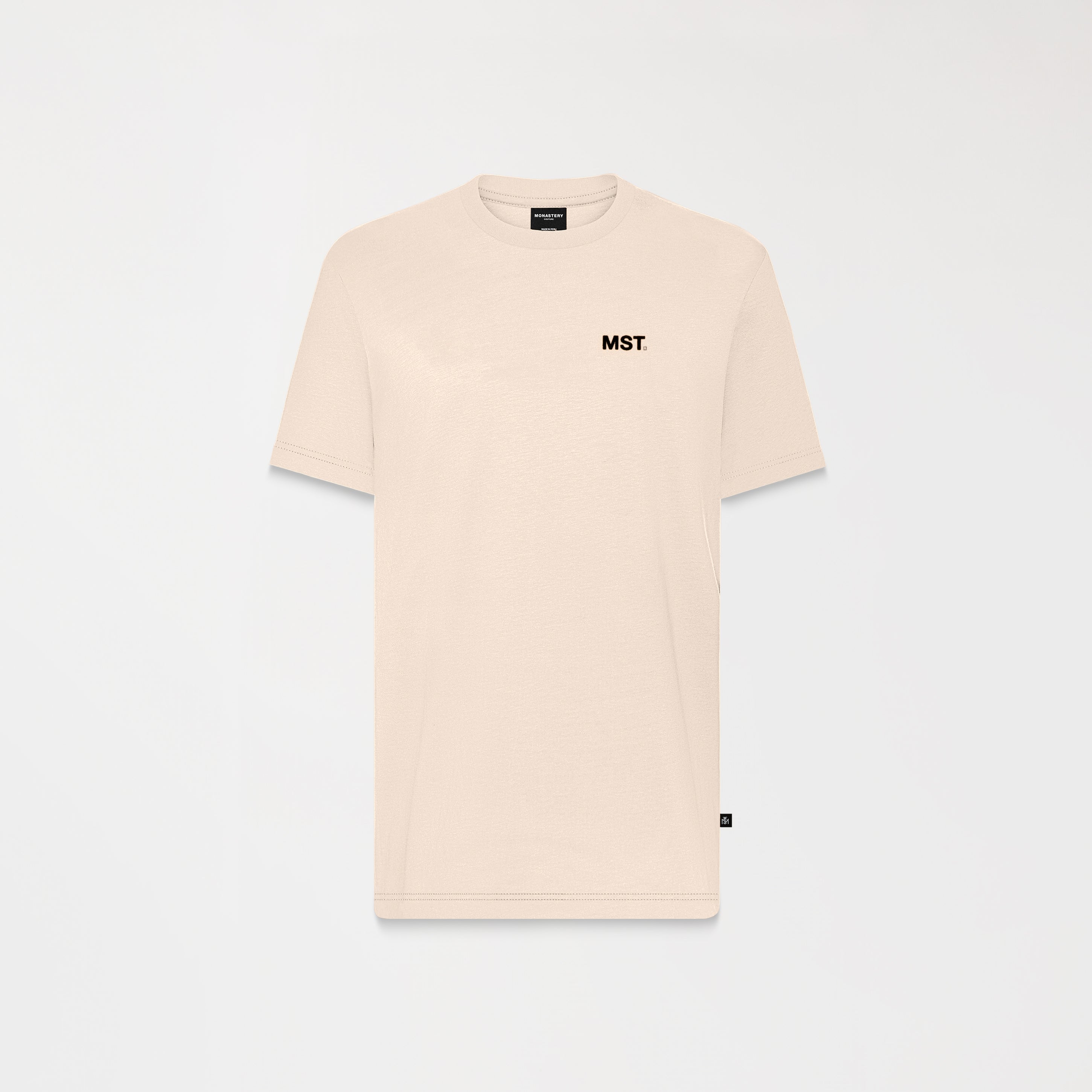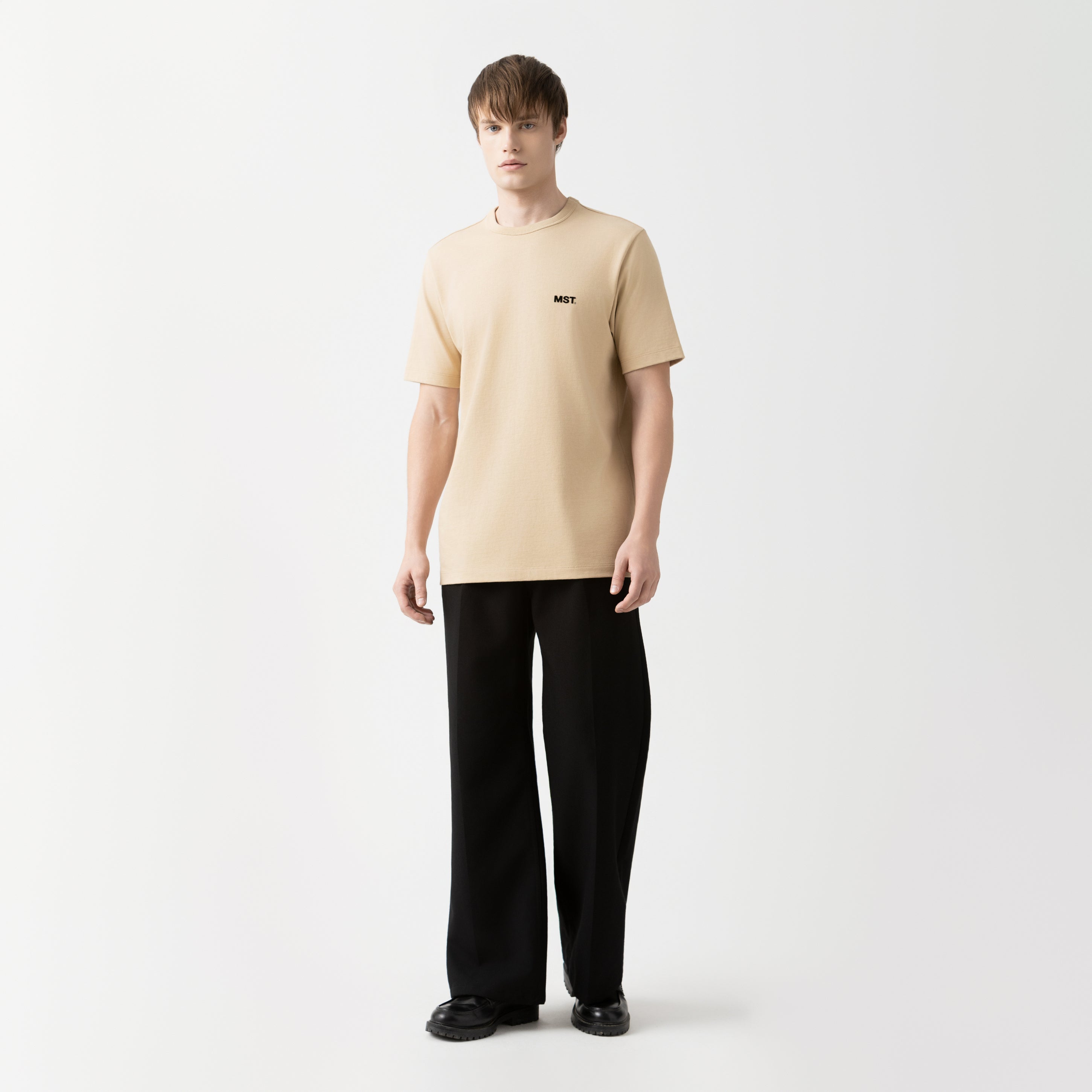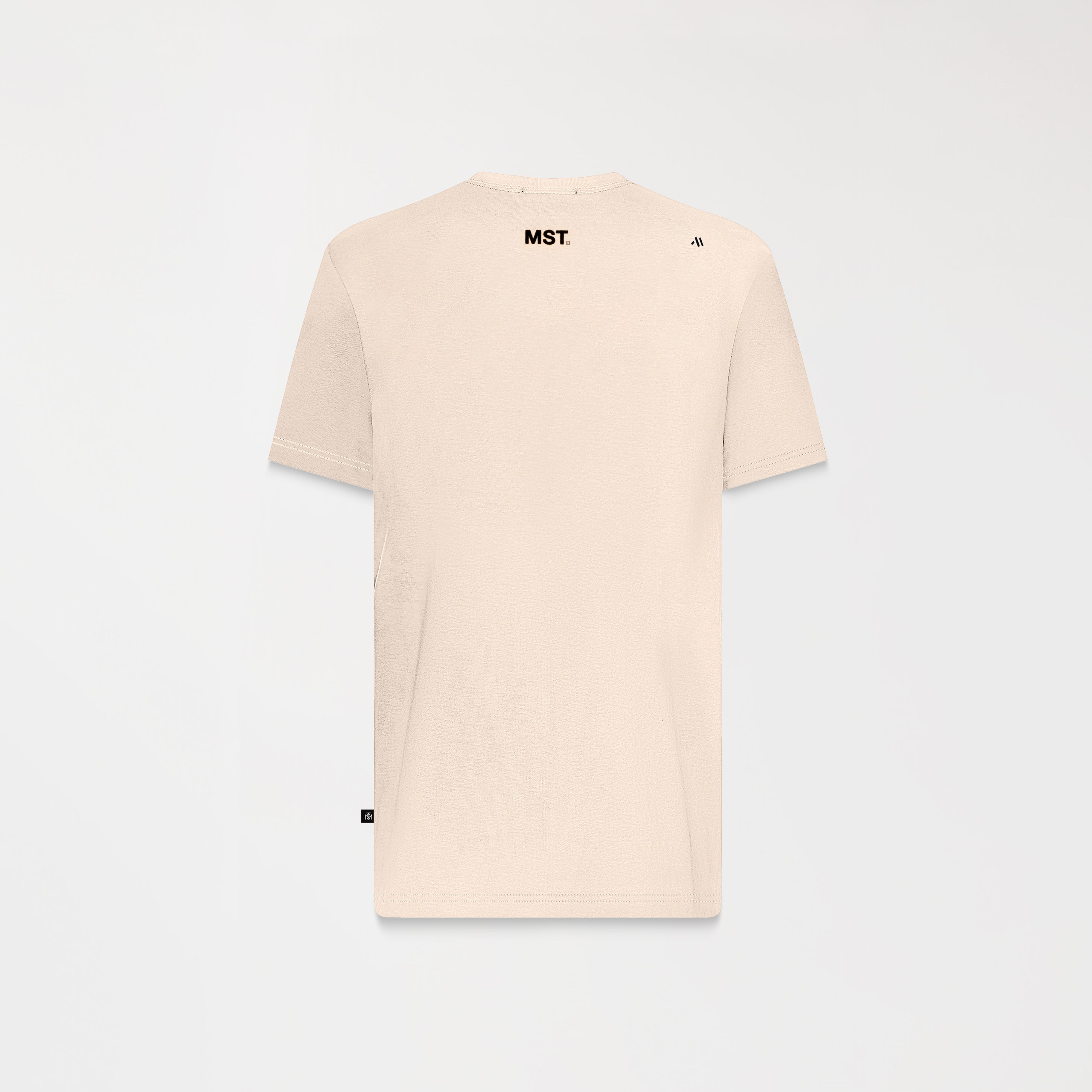 Atwood is a men's t-shirt made from 100% high-quality, ultra-silicone-coated cotton, treated to provide a soft-touch surface. The MST logo is applied using the flock technique at the heart, achieving a high-relief velvety finish. The back features a composition of the brand's traditional logos, also developed using the flock technique, which unifies the texture and provides visual coherence to the design.