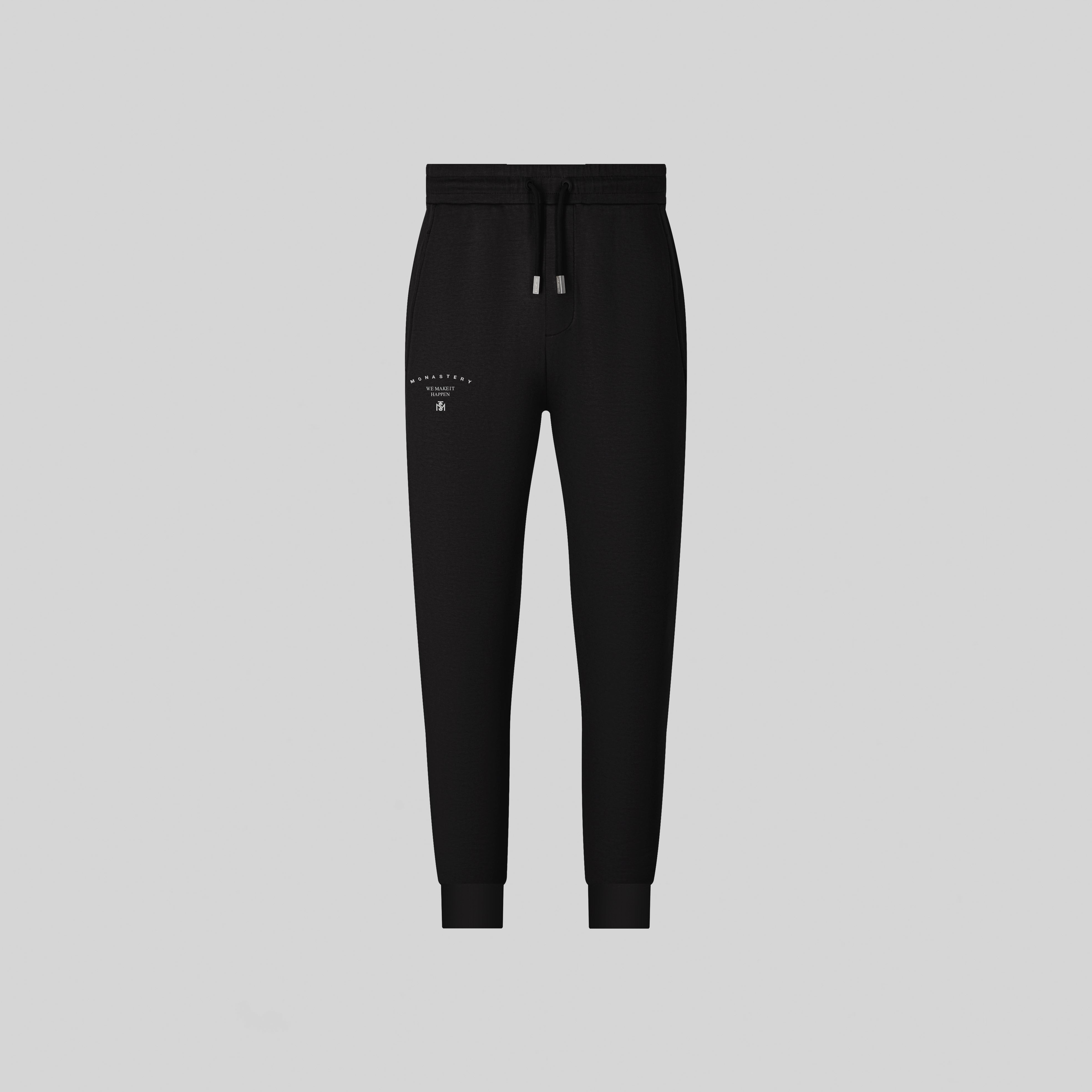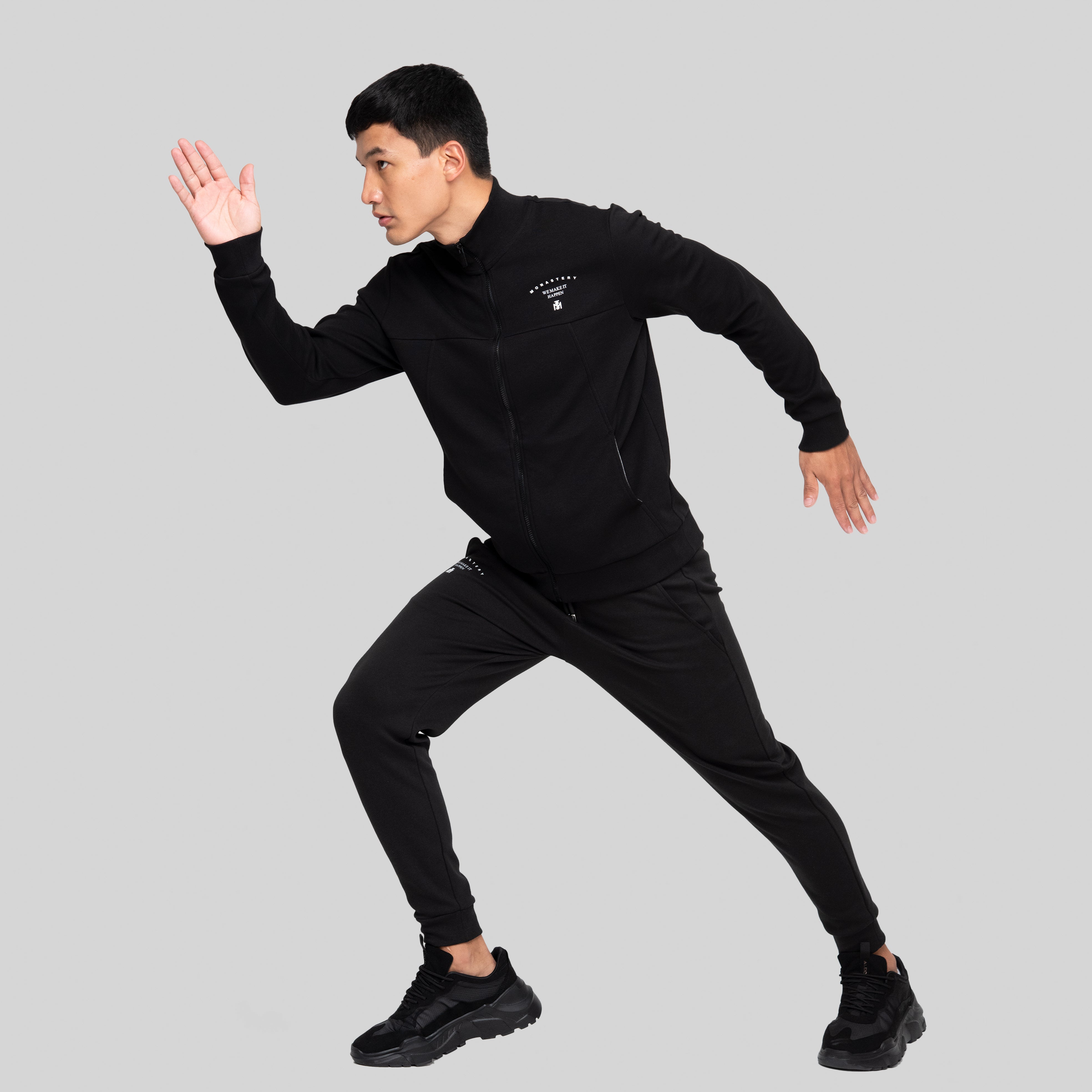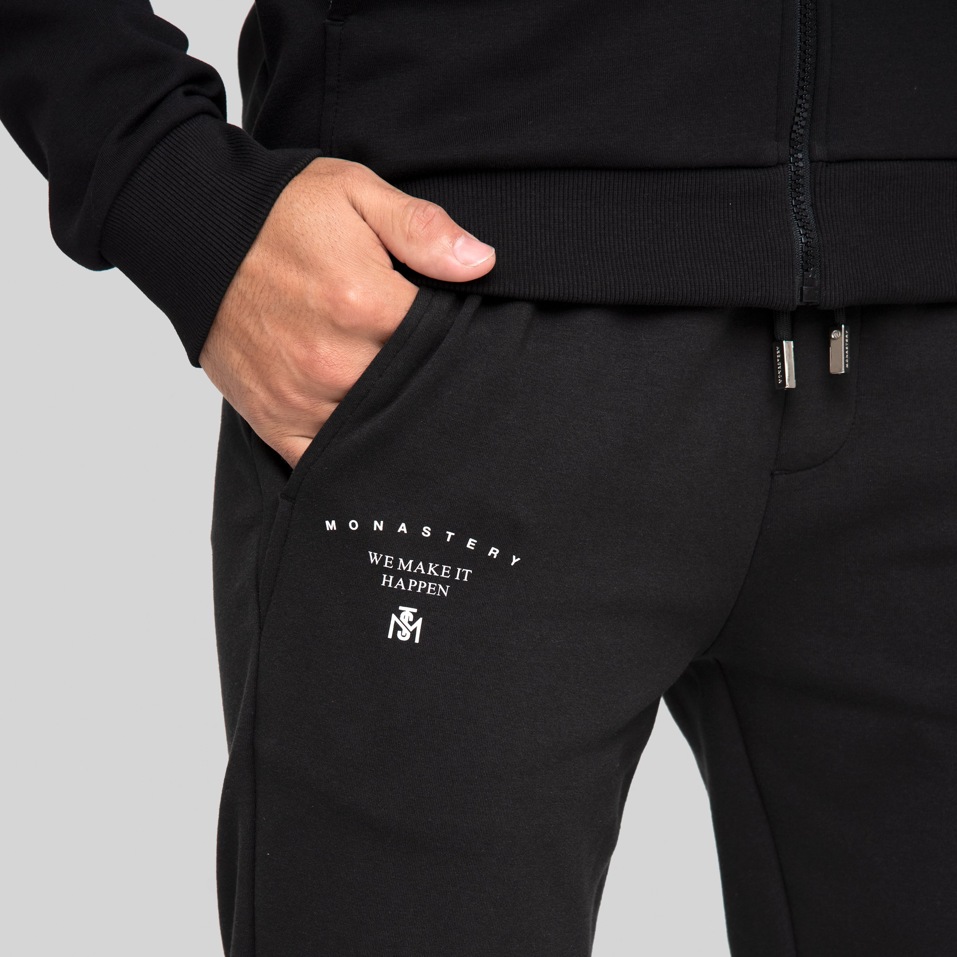 Men's sporty set, produced in double face knitted fabric. This set features the text "Monastery" and the slogan "We Make It Happen" printed in contrast, adding a distinctive touch to the garment. The cuffs, collar, waistband and waistband are rib knitted in the same colour as the artwork, adding a unique and elegant style to the garment.