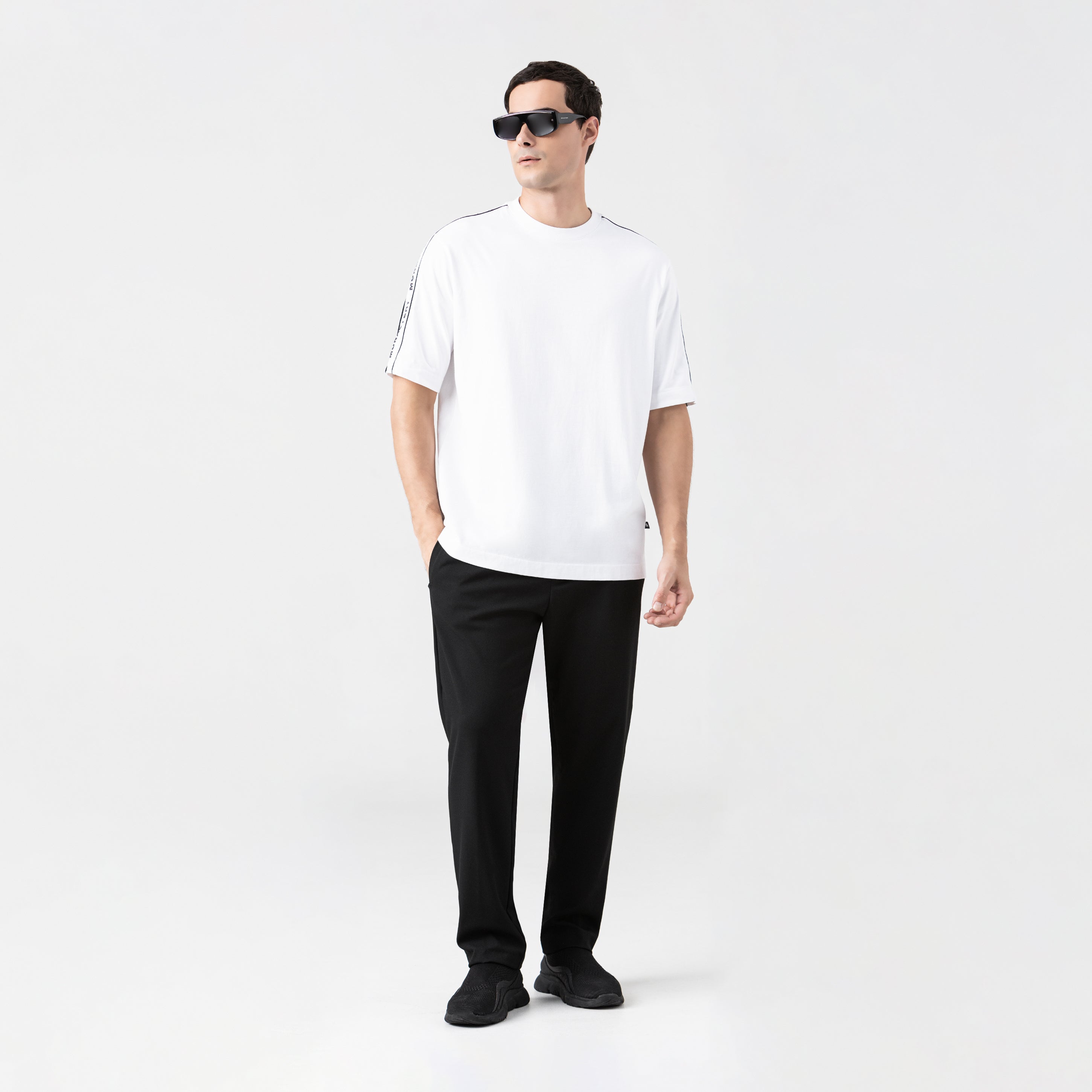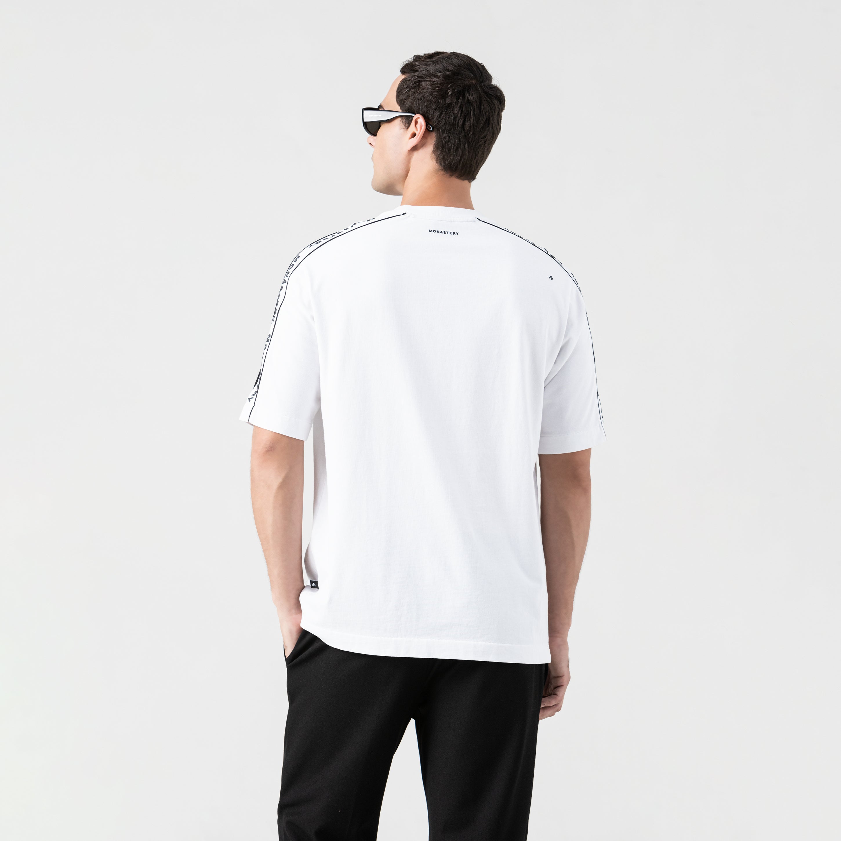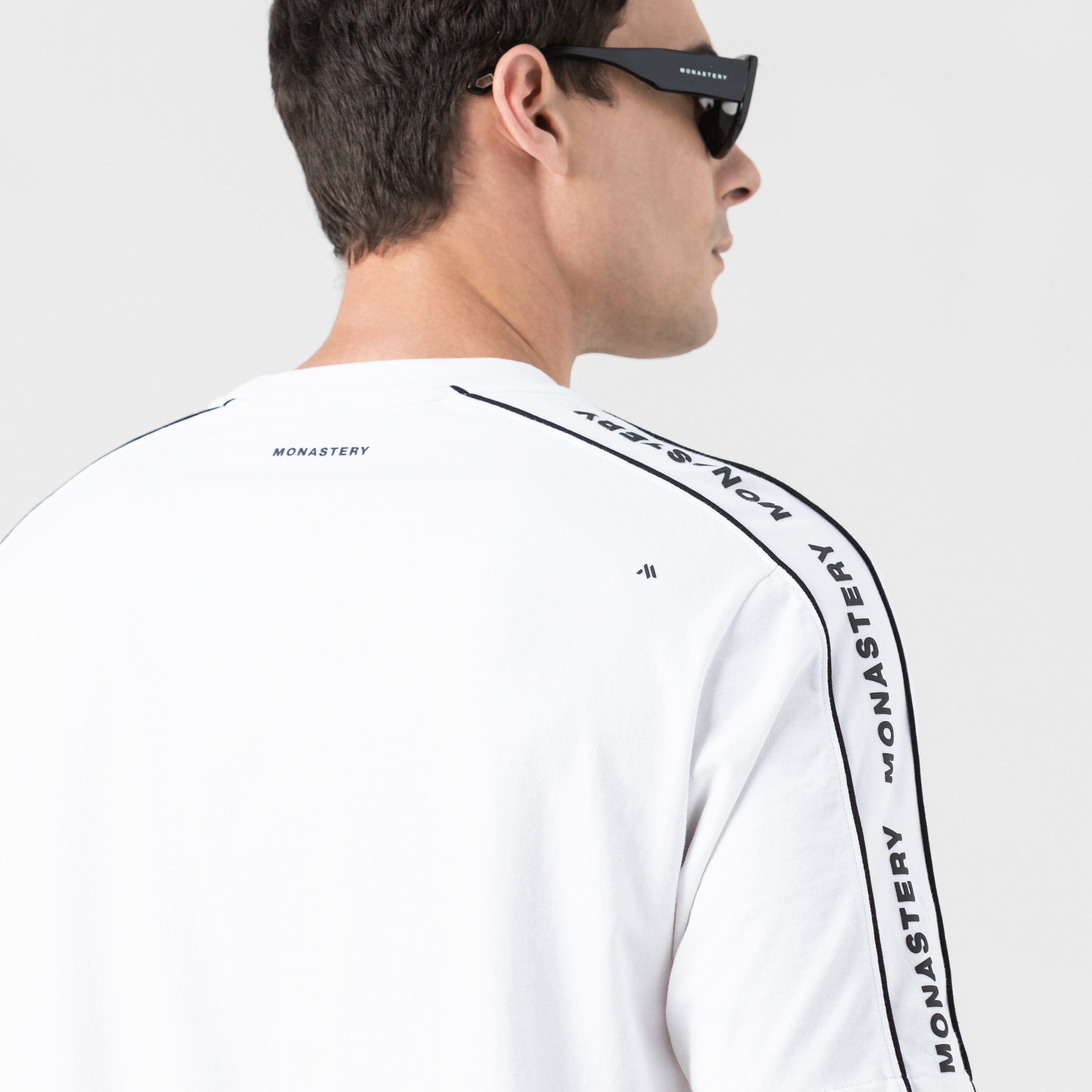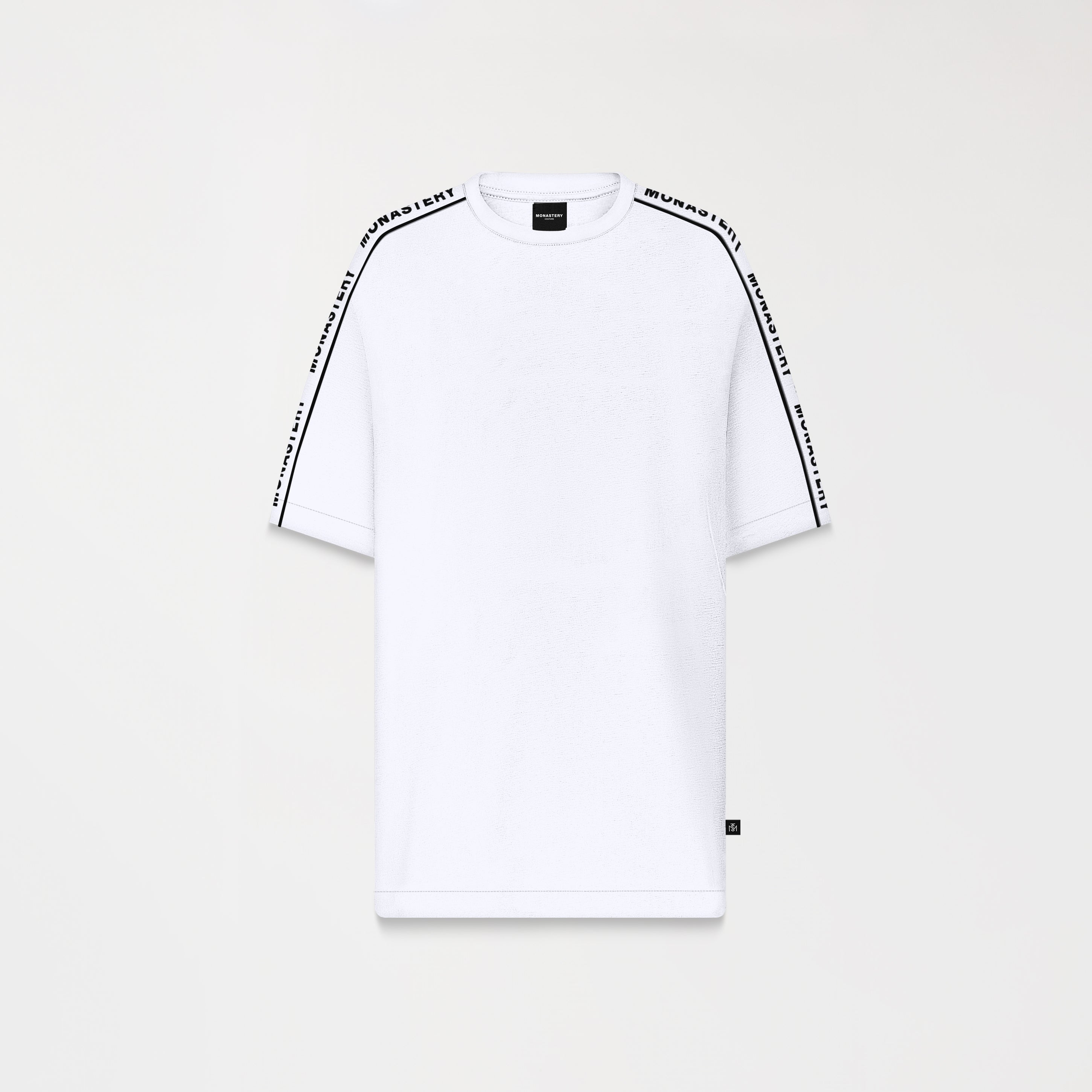 The oversized Monastery fabric T-shirt is a statement of control and millimetric design. Crafted from Monastery fabric, this oversized fit T-shirt redefines the codes of minimalism through its construction. Its 2.5 cm ribbed collar marks the starting point of a deliberately wide silhouette, offset by a sleeve cut that provides structural tension. The signature detail: a vivid contrasting bias, which traces a precise and visually disruptive line, like a clean incision on a perfect surface. It's a piece for the man who understands that true luxury lies in the details.