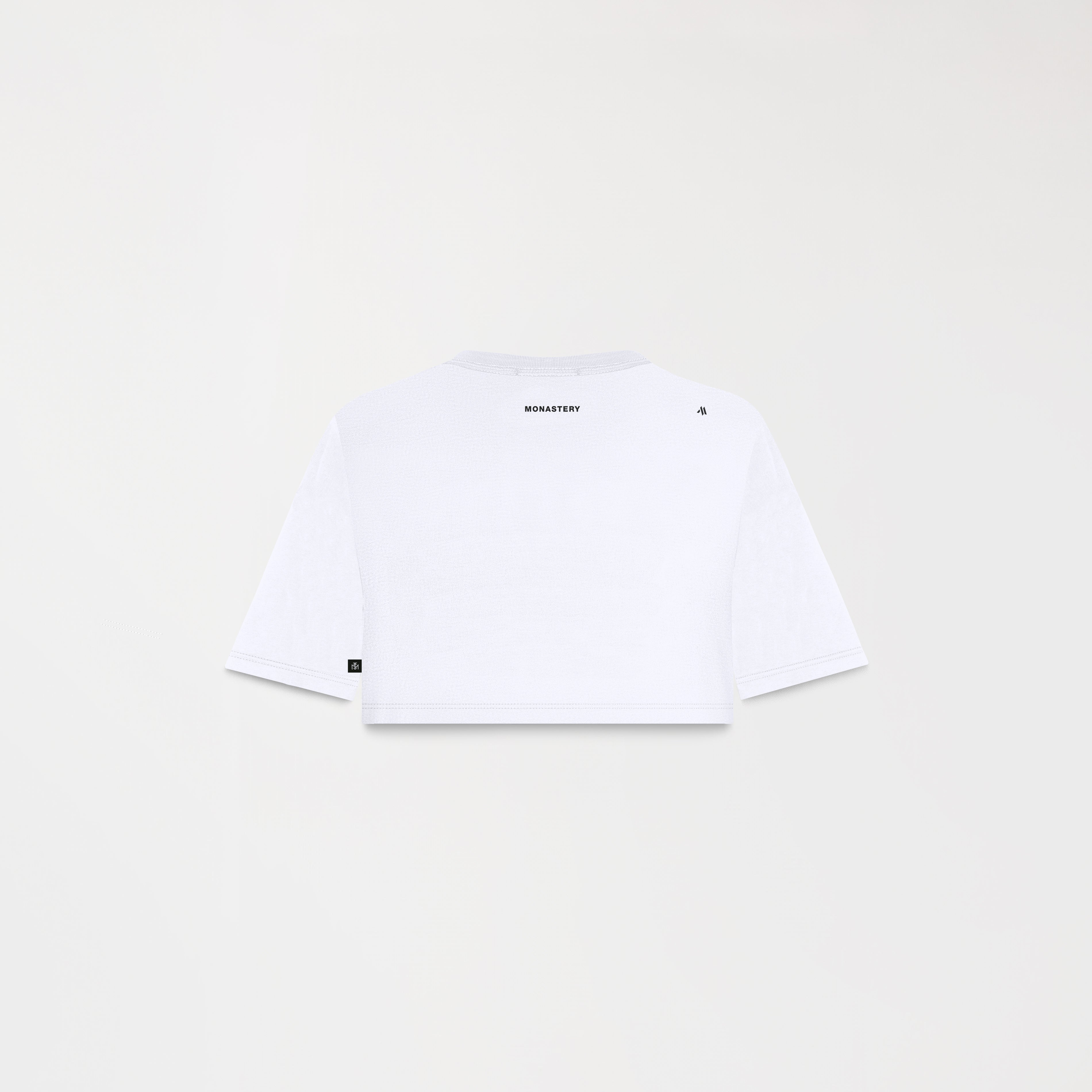 Small Silhouette Crop Top with Monastery logo on the front, made using a flat print technique for a clean and defined finish. The back features traditional logos printed using a high-density technique, providing texture and durability. Bret is made of high-quality Peruvian cotton, ensuring softness, durability, and comfort.