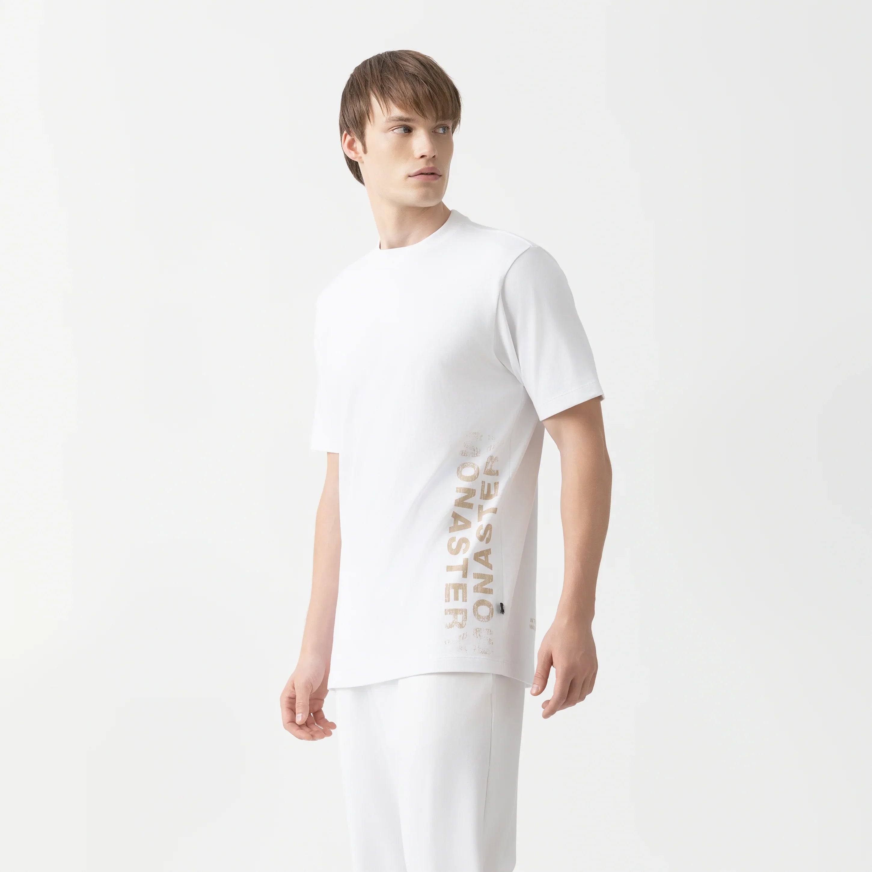 Clint is a men's regular-fit T-shirt made from Monasterio 2 fabric, a high-quality cotton that combines softness and structure. Its design includes a ribbed collar for a clean and durable finish. On the front and back, the prints, applied using a corrosion technique, create a distinctive visual effect that adds character and a modern touch. A versatile garment with its own personality, ideal for those who appreciate distinctive details in essential wardrobe pieces.