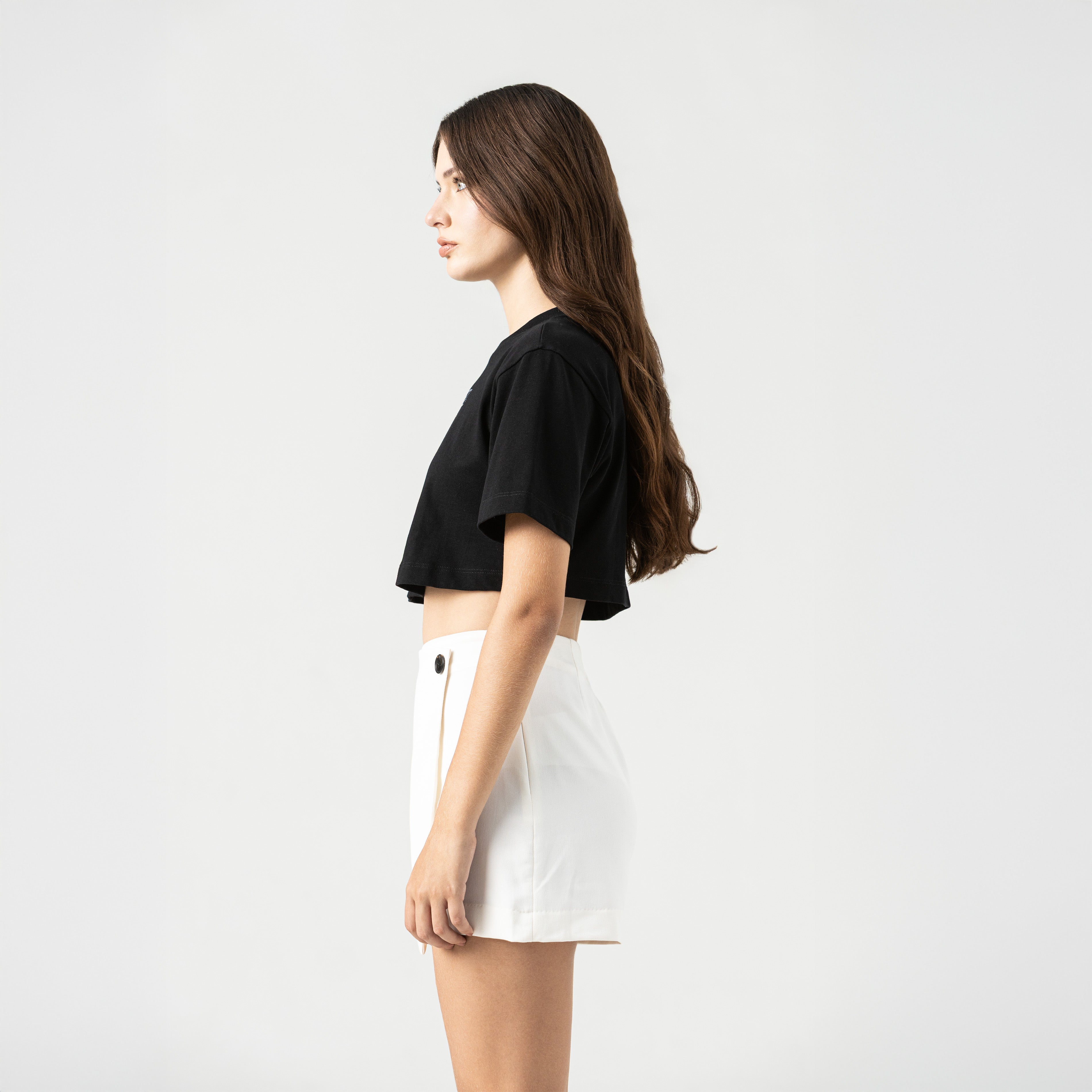 A crop top with a small silhouette featuring MST artwork on the front using a high-density brush technique, a design that adds texture and relief. The back features traditional logos in flat plastisol, achieving a balance between originality and classic style. River is a design made from high-quality Peruvian cotton, ideal for an urban look with personality.