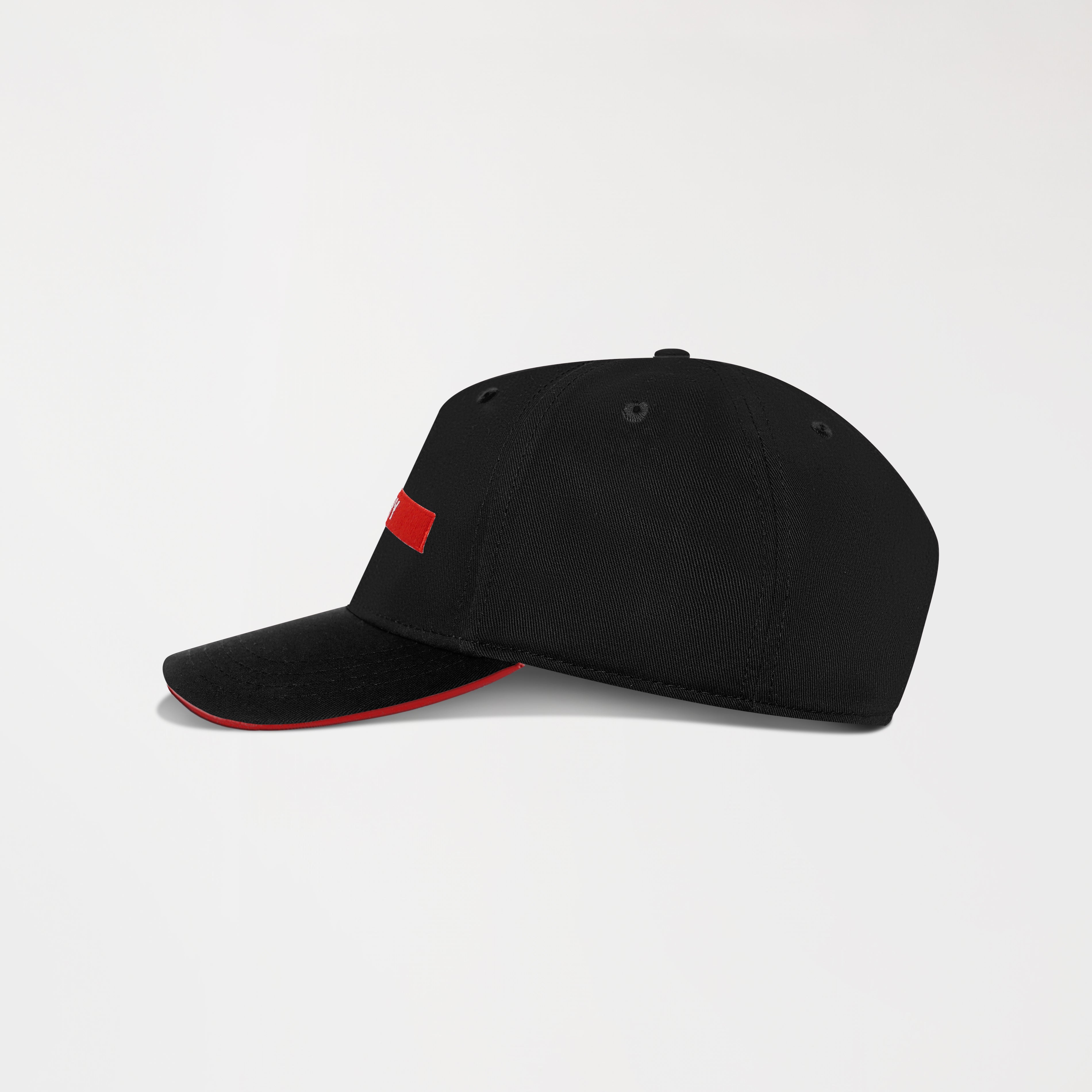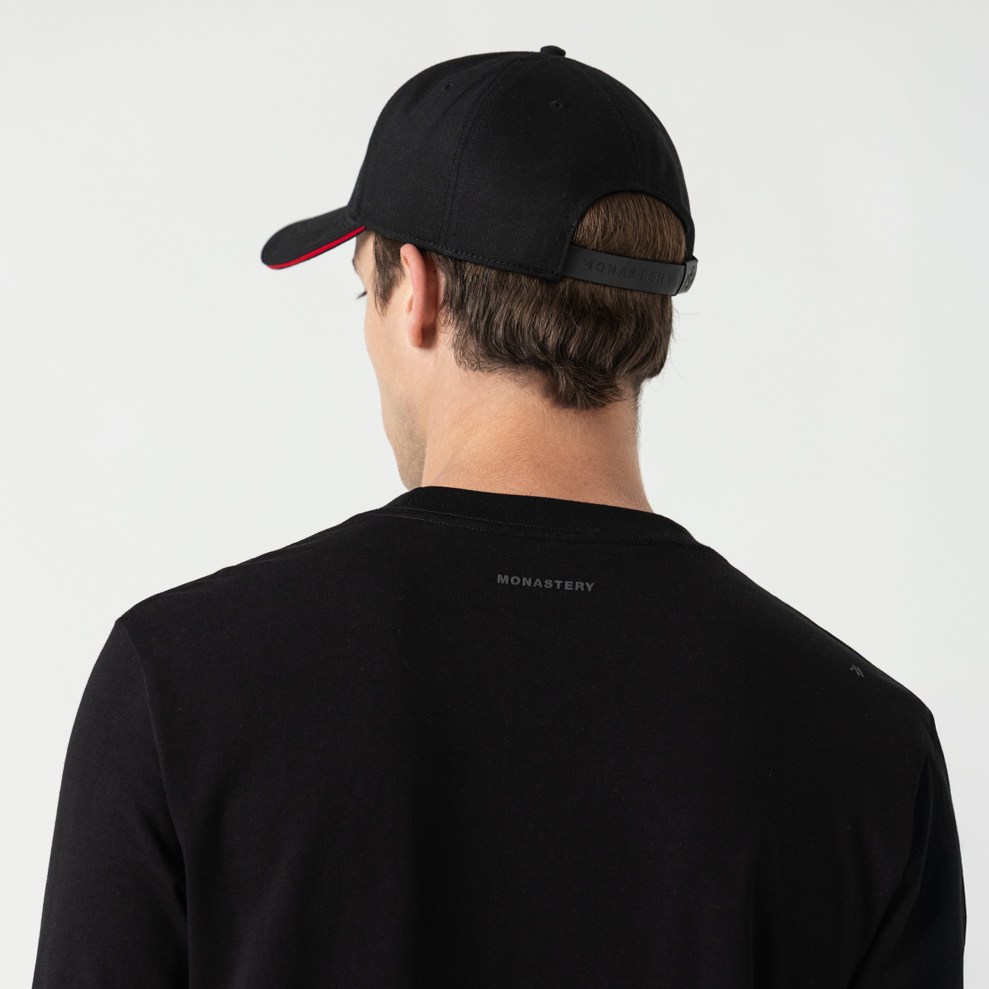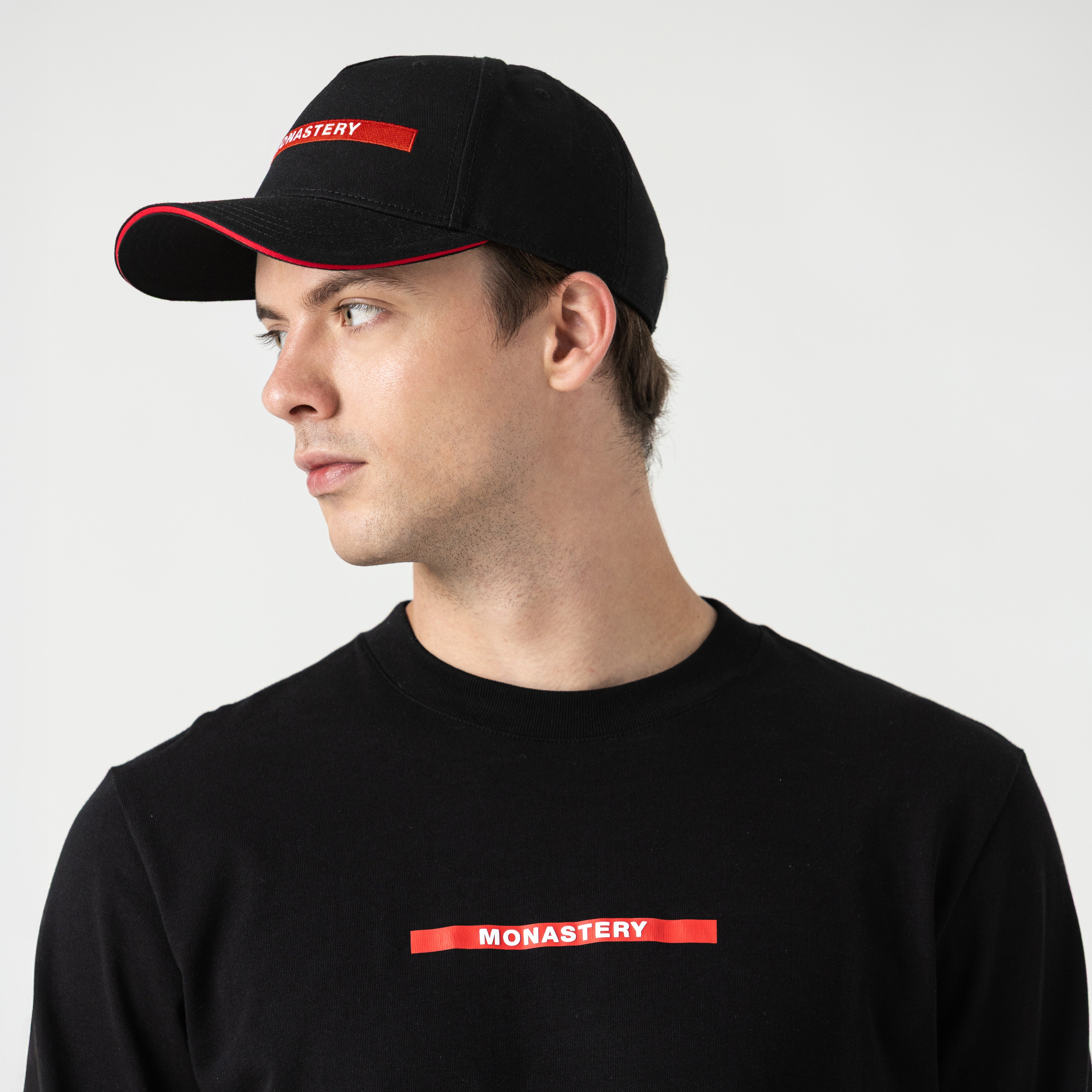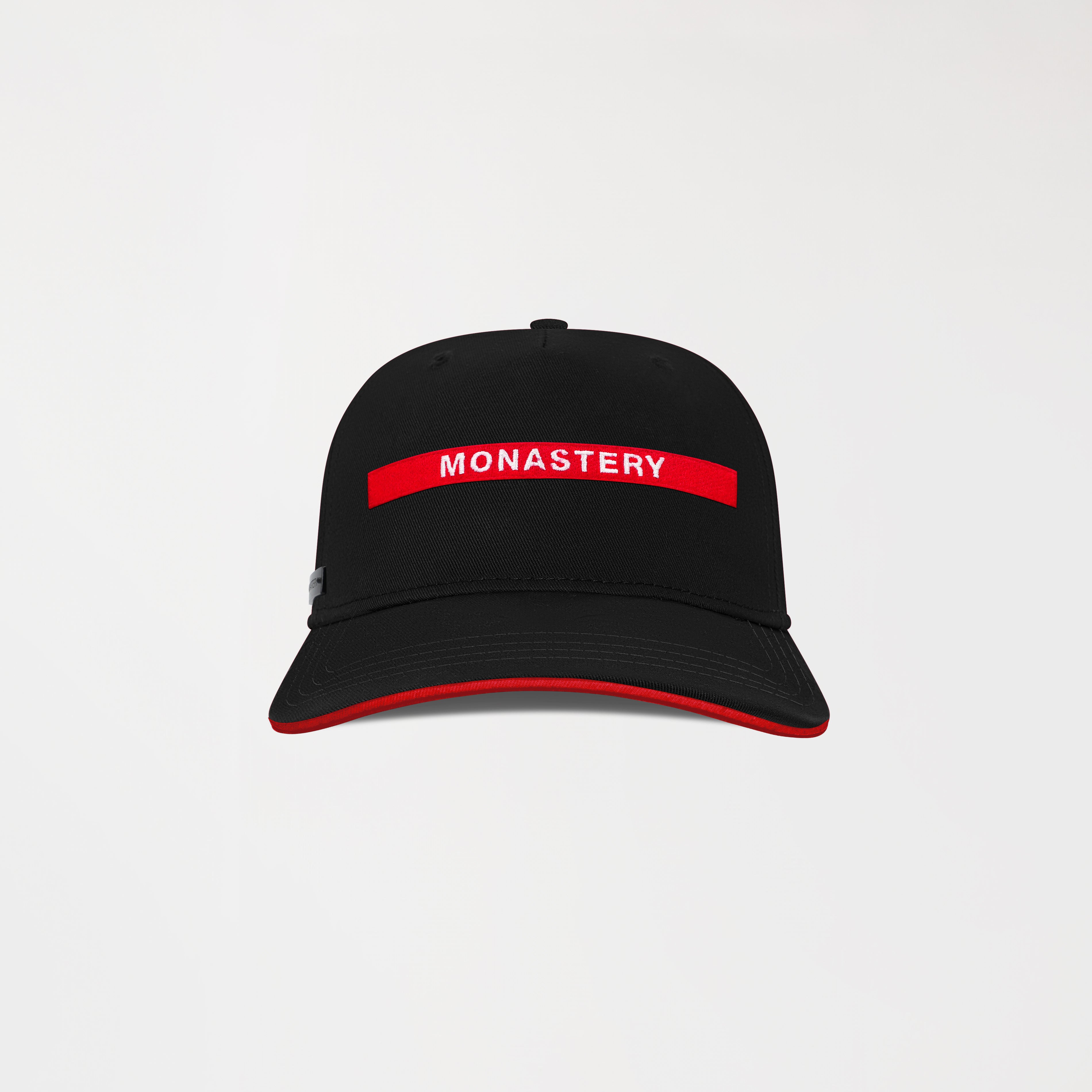 Cap made of cotton twill featuring the monastery text embroidered in flat-effect thread in white with a red background that matches the collection. On the side panel, it features a metallic appliqué. The back panel features a traditional closure system in top-quality bovine leather. This piece will add a finishing touch and enhance all your looks, making it perfect to combine with other creations in the collection.