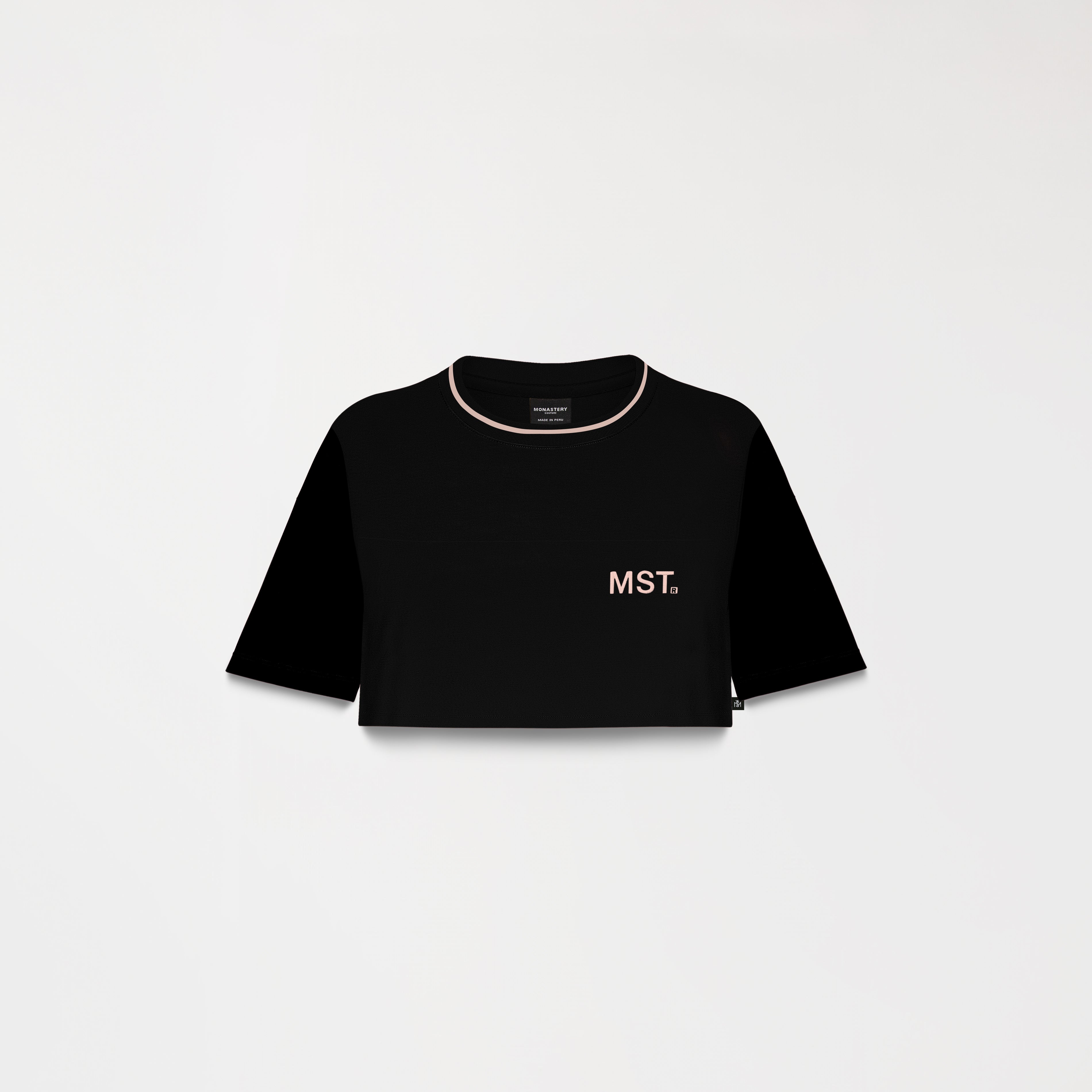 Women's 100% cotton crop top exclusive to Monastery, made in a petite silhouette, Elden features a heart stitch embroidery of the iconic MST logo, which adds a relevant touch of the brand identity, this reference has a straight knit collar which is a versatile option, perfect to combine with a variety of outfits.