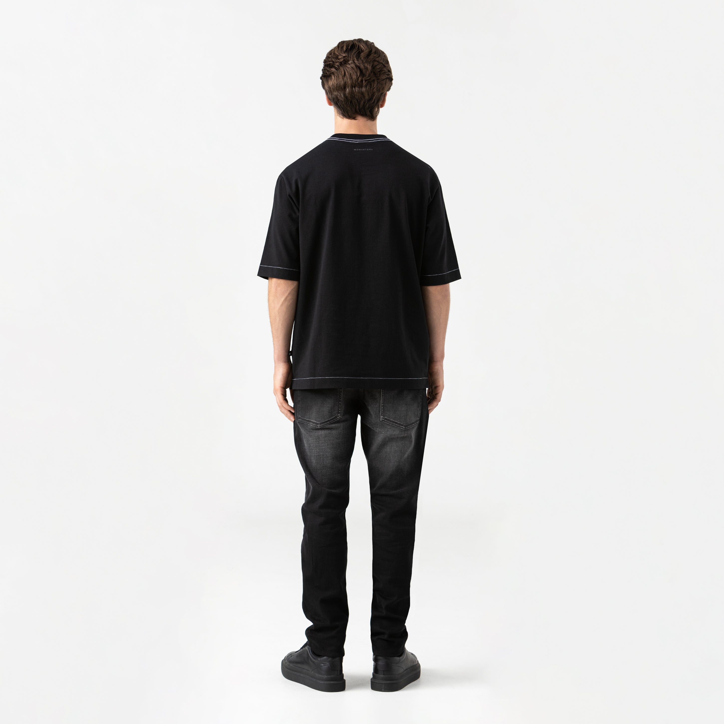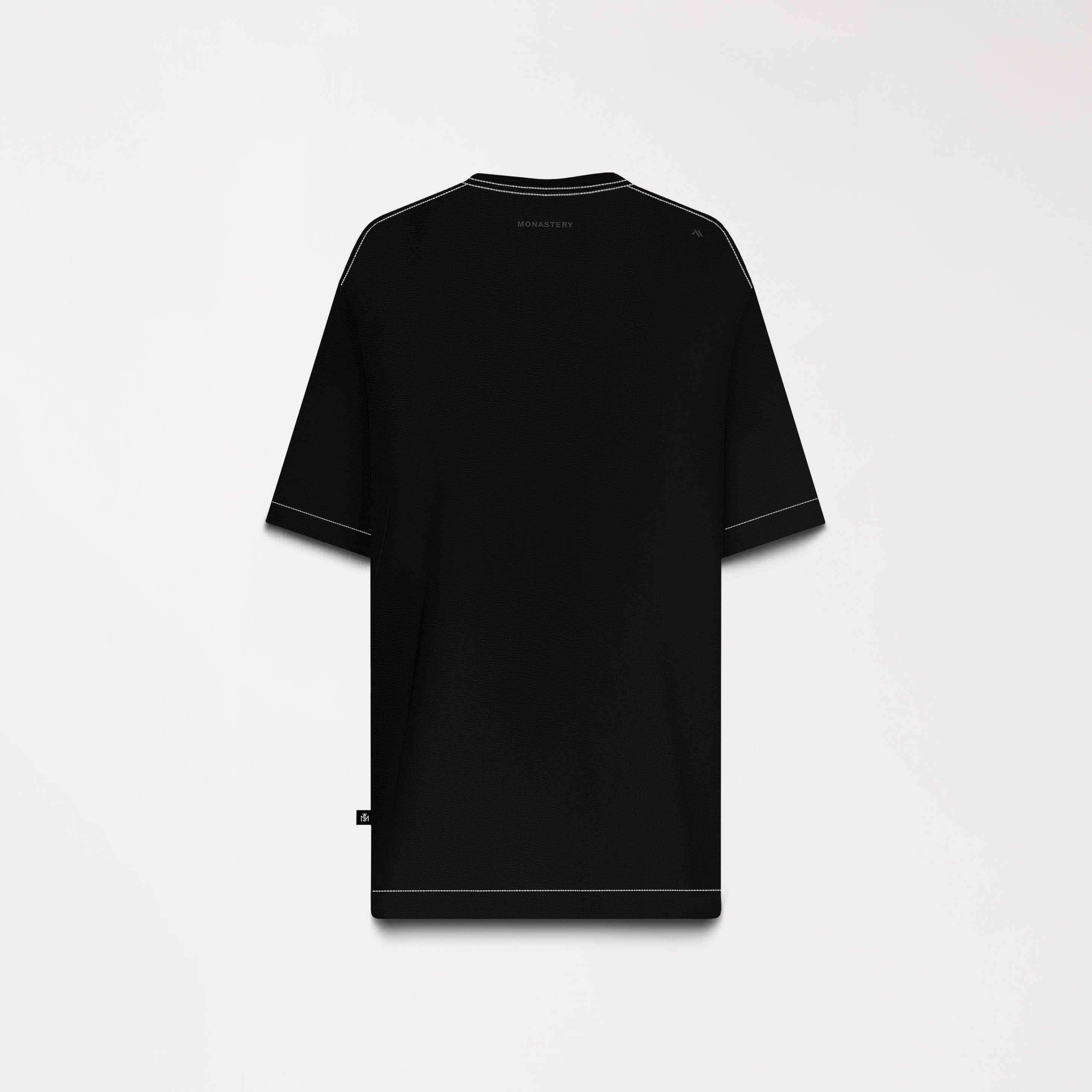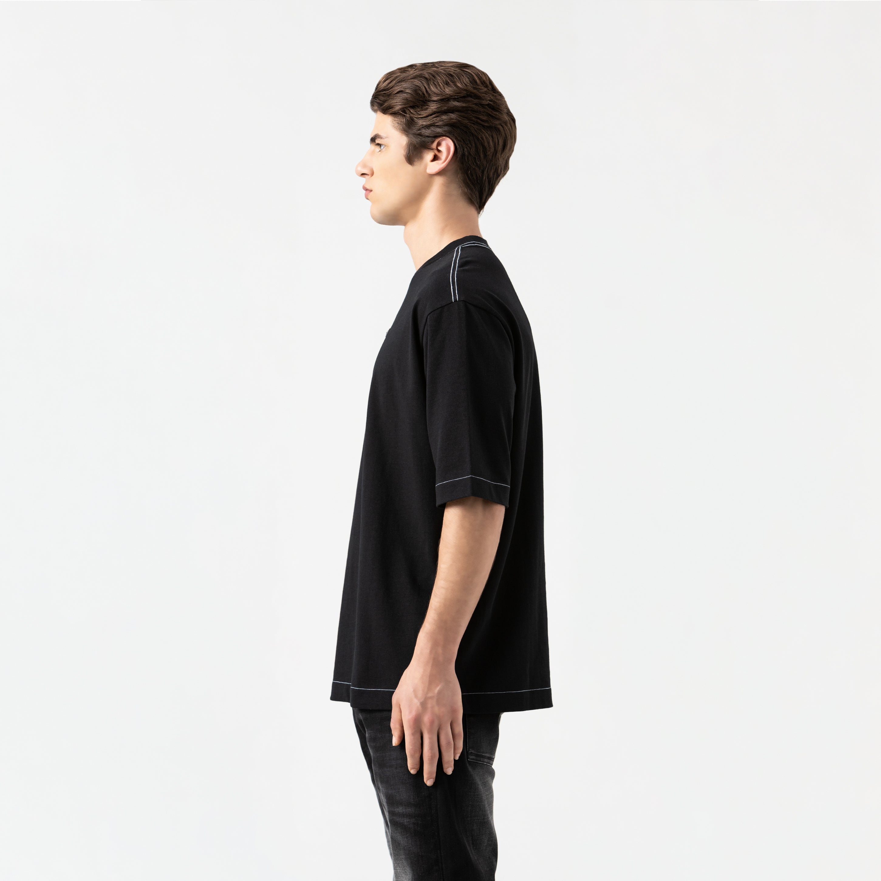 Eolo is a men's t-shirt. With an oversized silhouette, a 2.5 cm ribbed neckline, and crafted from the exclusive Monastery 100% cotton fabric, this t-shirt fuses functionality and design with character. The front features an appliqué for a contemporary, textured touch, while the back is enhanced with a high-density print for added dimension. Contrast stitching reinforces its modern aesthetic, and its availability in four colors allows you to express your style with versatility. A garment created to stand out, effortlessly.
