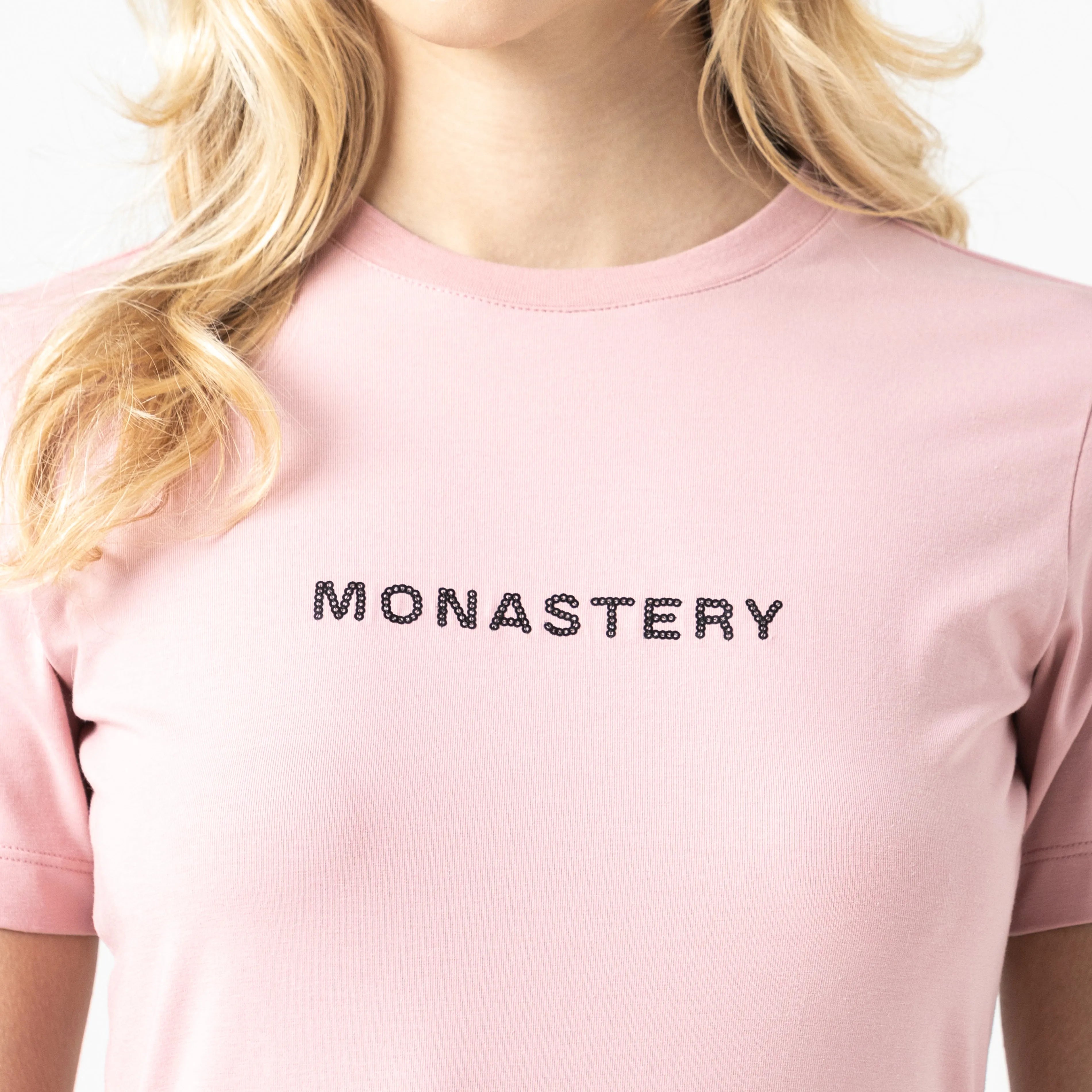 Women's t-shirt, made of premium cotton with elastane for greater comfort and freshness. This item has a fitted silhouette, highlighting the feminine figure, with artwork of our Monastery logo, using a contrasting sequin technique, giving it texture and dynamism. It is accompanied by the classic tone-on-tone logos on the back, making this item a versatile and dynamic garment, ideal for everyday wear.