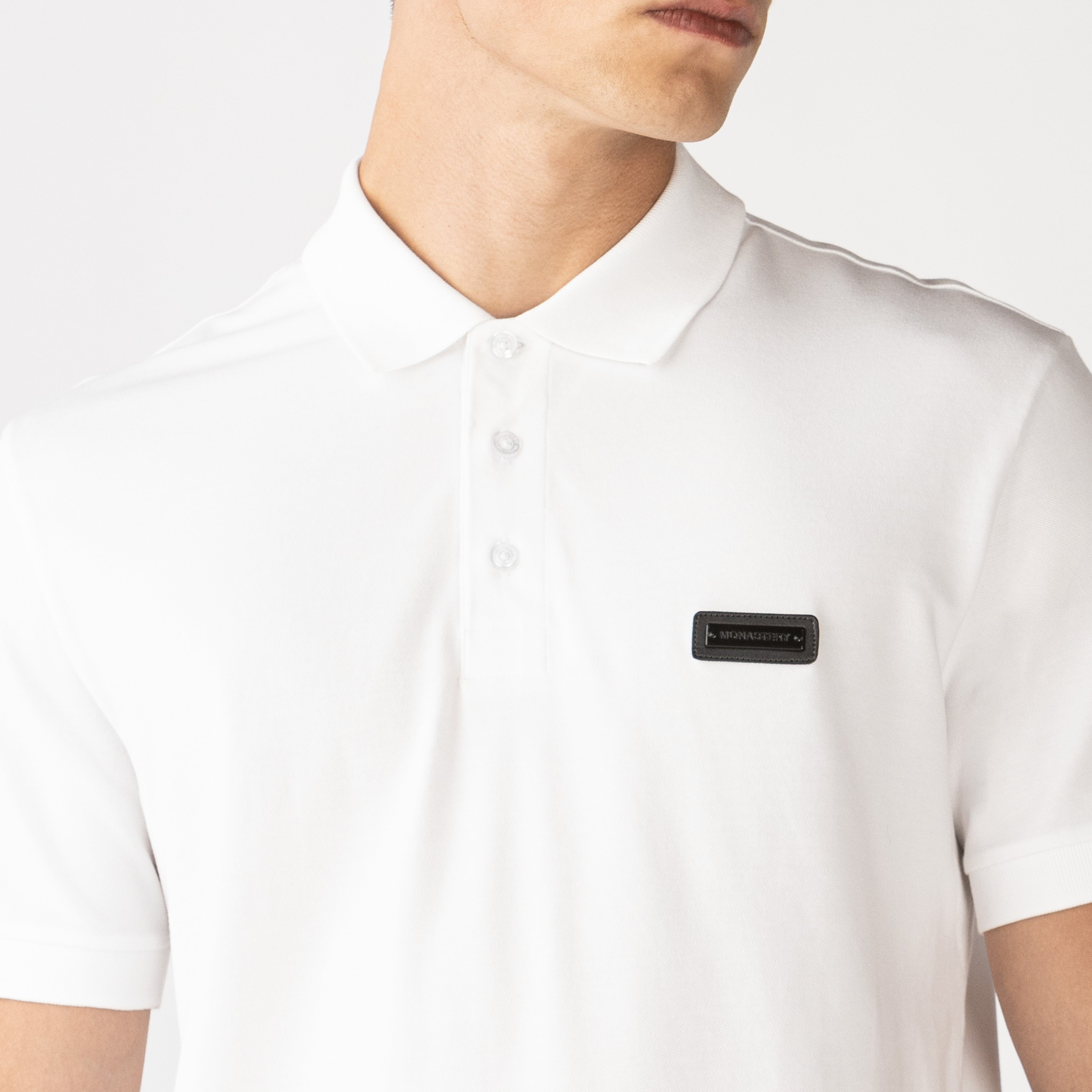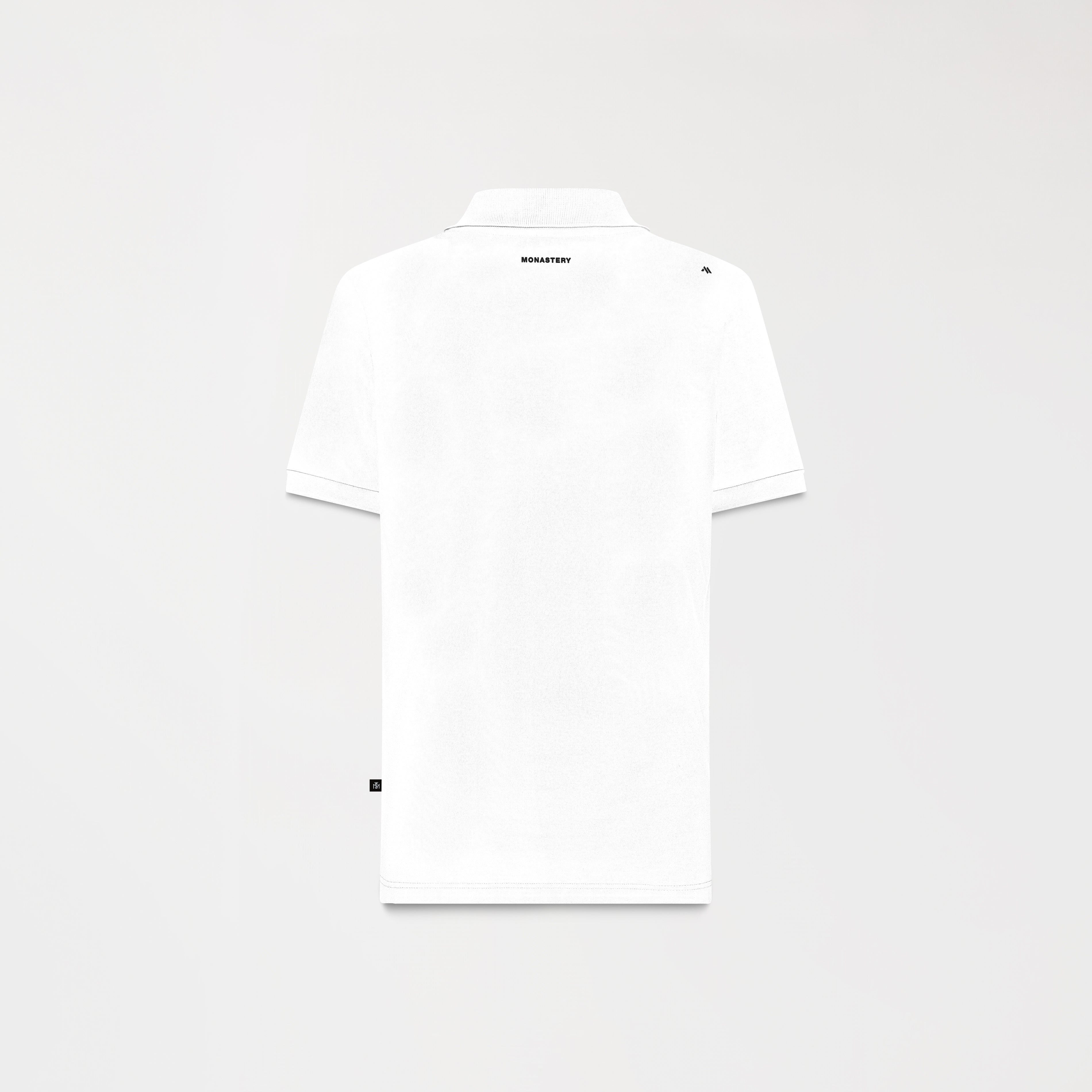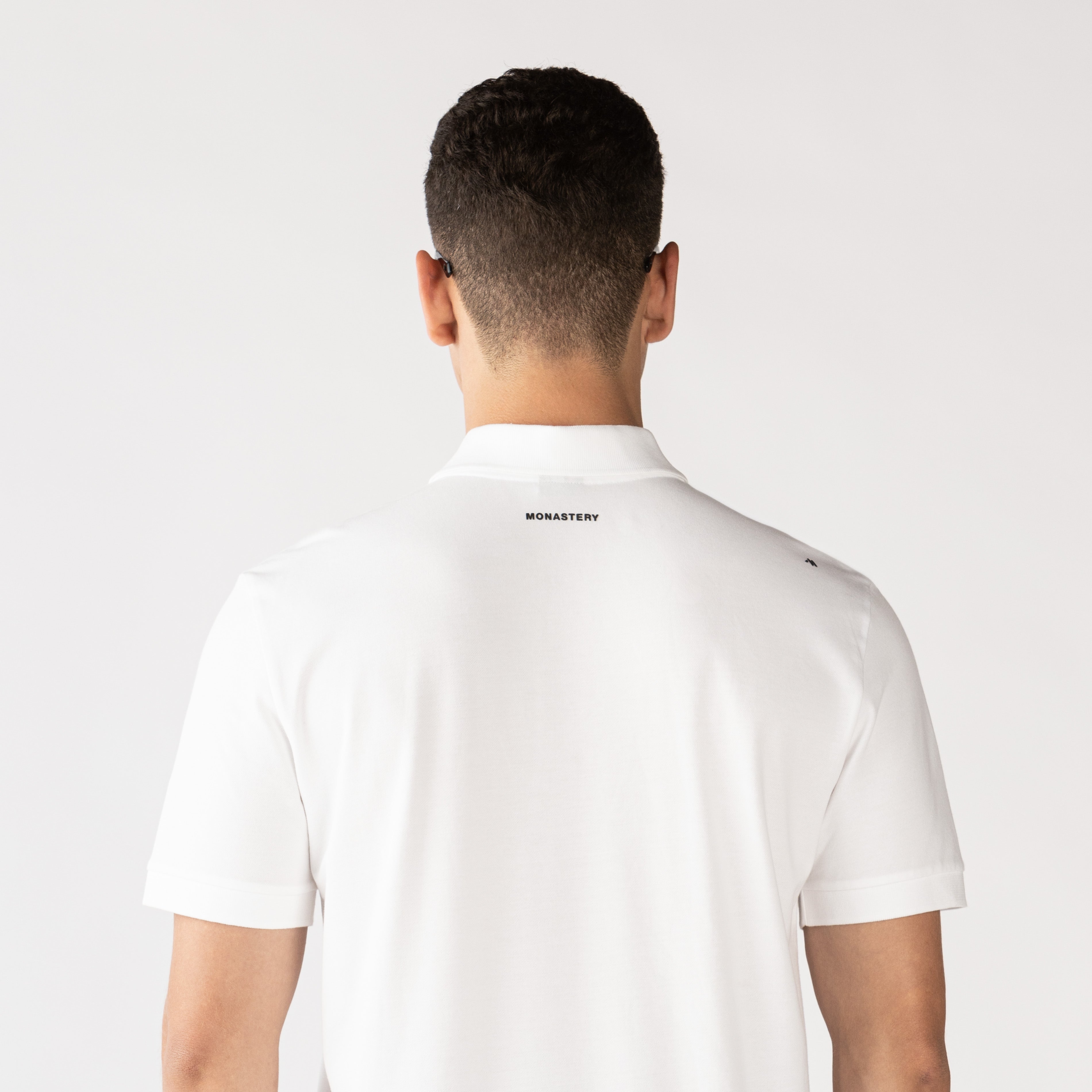 White men's polo shirt, made in high quality pique pima exclusive to Monastery, this elegant polo shirt features a distinctive heart stitch applique that adds a unique and sophisticated touch. The design includes knit collar and cuffs that provide a polished finish, while the details on the back are made with high density, stand out for their exclusivity. Ideal for those looking for a modern and refined style.