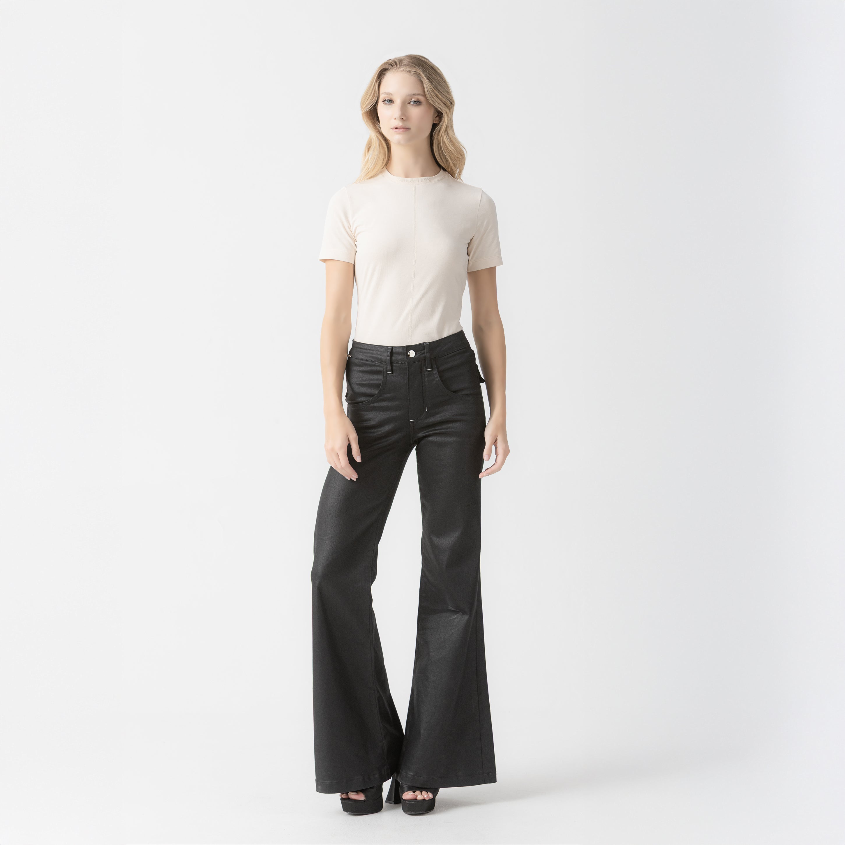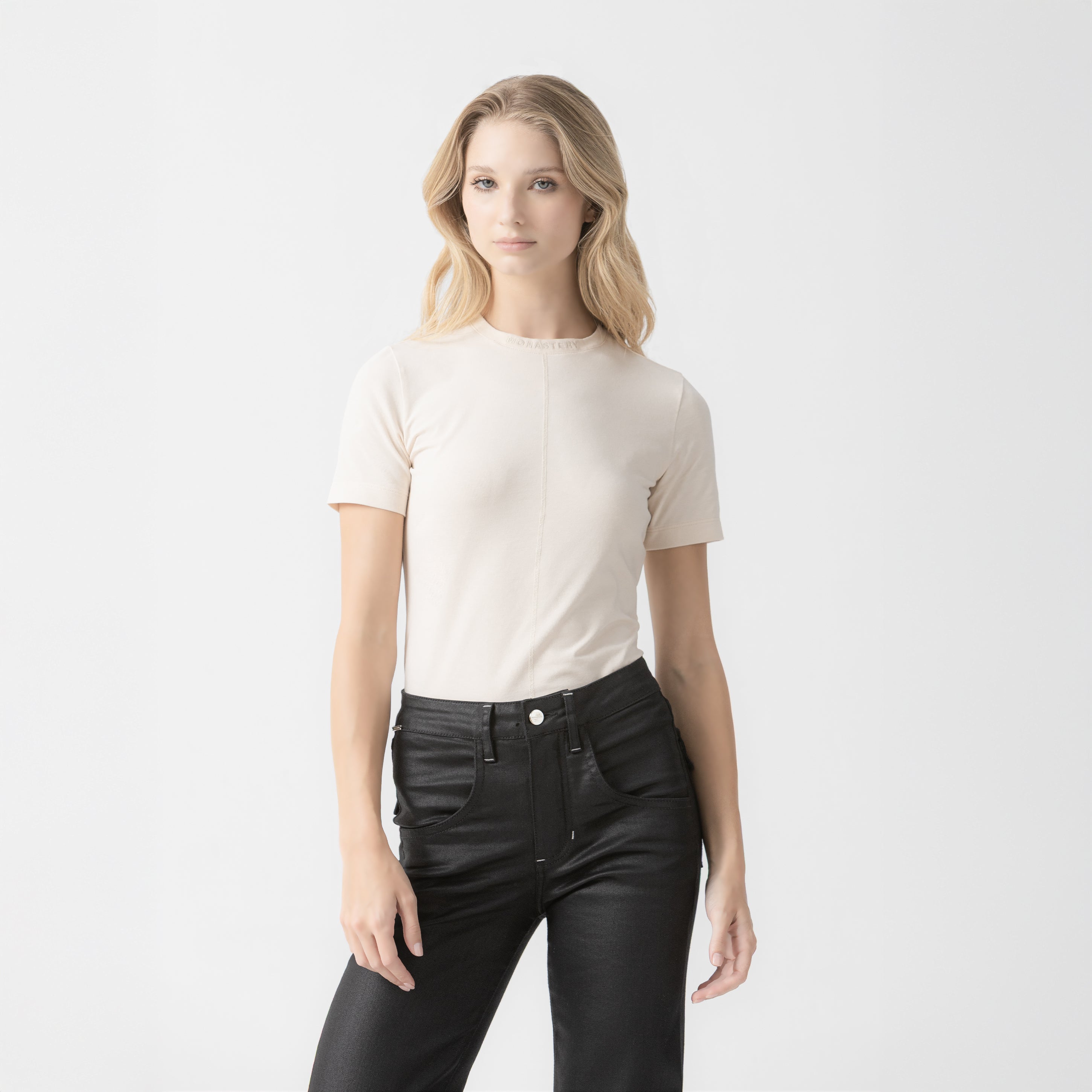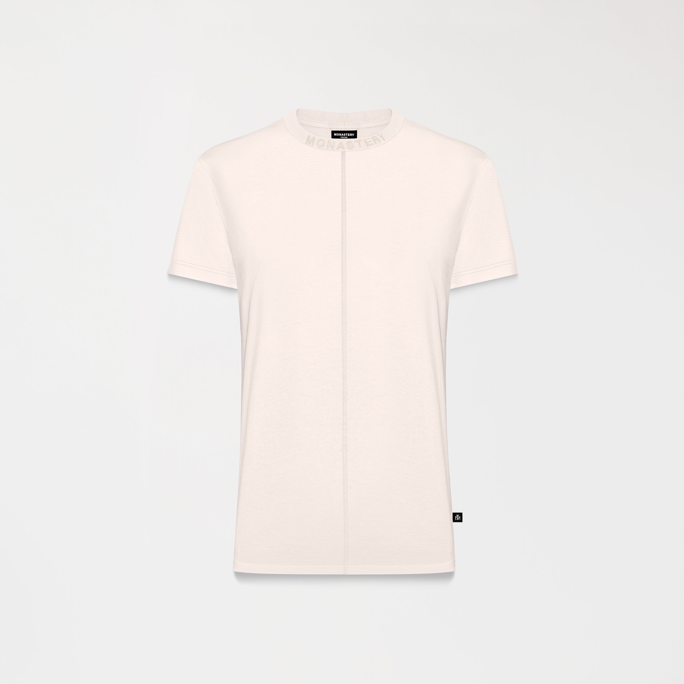 At the neck, a flat, tone-on-tone embroidery adds a subtle and refined detail, while on the back, a flat, tone-on-tone print reinforces the minimalist and sophisticated aesthetic characteristic of the brand.