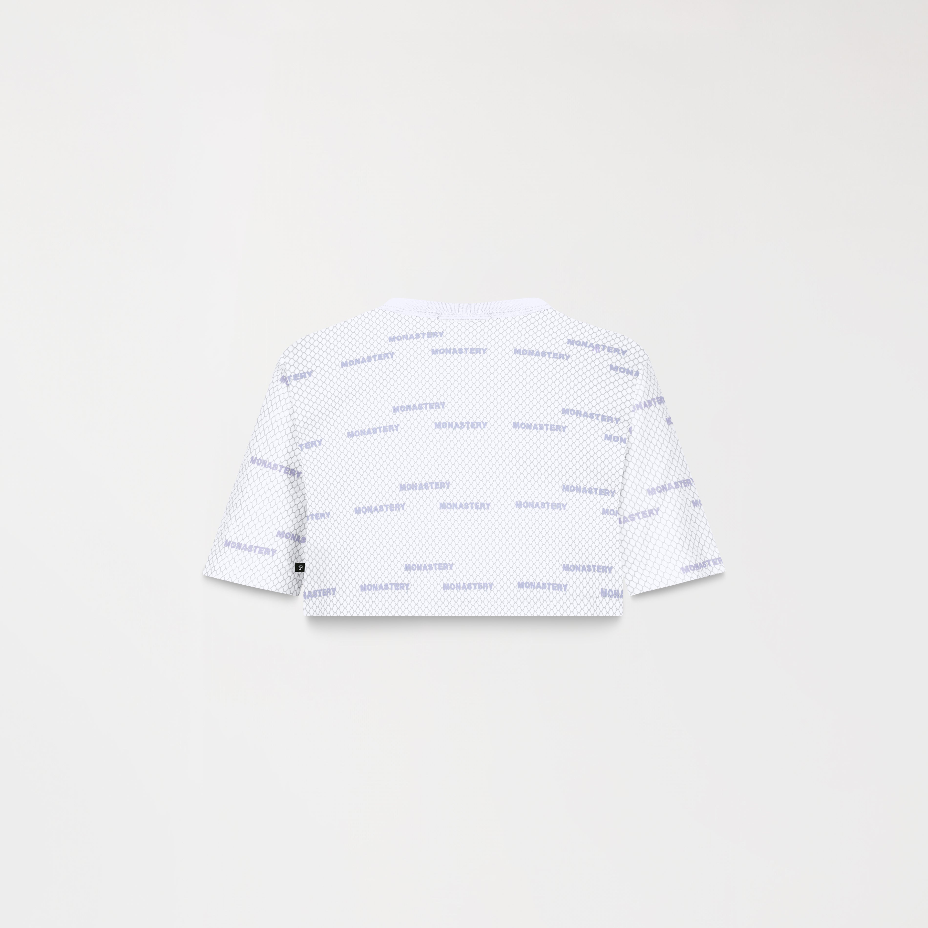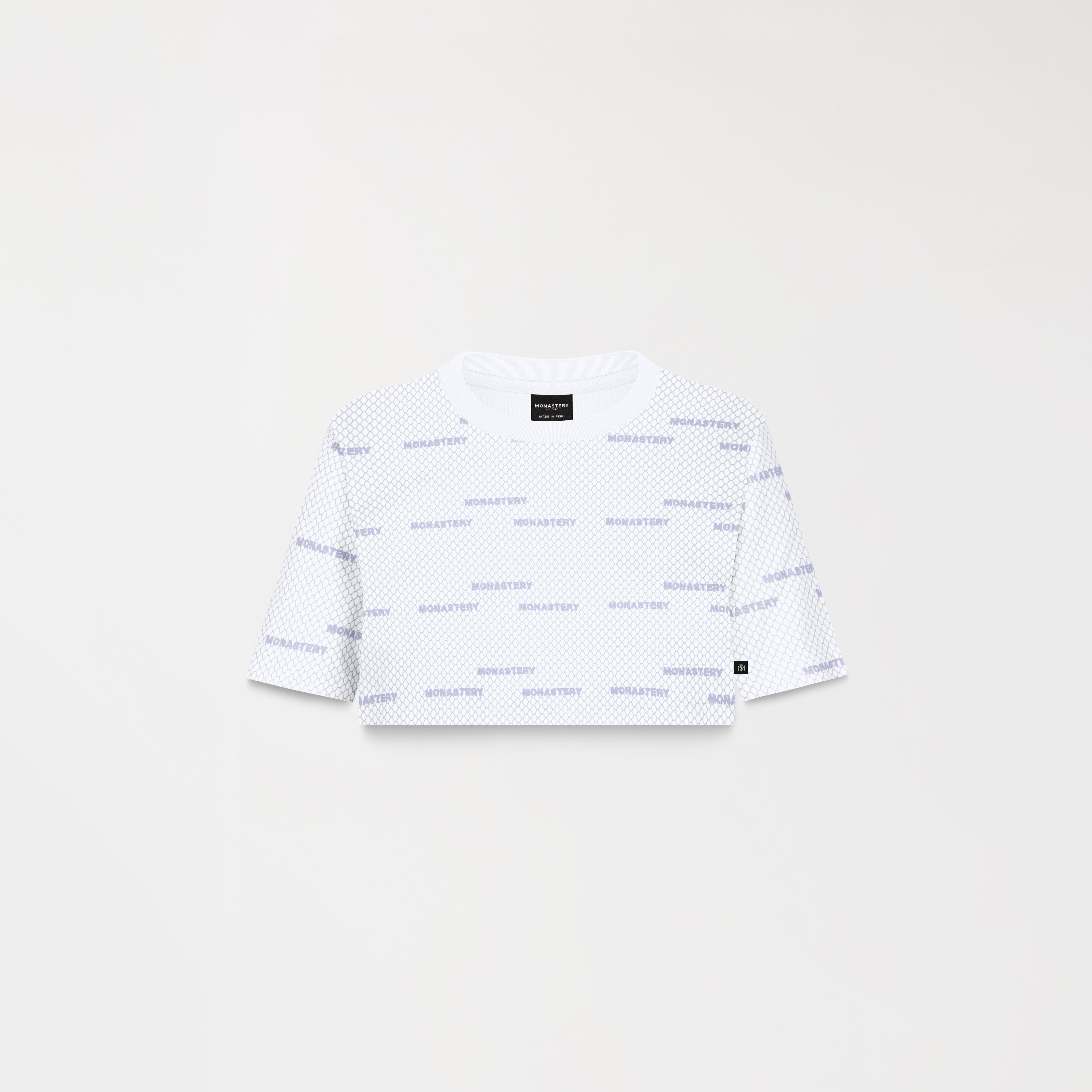 Women's crop top in Peruvian cotton exclusively for Monastery, crafted in a petite silhouette. This crop top features an all-over flat print background accompanied by a repeat of our iconic Monastery logo and a repeating Mayan-style art print, creating a distinctive and dynamic look perfect for your wardrobe and style.