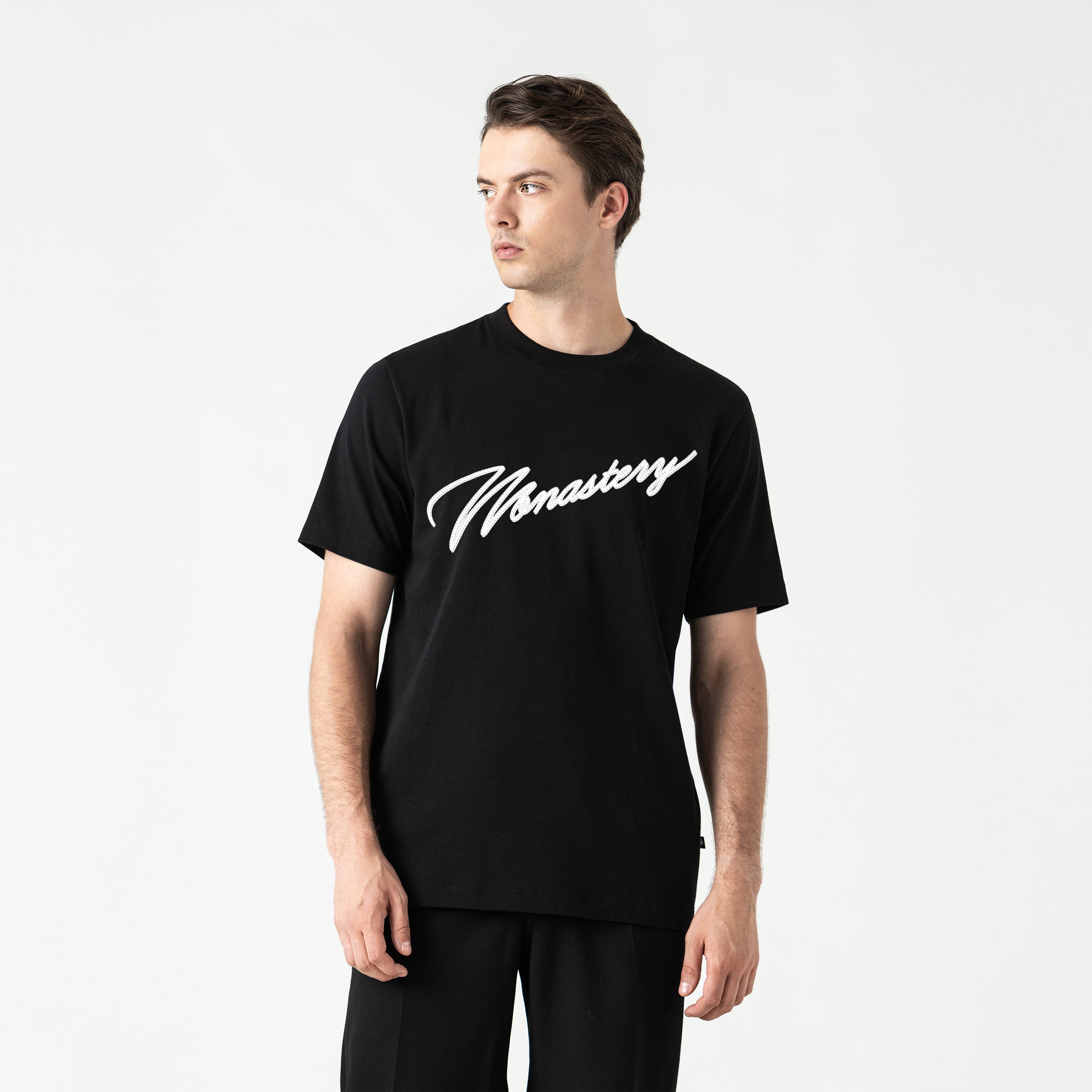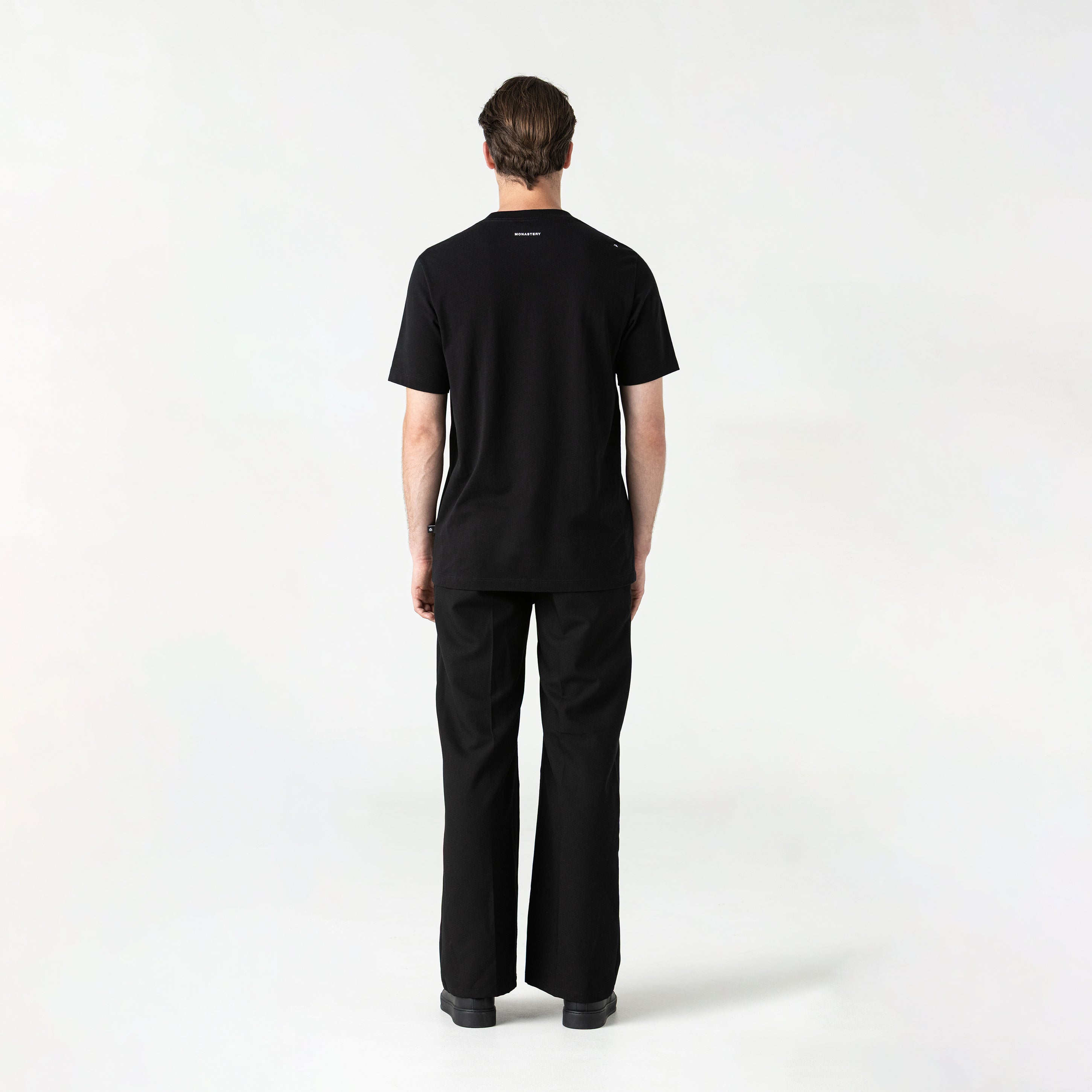 Made from Monastery fabric, it provides softness, structure, and a comfortable fit for everyday wear. It features a 2.5cm ribbed collar. The front is highlighted by a clean, versatile flat print, while the distinguishing detail is the flat plastisol applied over the topstitching, which adds subtle texture and visual precision, elevating the garment with a modern touch. A t-shirt that proves that detail makes all the difference.