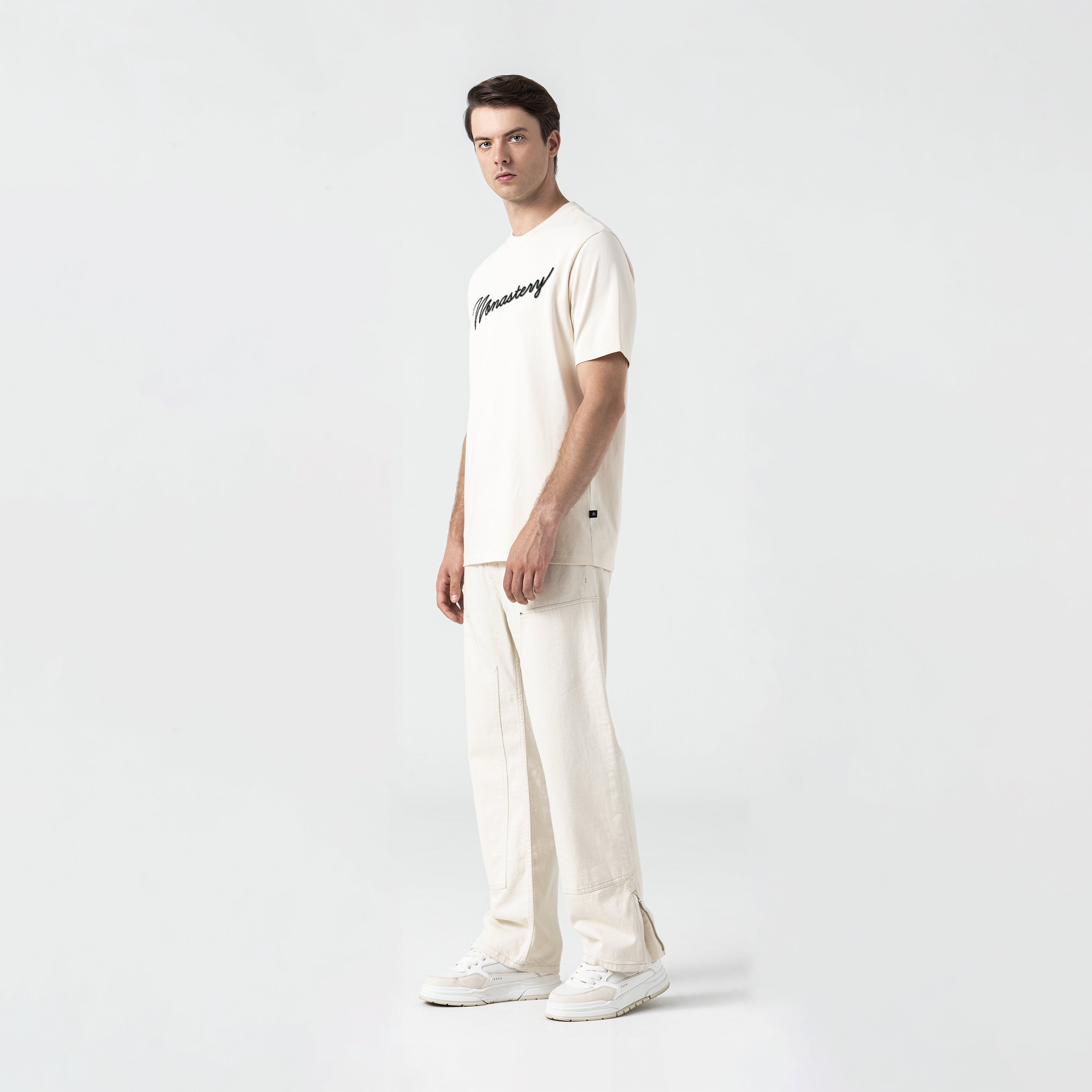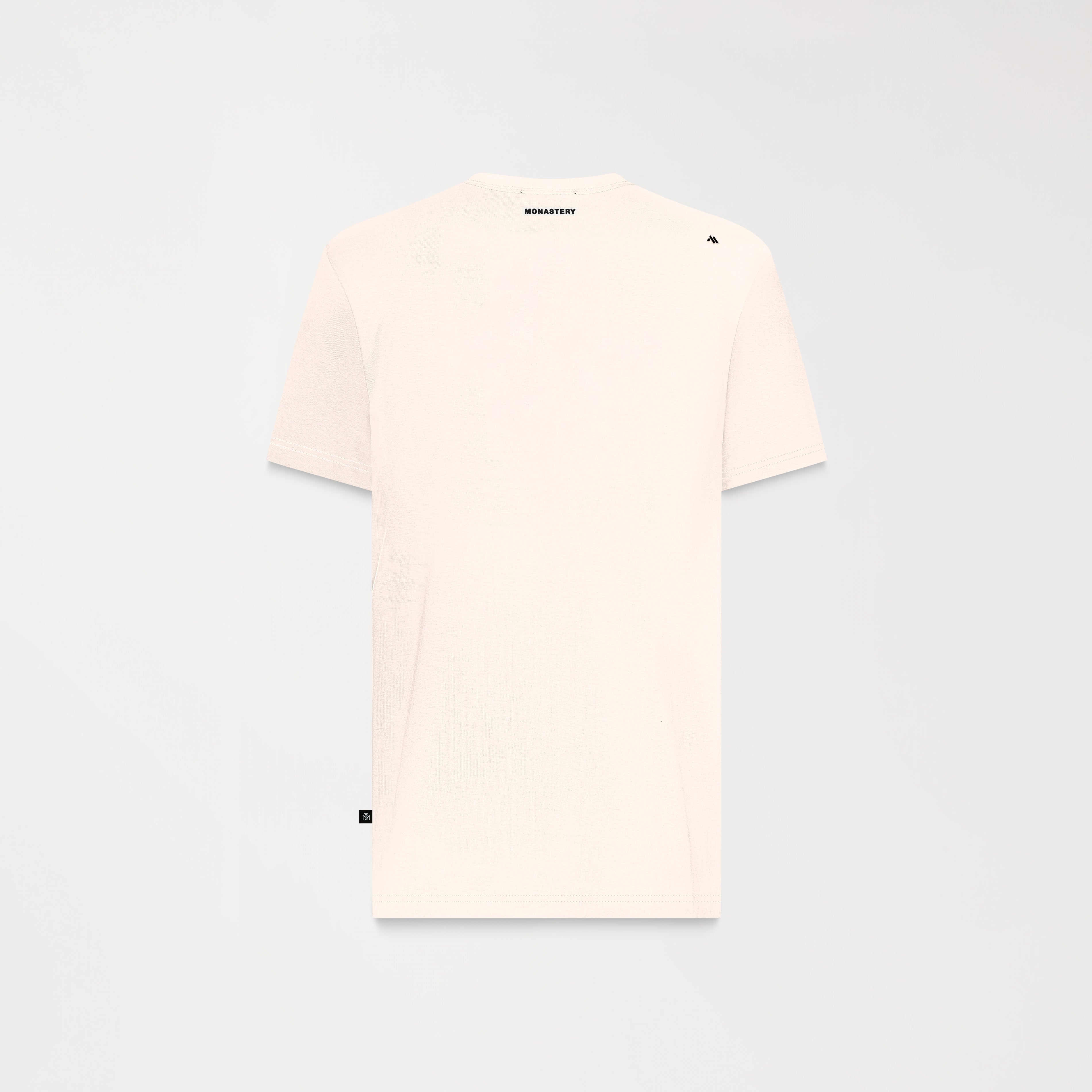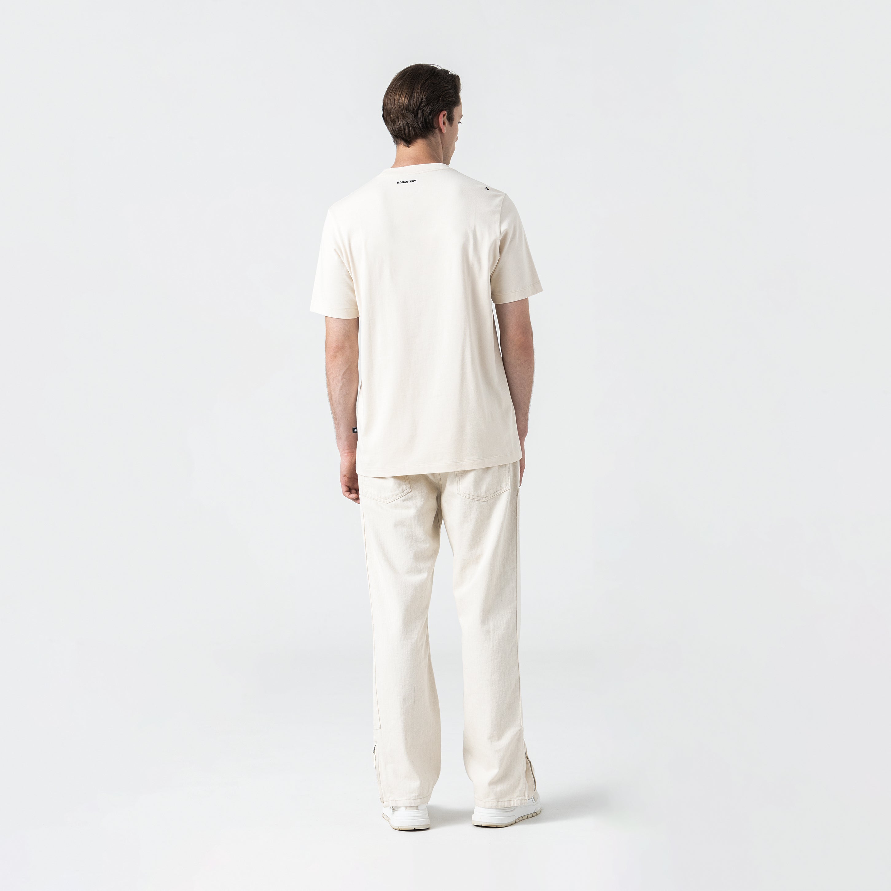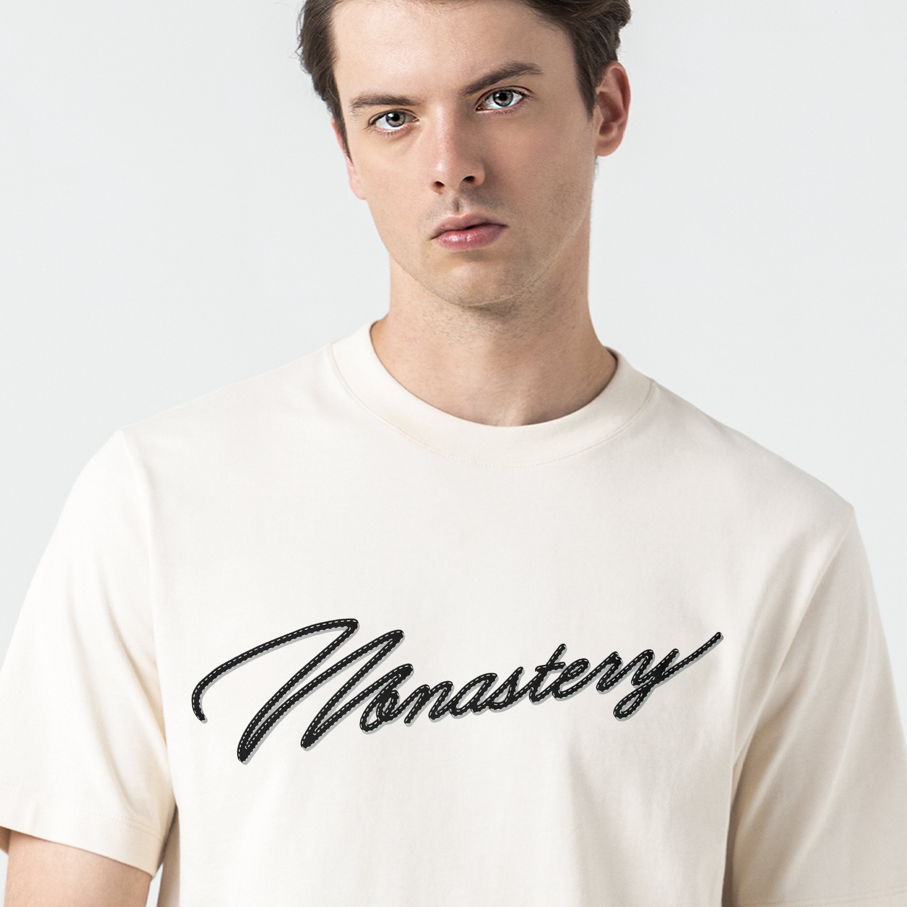 Made from Monastery fabric, it provides softness, structure, and a comfortable fit for everyday wear. It features a 2.5cm ribbed collar. The front is highlighted by a clean, versatile flat print, while the distinguishing detail is the flat plastisol applied over the topstitching, which adds subtle texture and visual precision, elevating the garment with a modern touch. A t-shirt that proves that detail makes all the difference.