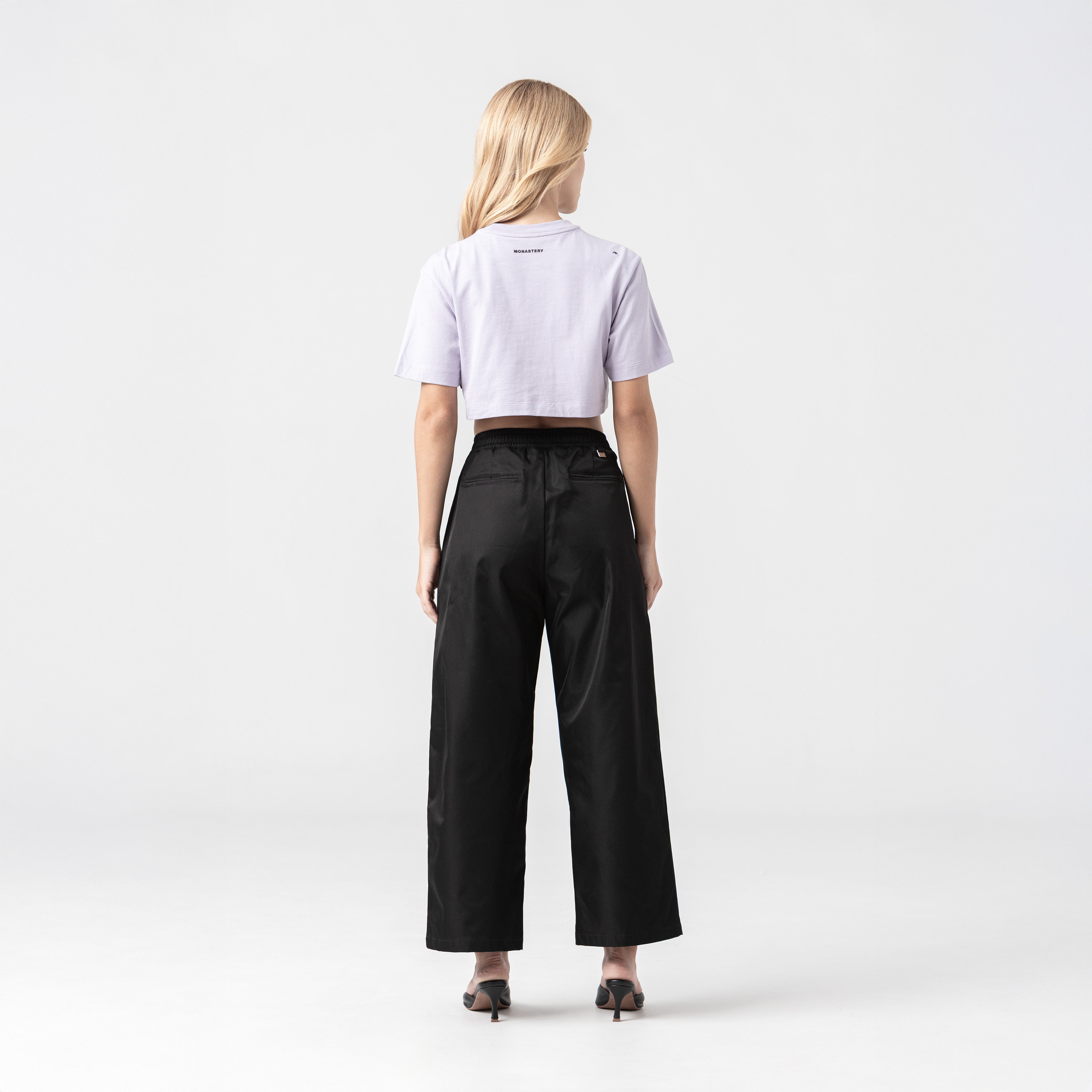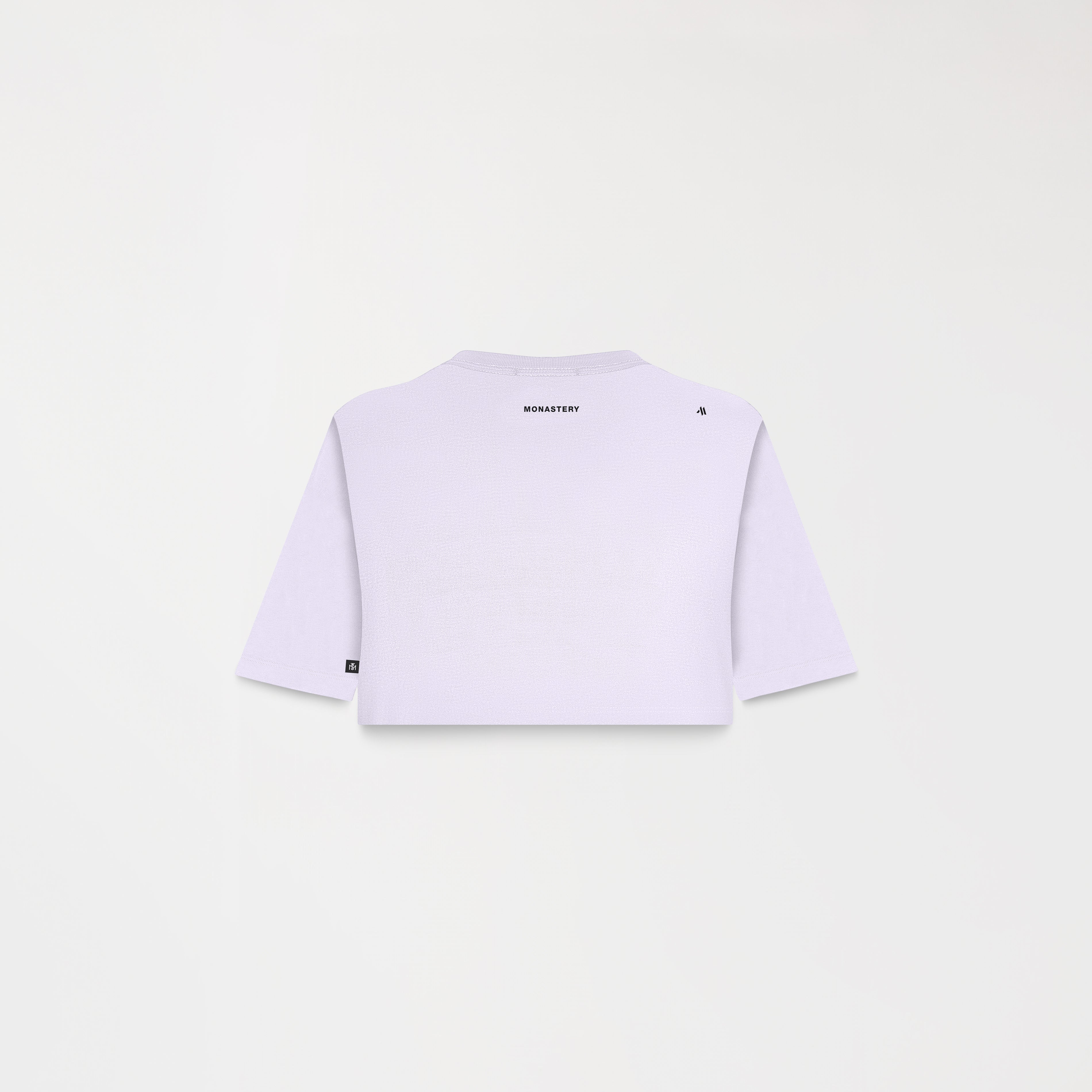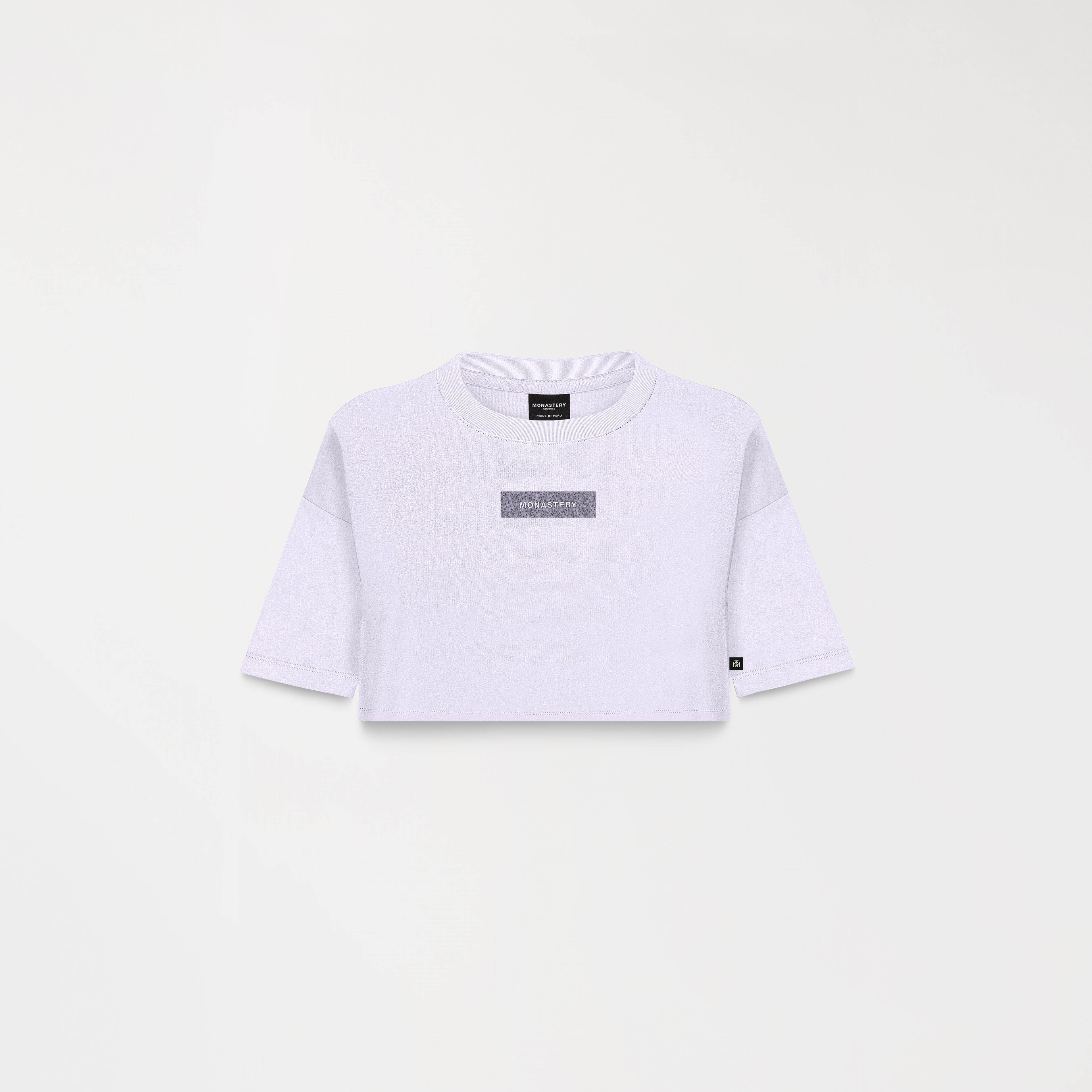 Women's crop top in Peruvian cotton exclusively for Monastery, crafted in a petite silhouette. This crop top stands out for its minimalist and modern design with a sophisticated touch thanks to its glitter print on the front, accompanied by our iconic Monastery logo in high-density print. The combination of its petite and short cut makes it a versatile and avant-garde garment, ideal for a contemporary look.