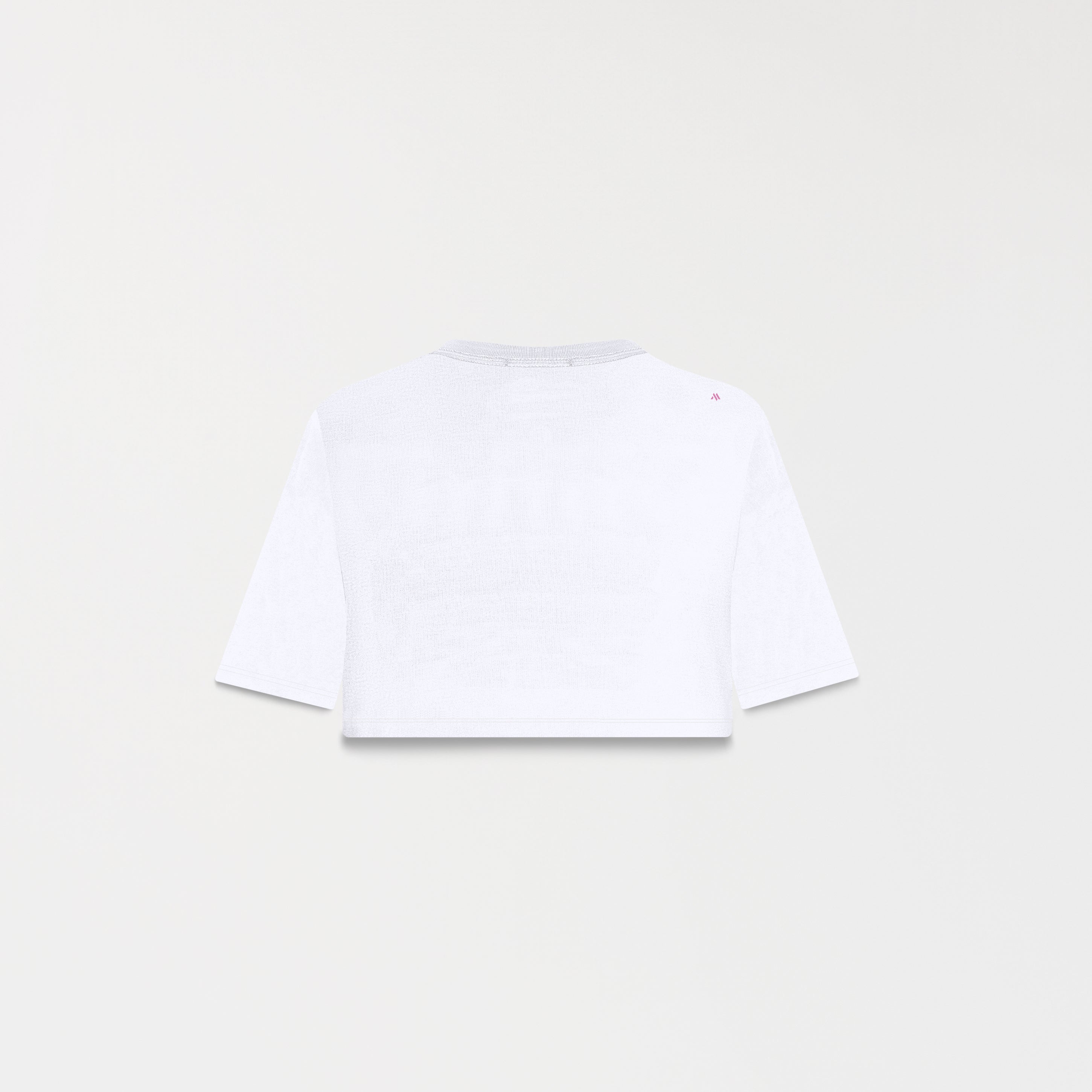 This piece combines aesthetic sensibility with technical rigor. Crafted from MONASTERY 2, a 260-gram, ultrasiliconized, 100% cotton fabric, the material offers a silky feel, controlled structure, and a clean drape that naturally complements the body. Its petite silhouette defines the shape without being overpowering. The front is enhanced with a puff technique, introducing volume and relief, creating a sophisticated focal point. The back features a high-density print with a deep and durable finish, adding graphic presence without compromising the garment's understated elegance.