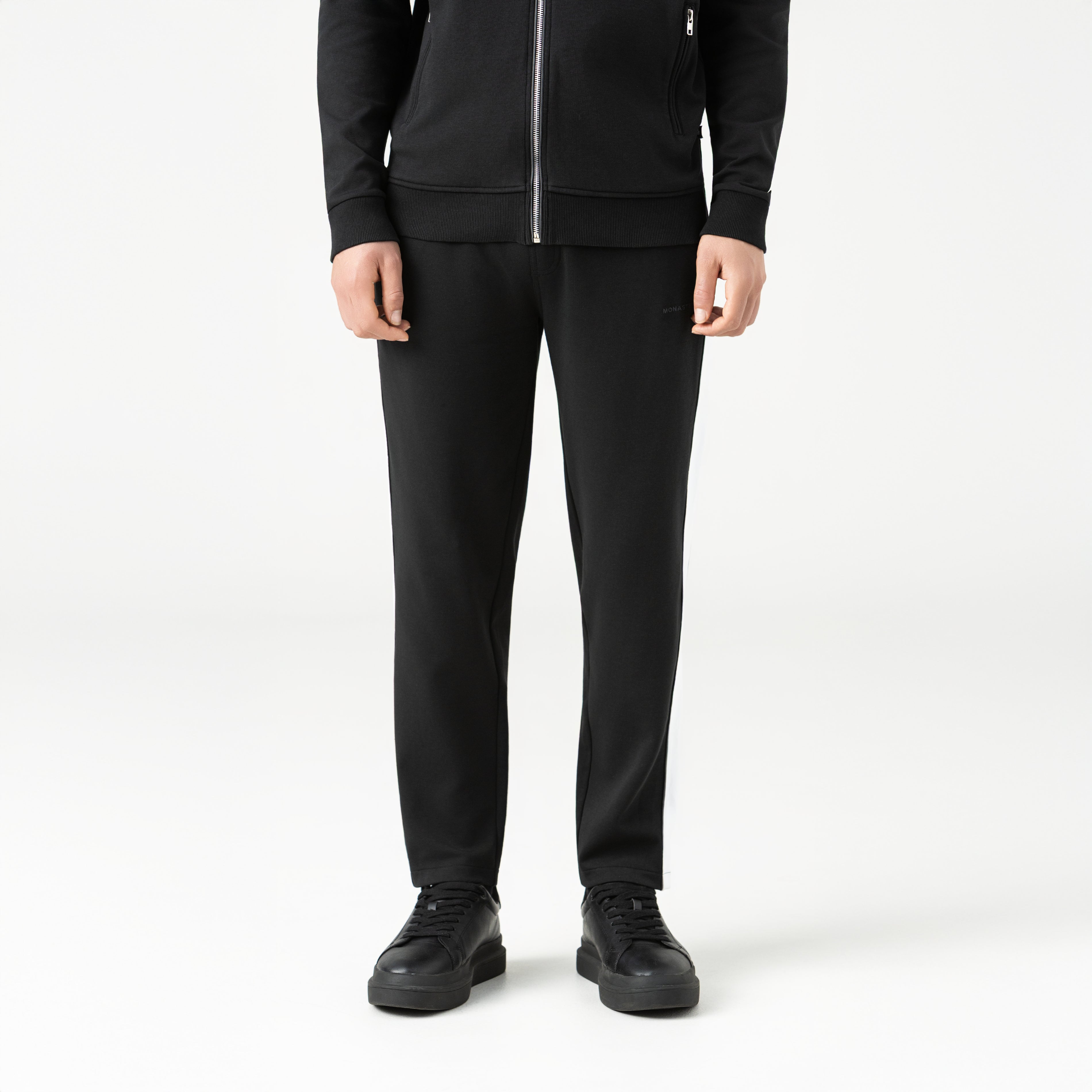 Luminus is a set consisting of a jacket and joggers in double-faced knit fabric, with a regular silhouette that combines comfort and sophistication. The jacket features zippered pockets, a contrasting trim, an embroidered Monastery logo, and a high-density print on the back for added character. The joggers feature a matching drawstring, front and back pockets, and an internal pocket for small items. The contrasting details reflect meticulous attention to detail. An ideal set for an elegant standout in casual settings.