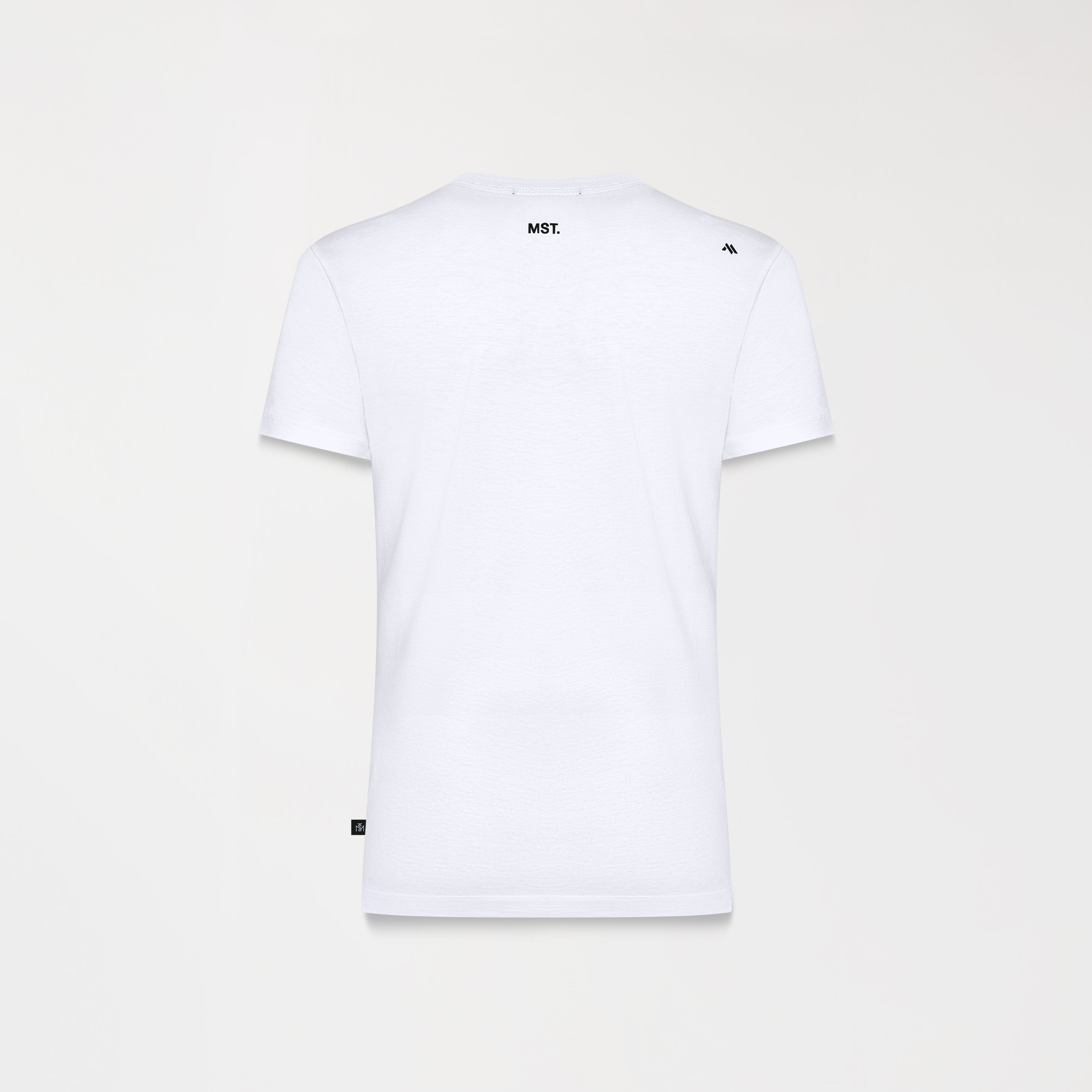 A women's T-shirt crafted in a small silhouette designed to highlight the feminine figure through its fresh, fitted textile base. Marie features MST artwork on the front using a Flock + Plastisol technique. It is a dynamic garment thanks to its textured front and its combination of techniques, accompanied by our signature logos on the back. This garment features details that give it a unique and exclusive touch, while maintaining the comfort and versatility of a basic garment.