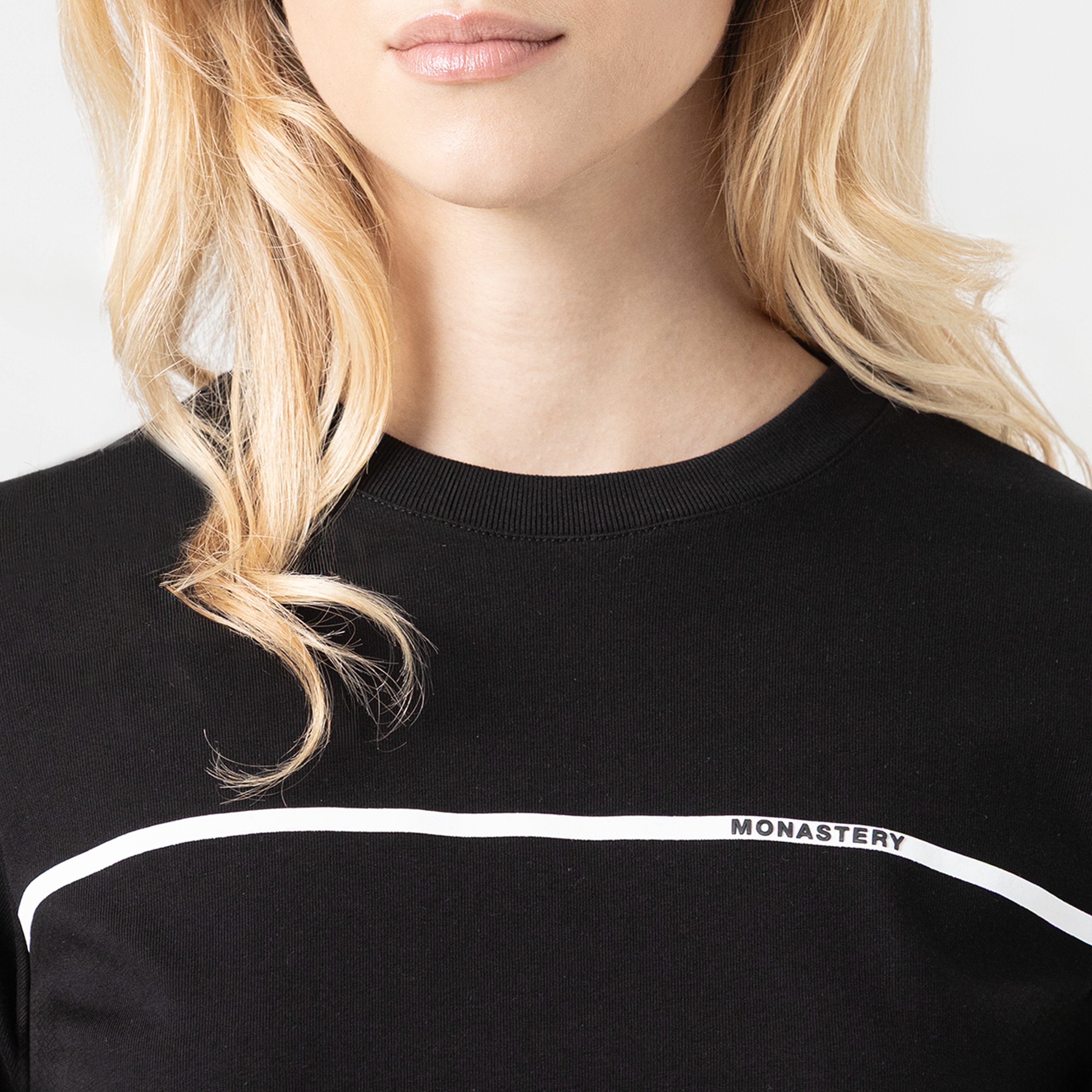 A women's T-shirt crafted with a regular fit, designed for the comfort of the Monastery woman. Molly is a design featuring the Monastery logo on the front over a striking contrasting line that dynamically stands out from the design. Made on our Monastery textile base, 100% cotton, exclusive to the brand.