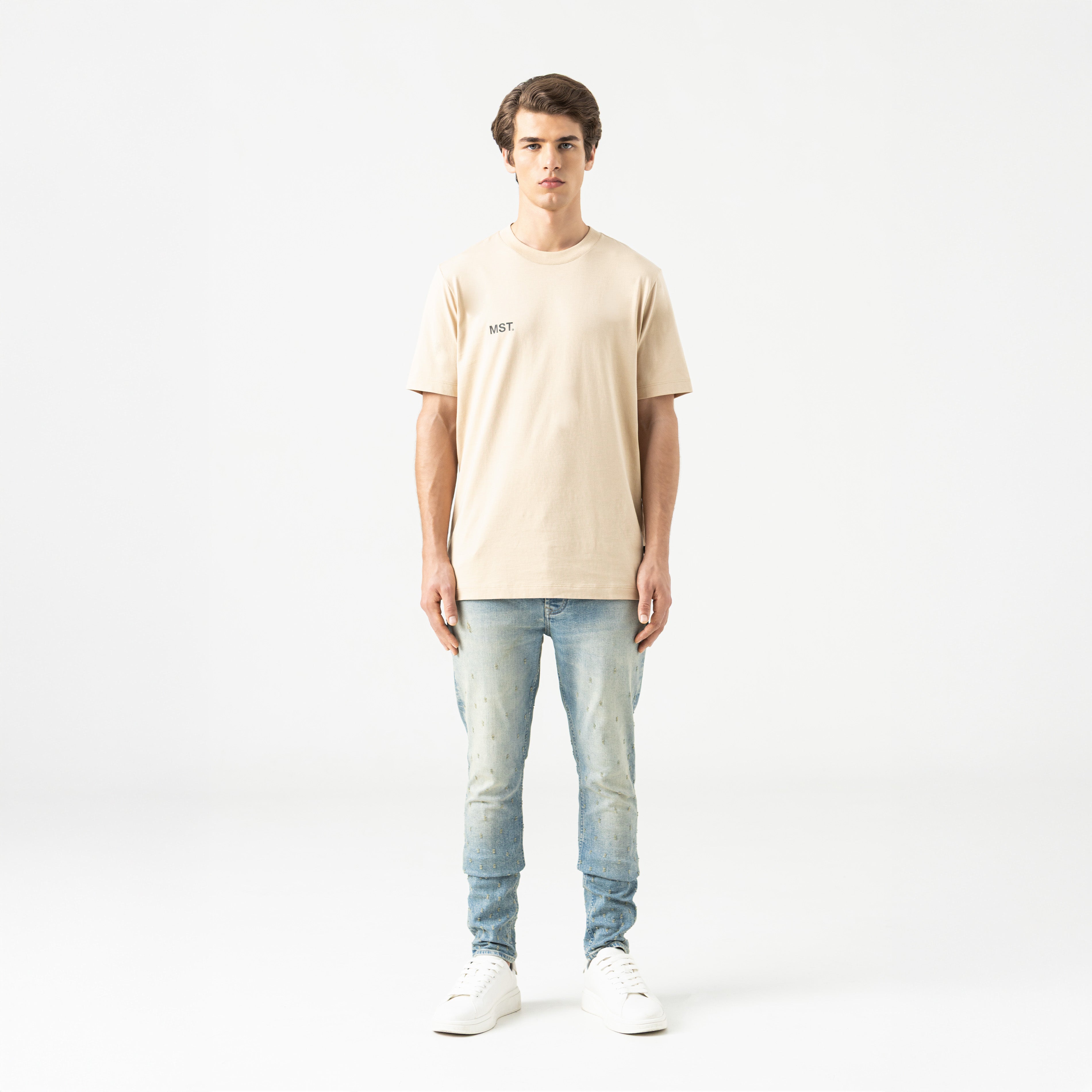 The Ramson men's t-shirt, with a bold and controlled aesthetic, is made from high-quality cotton and features a regular silhouette with a 2.5 cm ribbed neckline. The back MST logo graphic combines flat and high-density printing techniques, highlighting an intertwined chain detail that provides visual strength and sophistication. On the front, a high-density print reinforces the garment's identity. Perfect for a casual style with attitude.