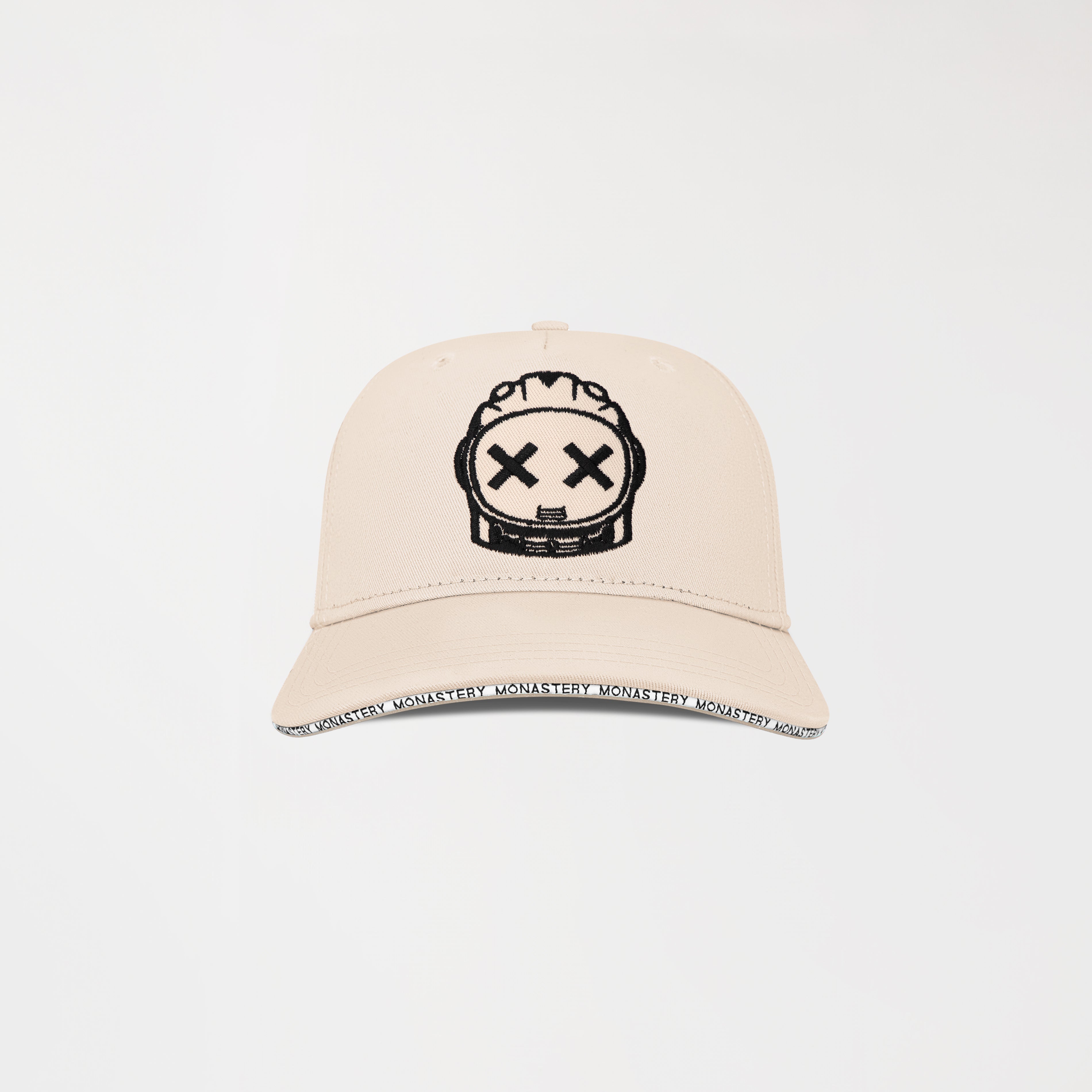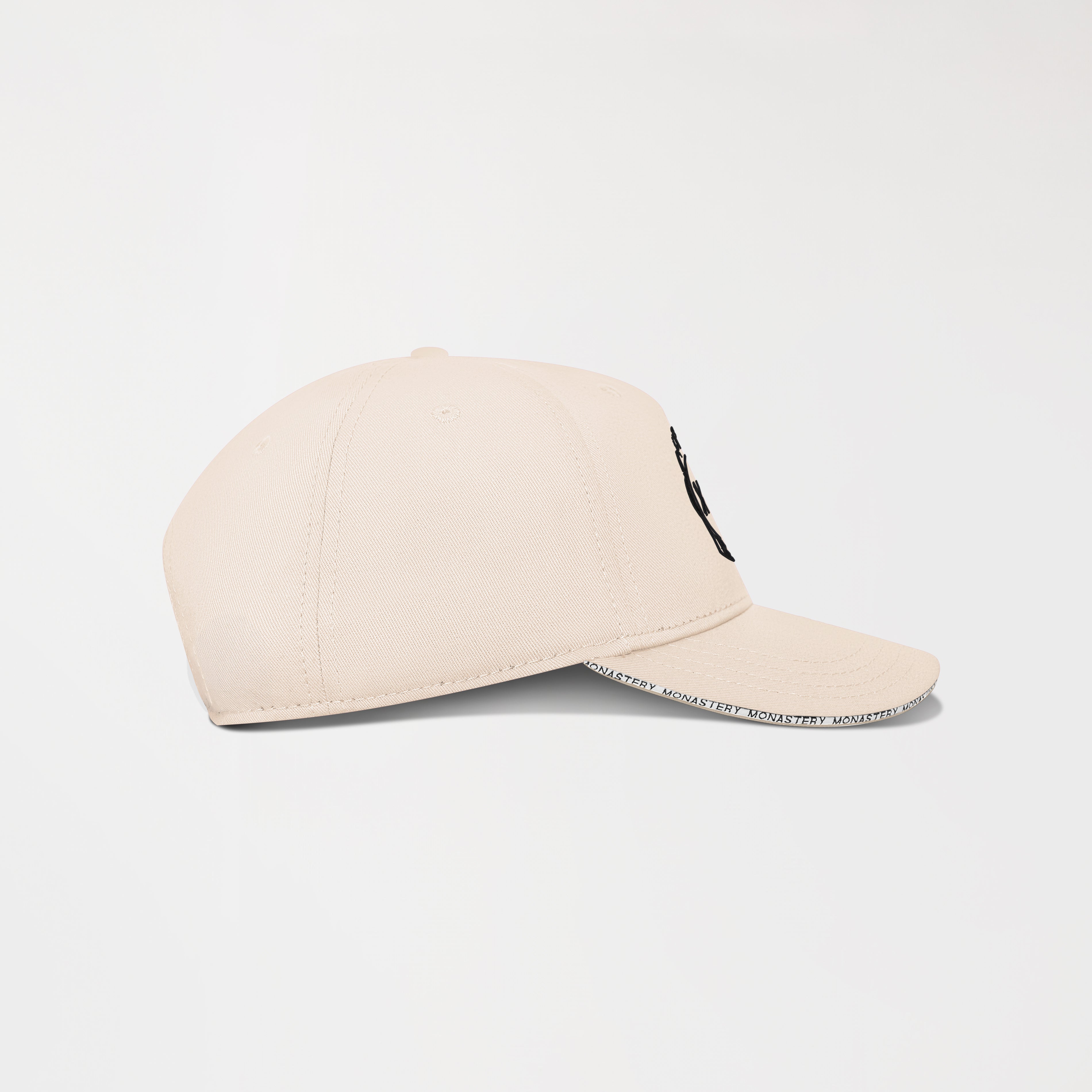 Front technique: Flat embroidery, half visor in white with a woven Monastery logo repeat.
