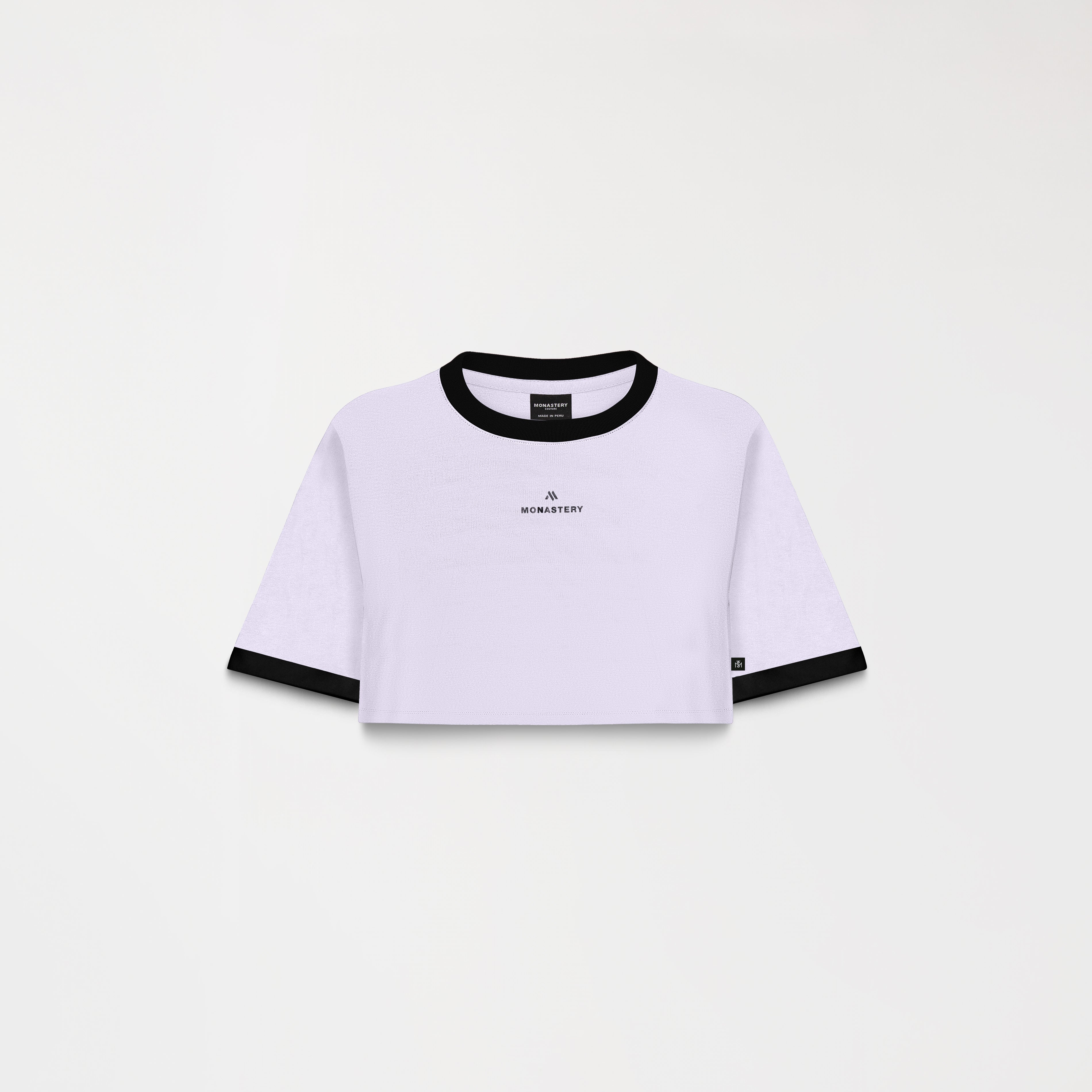 Women's crop top in Peruvian cotton exclusively for Monastery, crafted in a small silhouette, Senn features the Monastery logo and insignia in a plastisol + glossy transfer technique. This style features contrasting details that give it a distinctive and modern touch. This crop top is ideal for those seeking a comfortable and sophisticated look thanks to its large textile base.