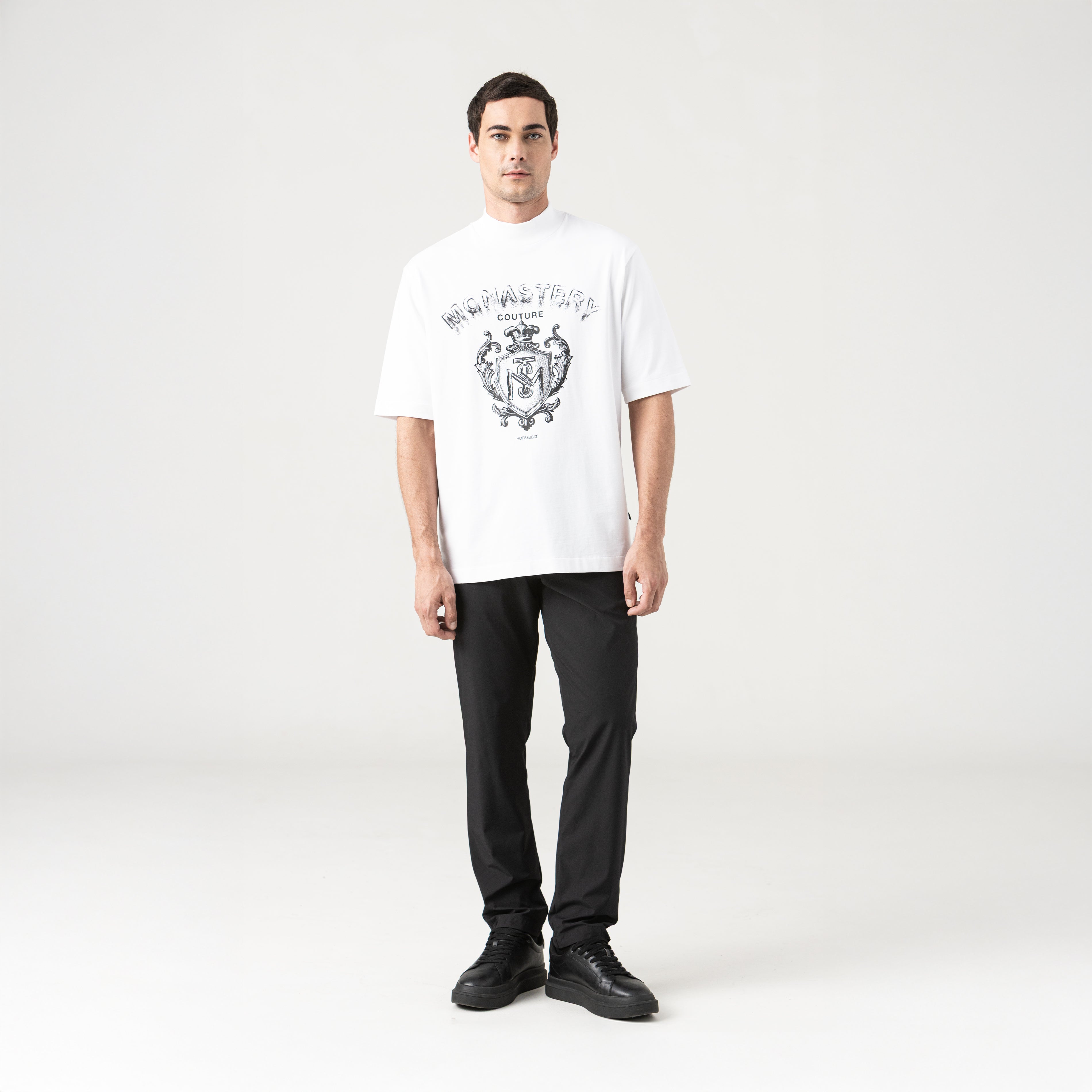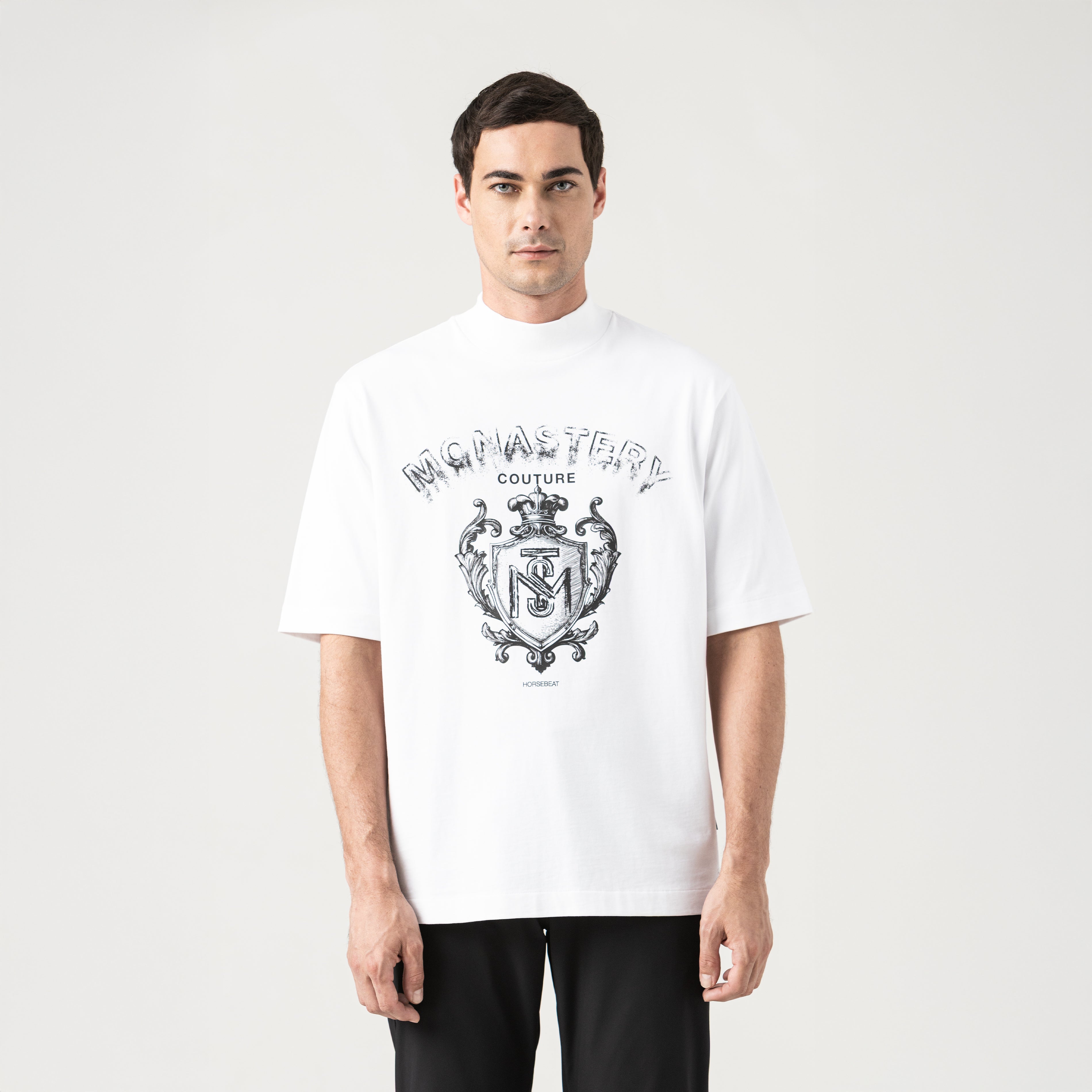 Sheval is a men's T-shirt. This oversized silhouette with a 5cm ribbed neckline is crafted from our exclusive 100% cotton Monastery fabric, offering structure, softness, and a relaxed fit with character. The front features a flat print with a Monastery crest design, a symbol of strength, heritage, and timeless style. On the back, a high-density print adds texture and depth, completing a powerful and balanced visual statement. Ideal for those who dress with intention and confidence.
