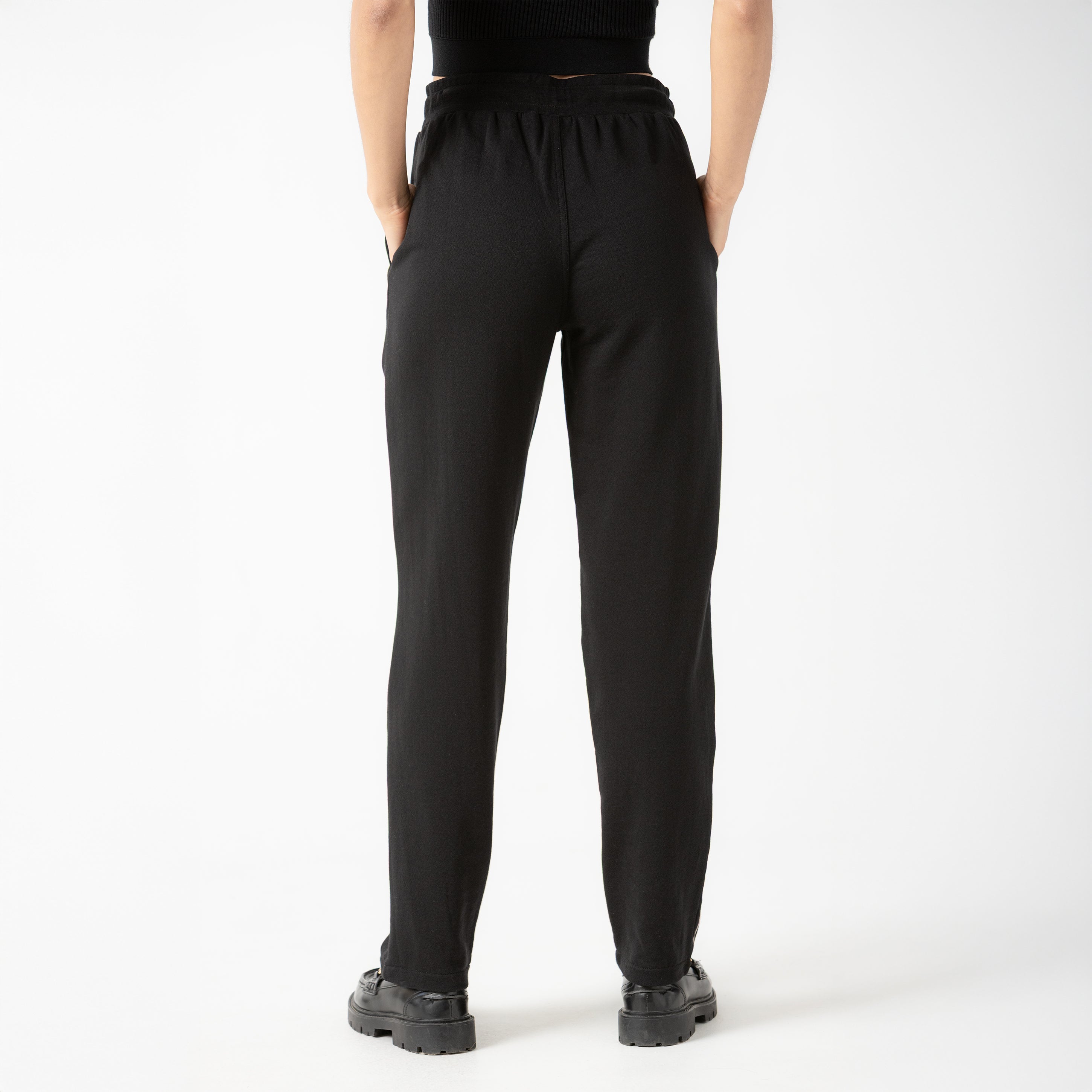 Jogger femenino elaborado en French Terry, un tejido suave y ligero que brinda confort y libertad de movimiento. Su silueta bota recta y diseño en color negro lo convierten en una prenda versátil y fácil de combinar para looks casuales o deportivos.