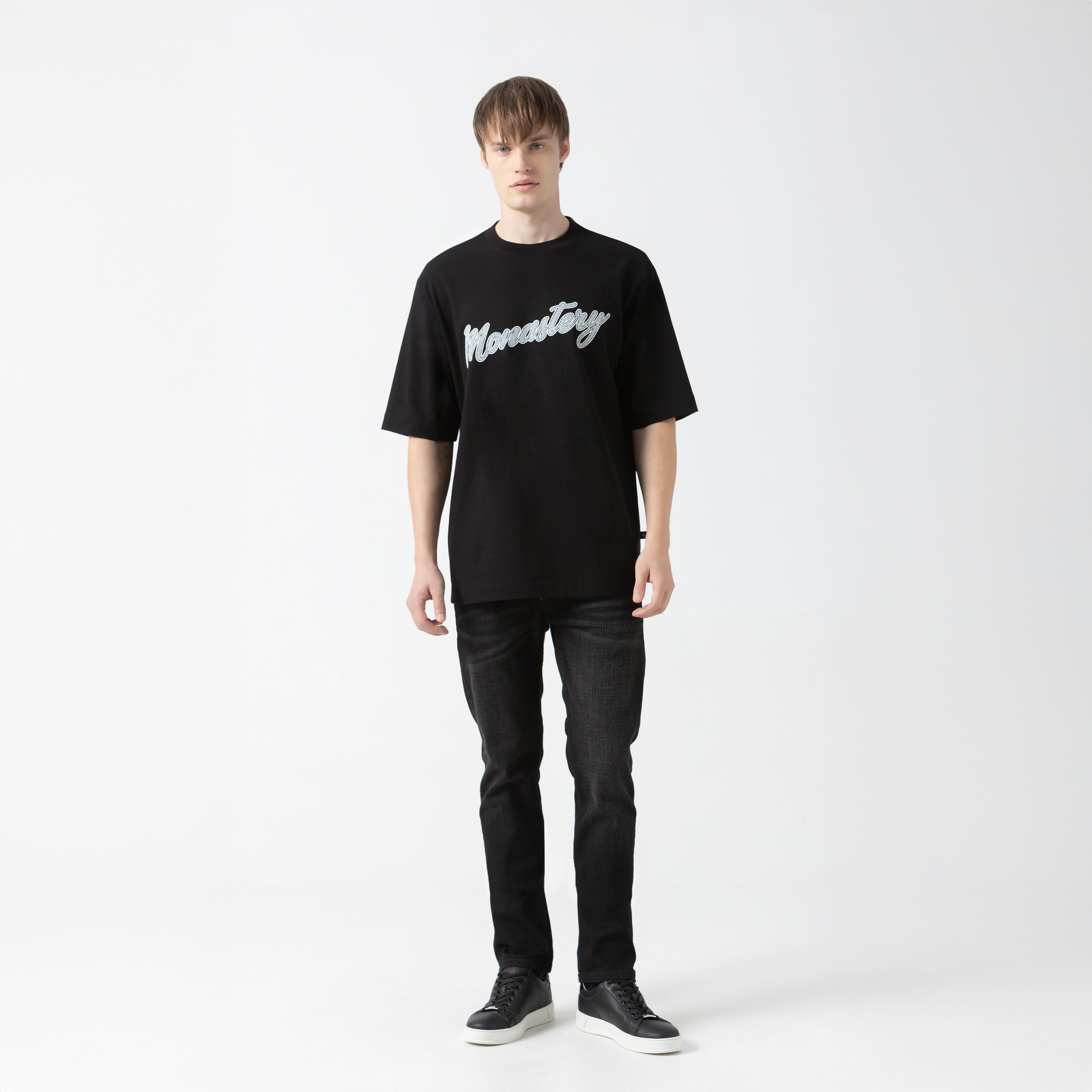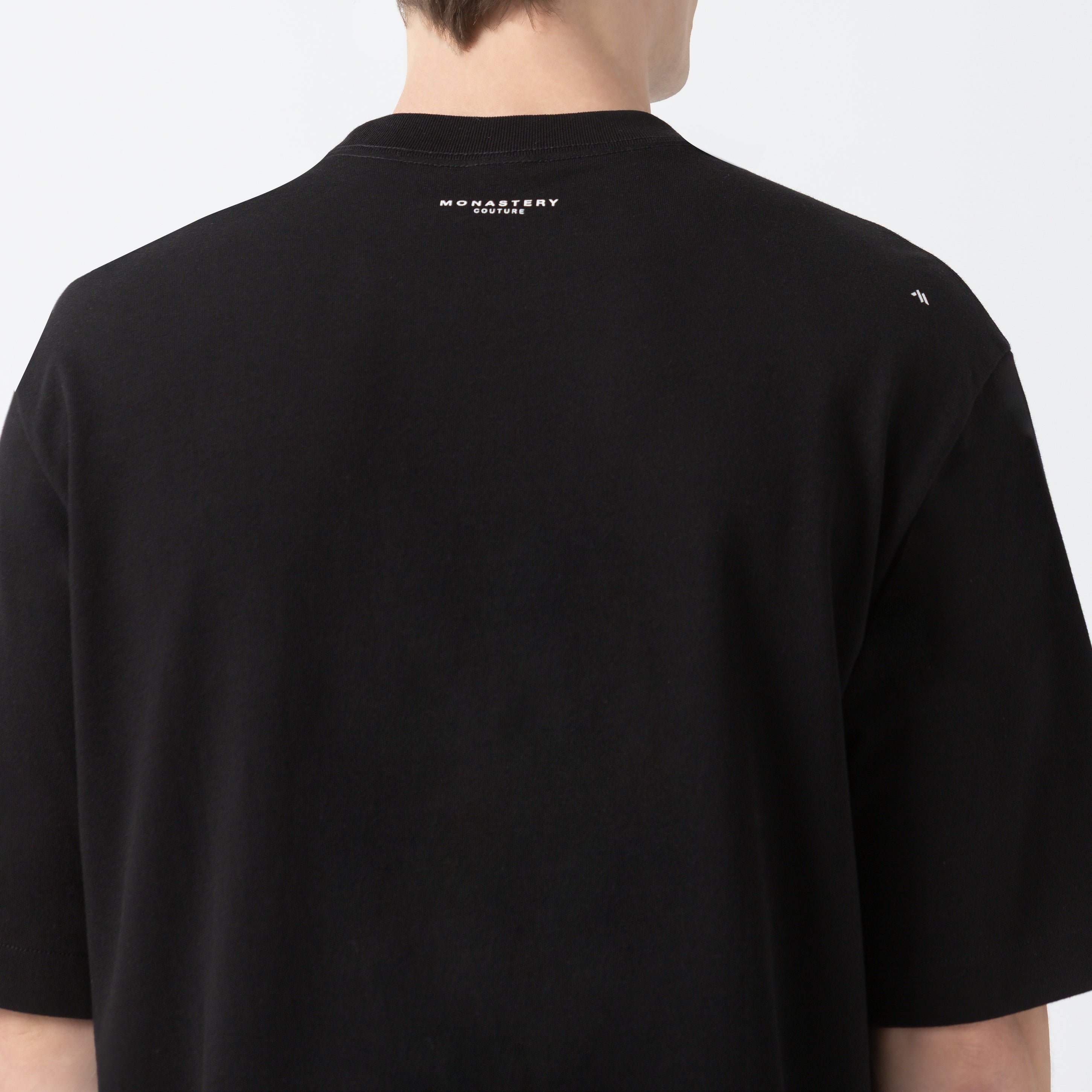 Its design features a ribbed collar and flat prints on the front and back, where the brand's logos are presented with understated elegance and graphic impact. A piece with a contemporary and urban aesthetic, created for those seeking ample comfort and an authentic, versatile style, true to the Monastery DNA.