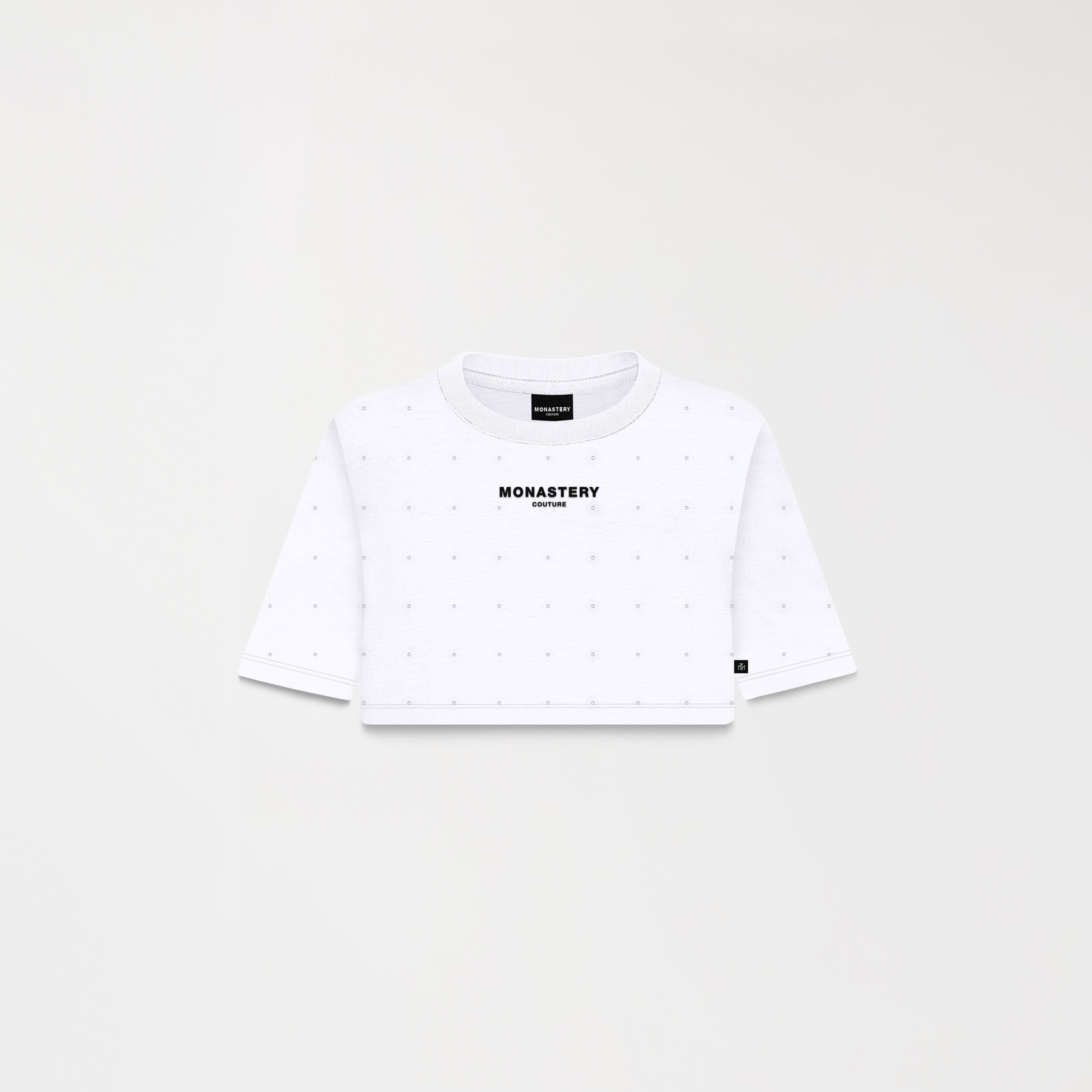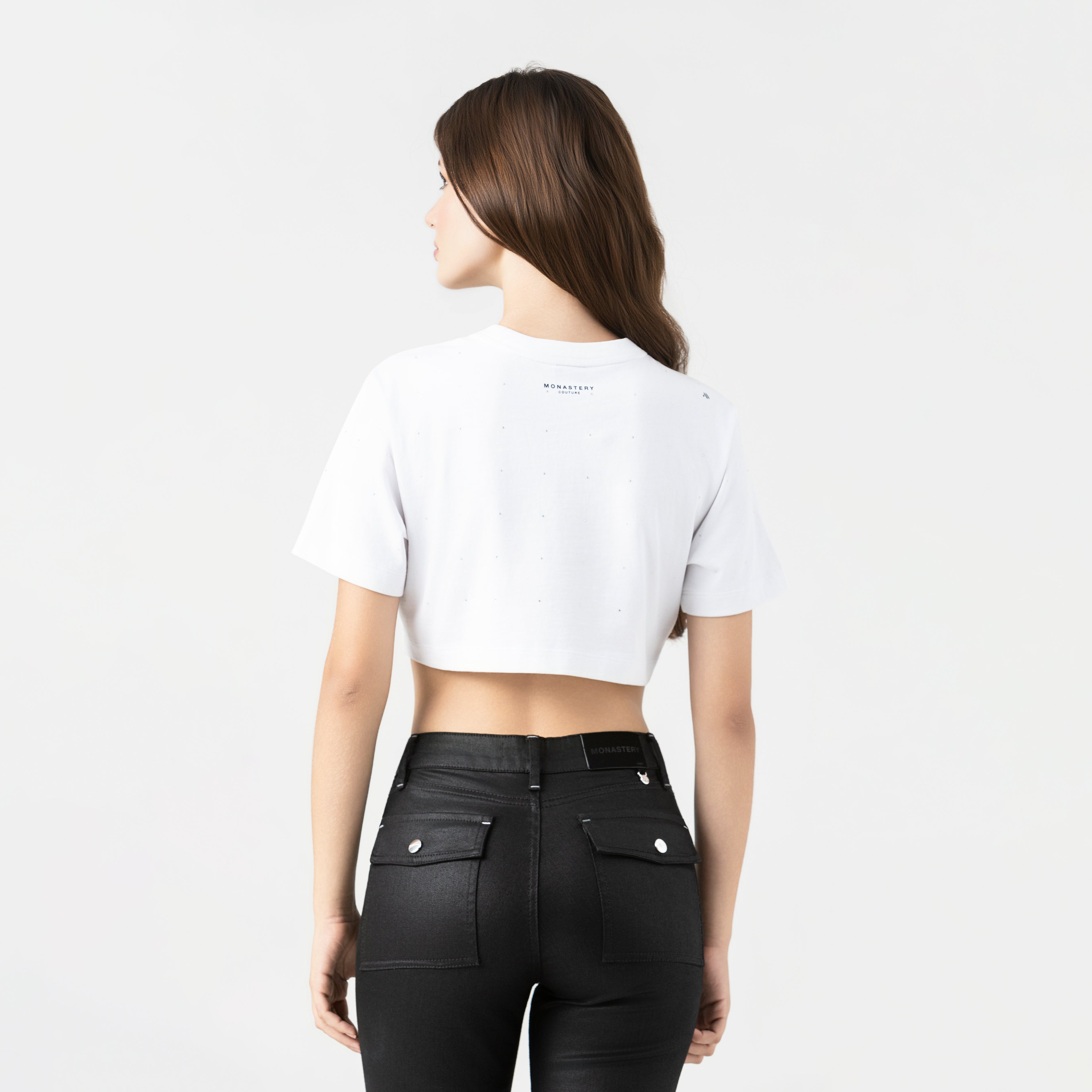 Sora is a design featuring crystals applied continuously throughout the garment, precisely arranged to create a dynamic effect. It features the Monastery Couture logo in the center front using a transfer technique, which reinforces the visual contrast without detracting from the design. The back features signature artwork in a flat print, perfect for a stylish statement.