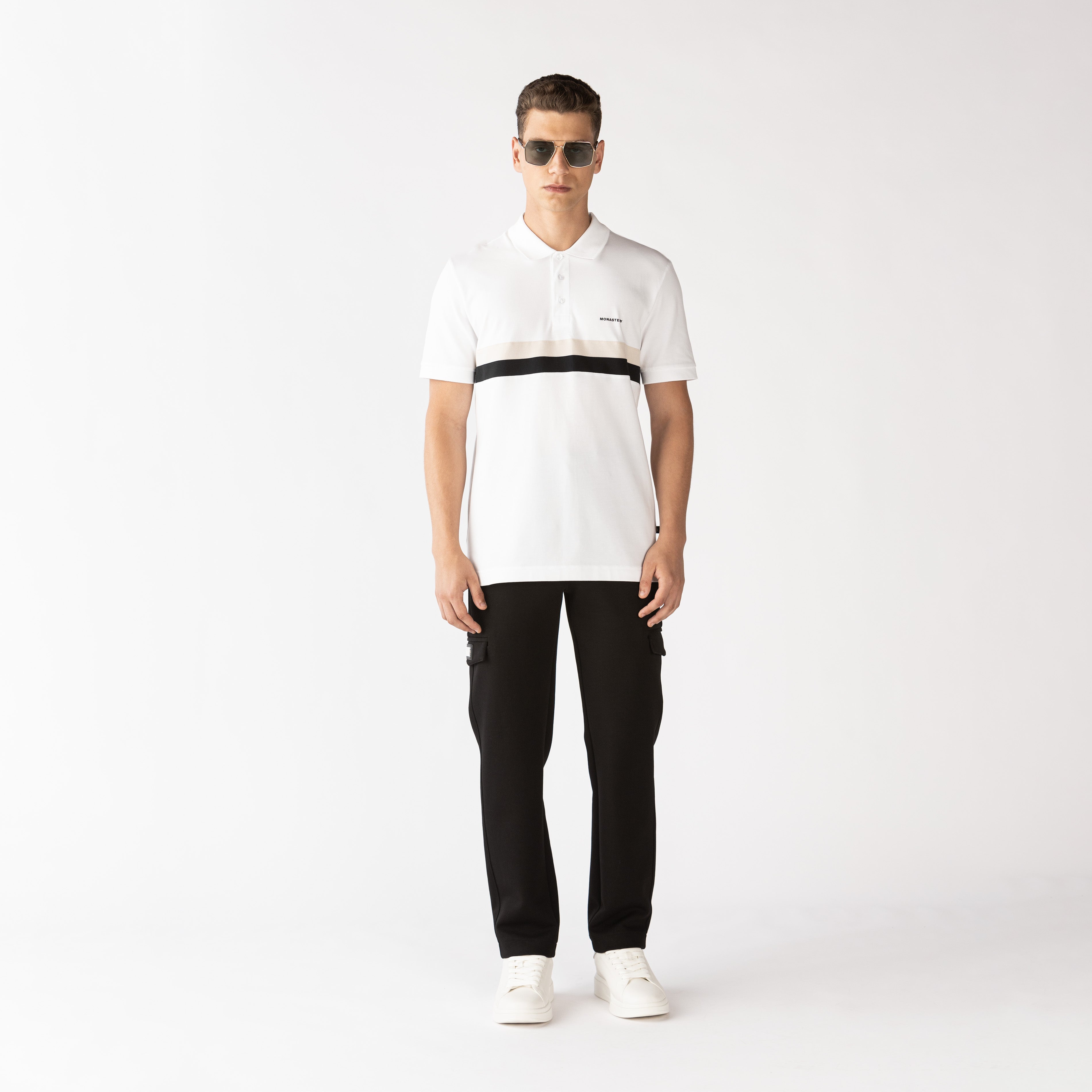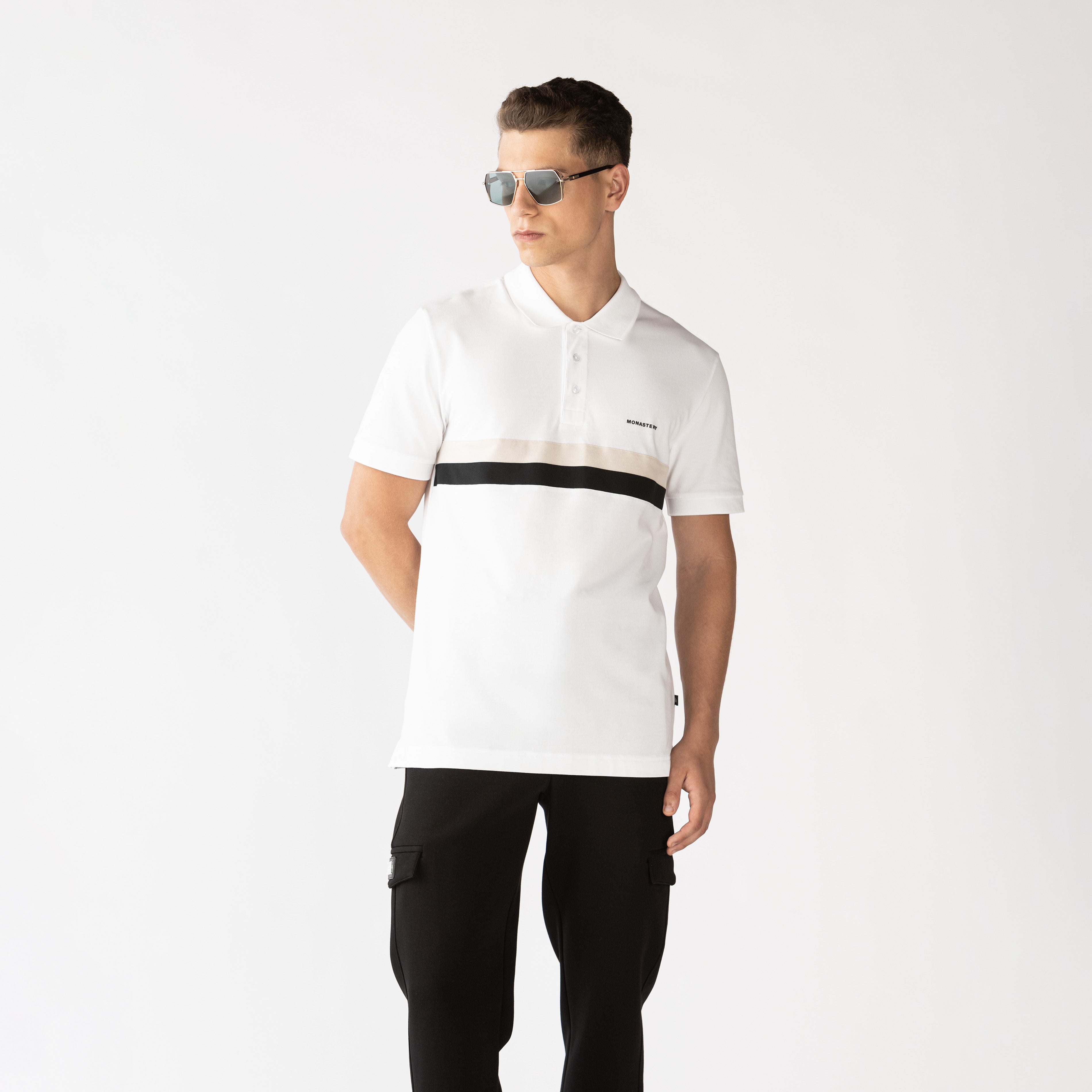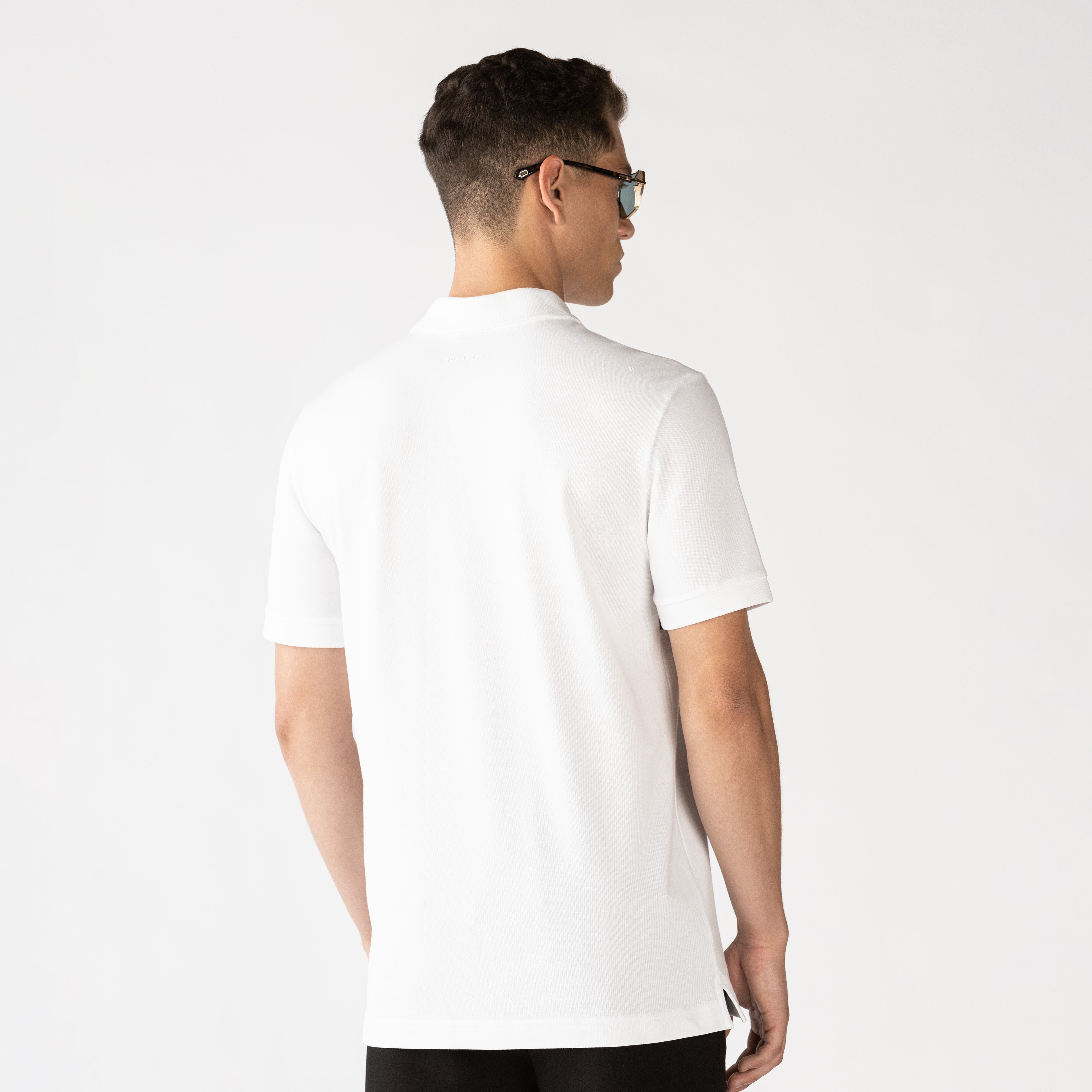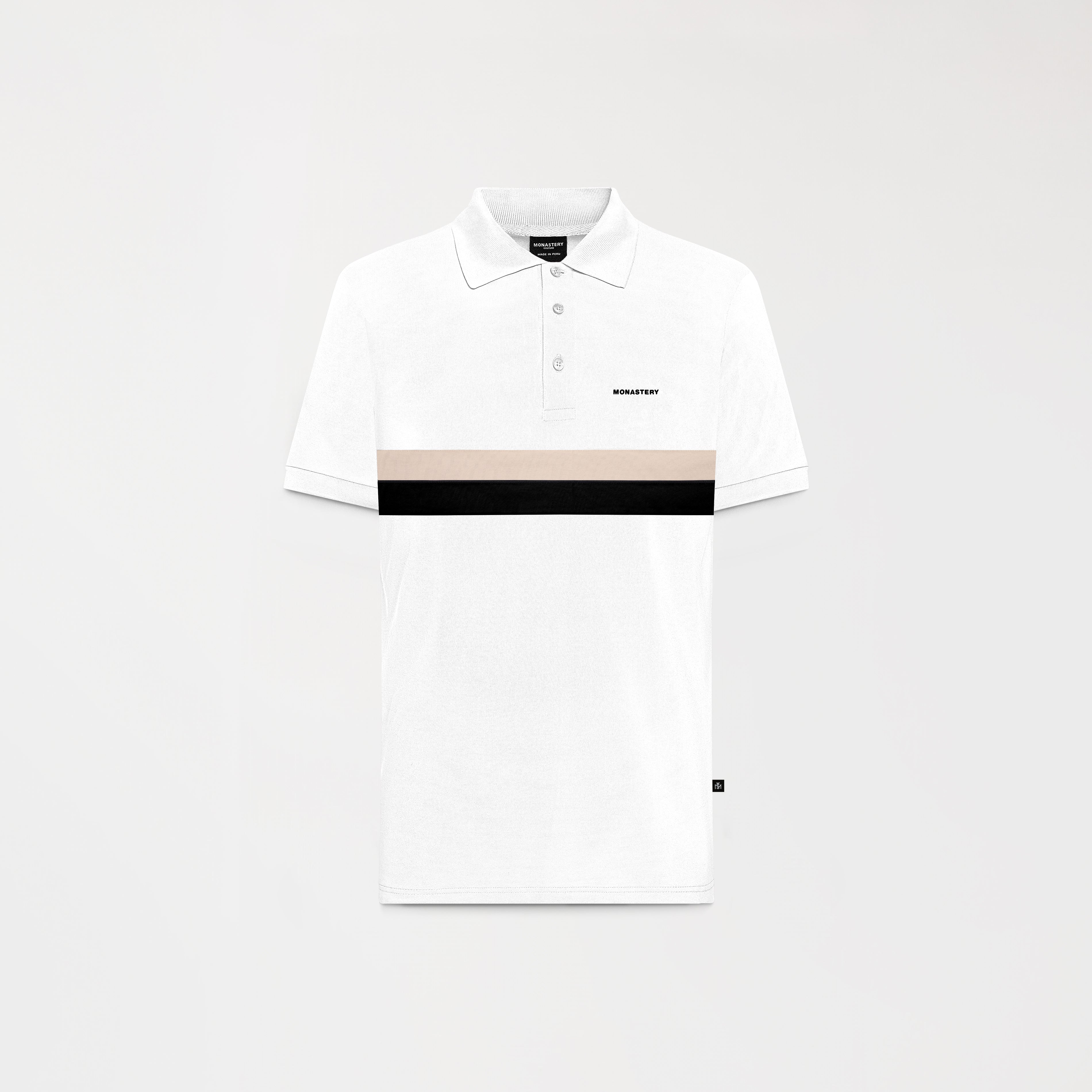 White men's polo shirt made in high quality pique pima, exclusive for Monastery, offering a perfect combination of softness and resistance. It stands out for its artwork printed in heart stitch and its innovative double cut in the center front, which give it a modern and attractive style. The knit collar and cuffs add a touch of elegance, while the high density detailing on the back ensures a sophisticated finish. Ideal for those seeking a distinctive, contemporary look.
