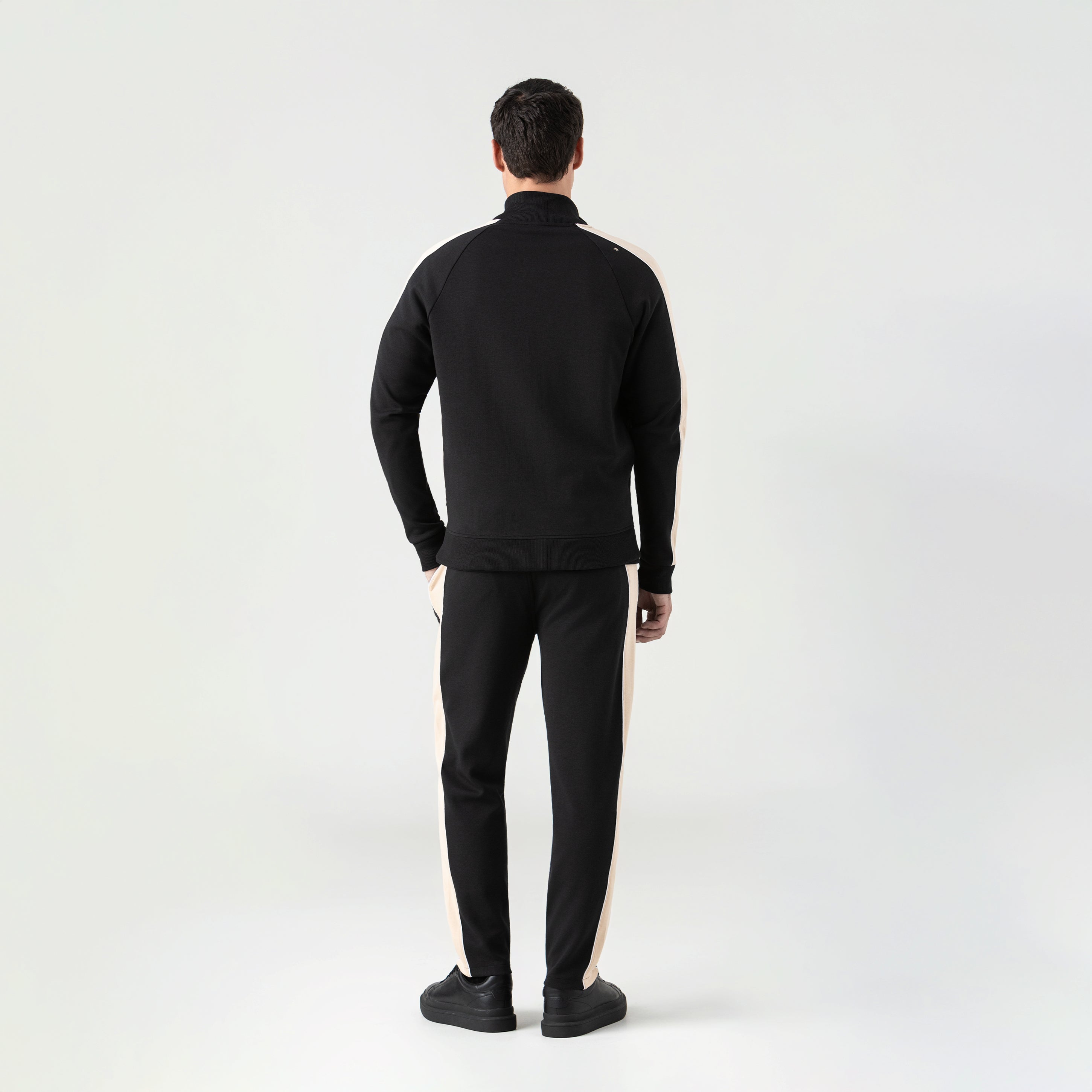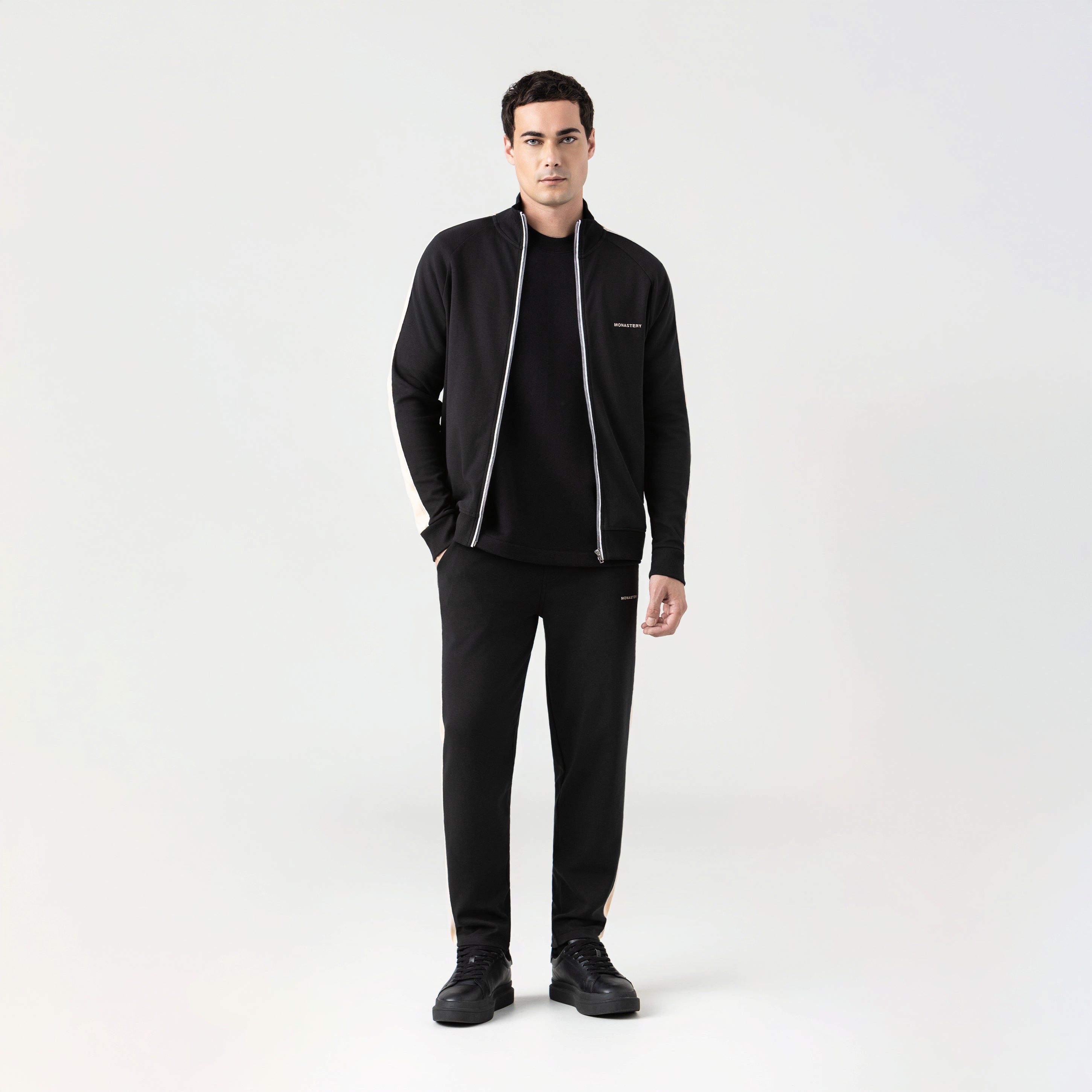 Tormain is a jacket and jogger set in double-faced knit fabric offering a regular silhouette that balances comfort and elegance. The jacket includes zippered pockets, an embroidered Monastery logo, and a high-density print on the back that adds a subtle yet unmistakable character, while contrasting piping enhances the structure of the set. The jogger includes a contrasting drawstring and back pockets. Each detail has been carefully counter-marked, reaffirming our commitment to excellence and authenticity in design. Ideal for occasions that demand a casual yet sophisticated appearance.