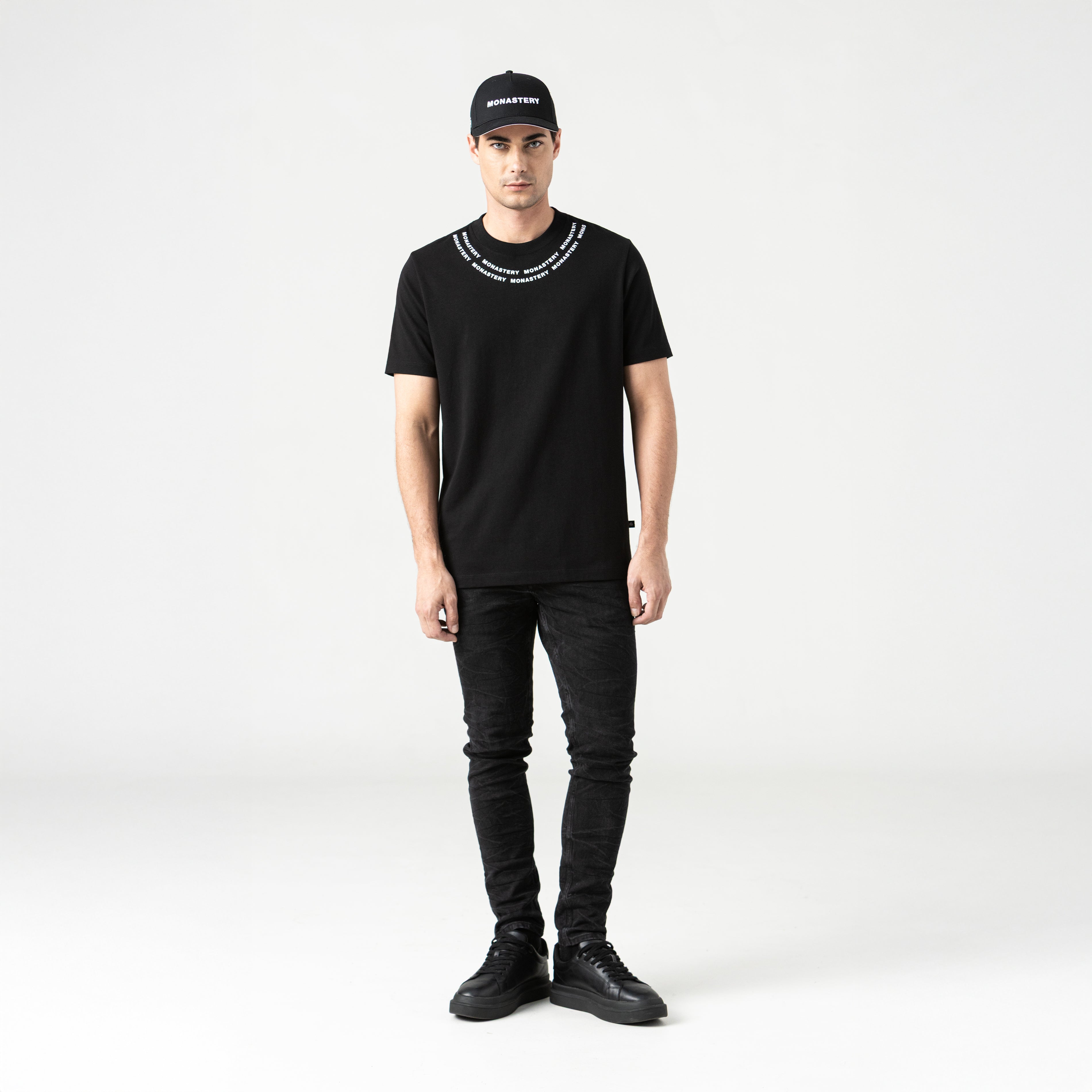 Subtle yet distinctive, the Trot men's t-shirt is made from 100% cotton and designed with a regular silhouette that offers comfort and structure. The front graphic repeats the Monastery logo in a high-density print, creating a tactile and distinctive pattern. On the back, a subtle high-density print adds balance and depth. The 2.5 cm ribbed collar completes this essential piece with a clean, contemporary aesthetic.