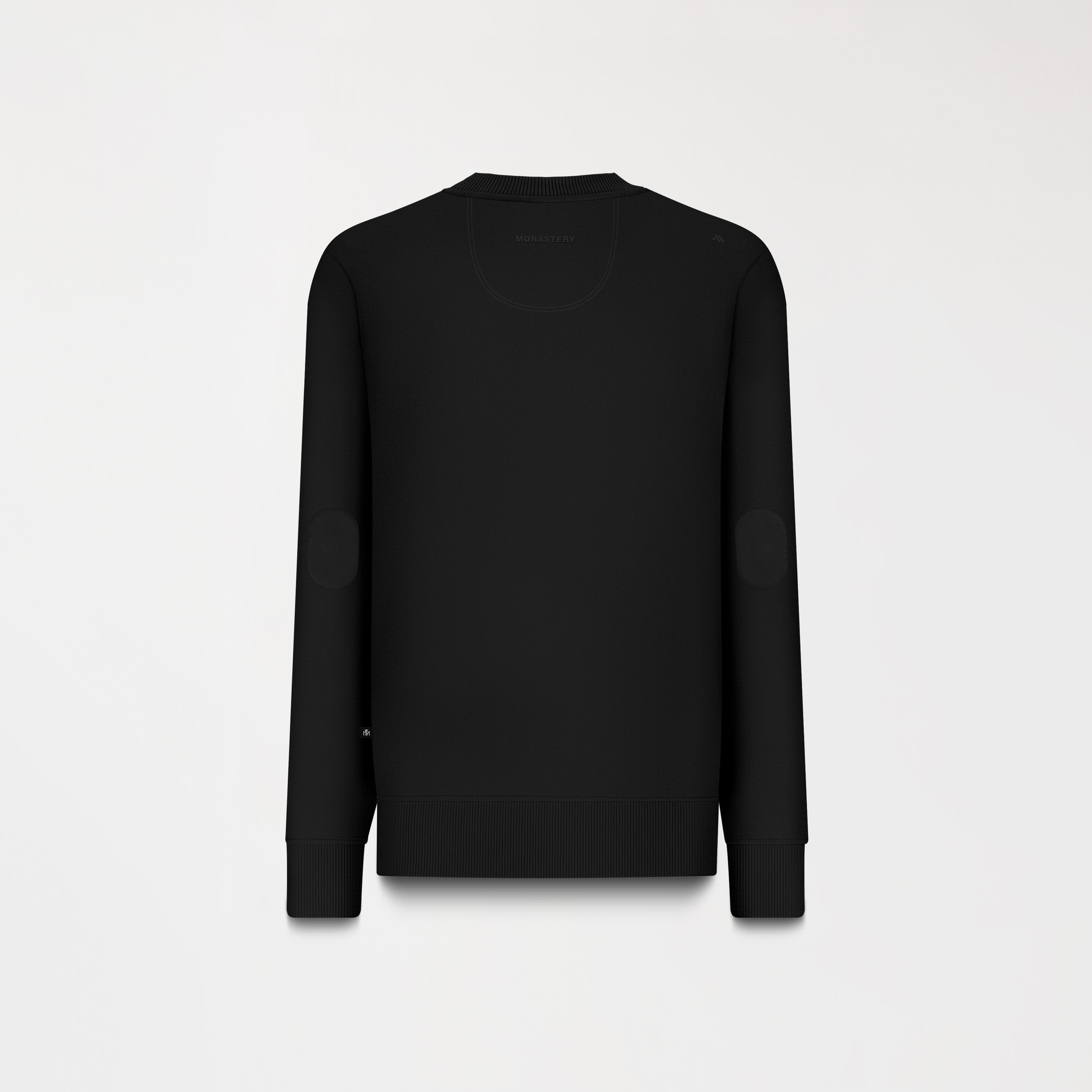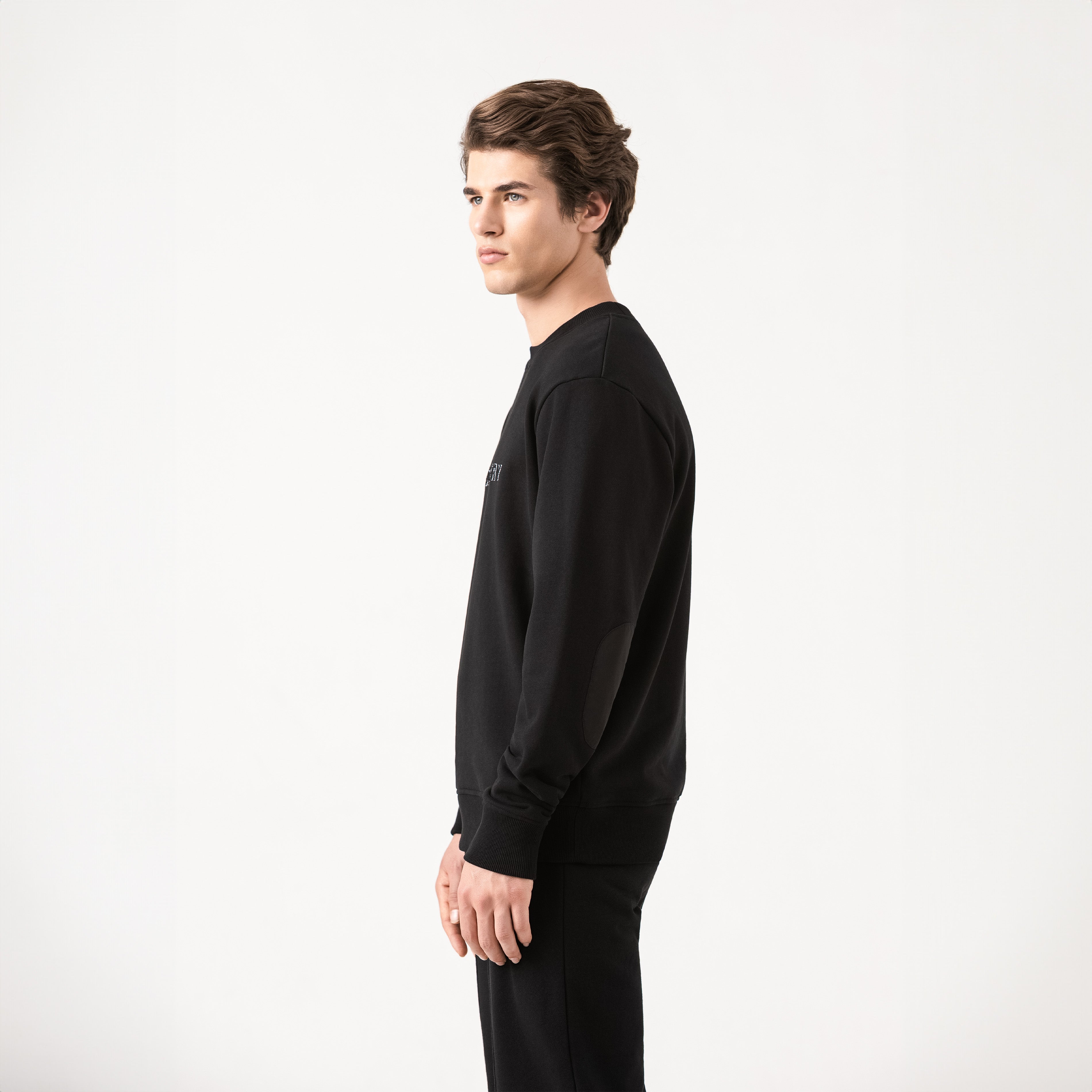 Men's black sweatshirt, made from high-quality Peruvian cotton that guarantees softness, durability, and superior comfort. It features a ribbed collar with a triangular detail at the hem, providing a subtle classic accent. The 3D embroidered front artwork, accompanied by visible stitching, reinforces its graphic character and premium design. A versatile garment for casual looks with a sophisticated touch.