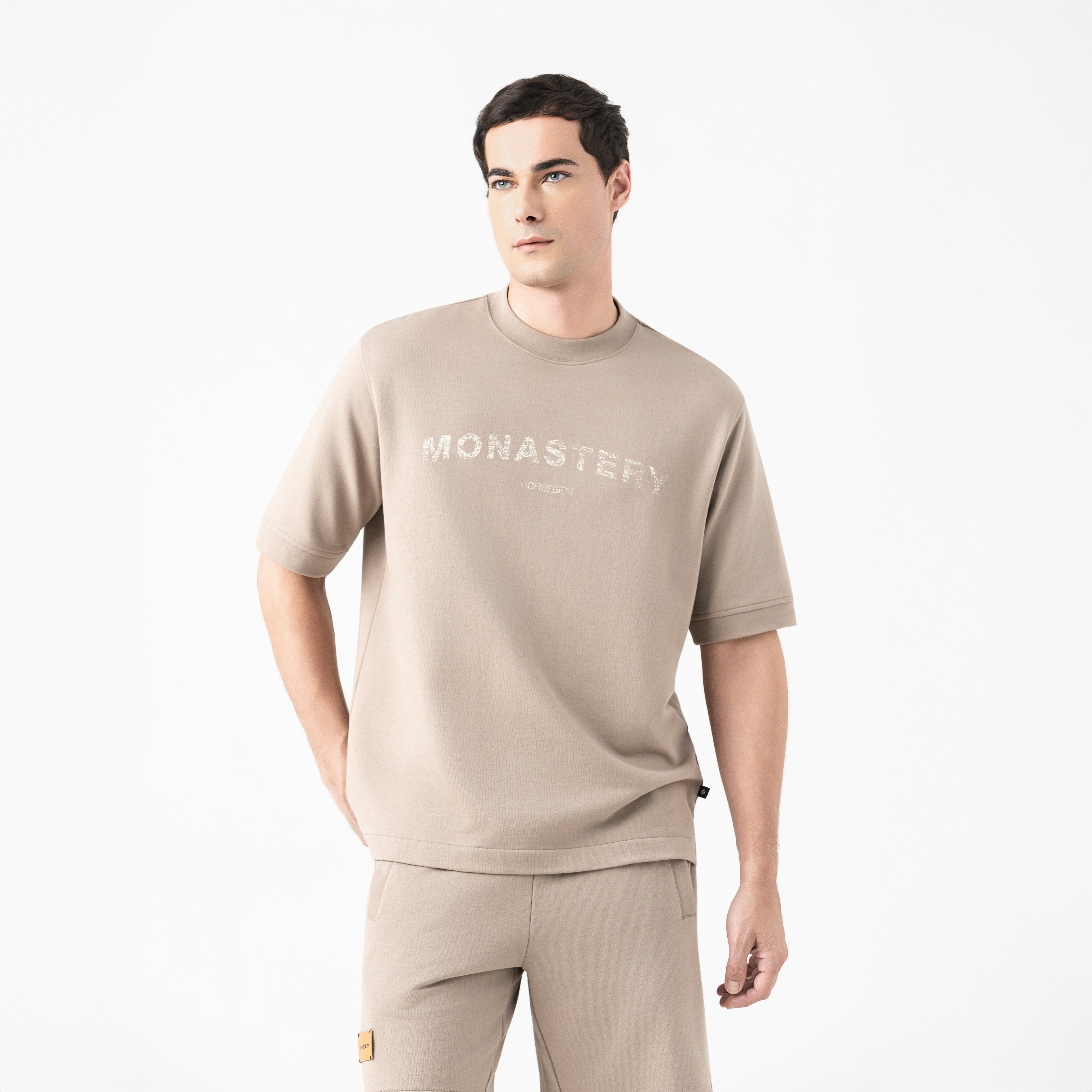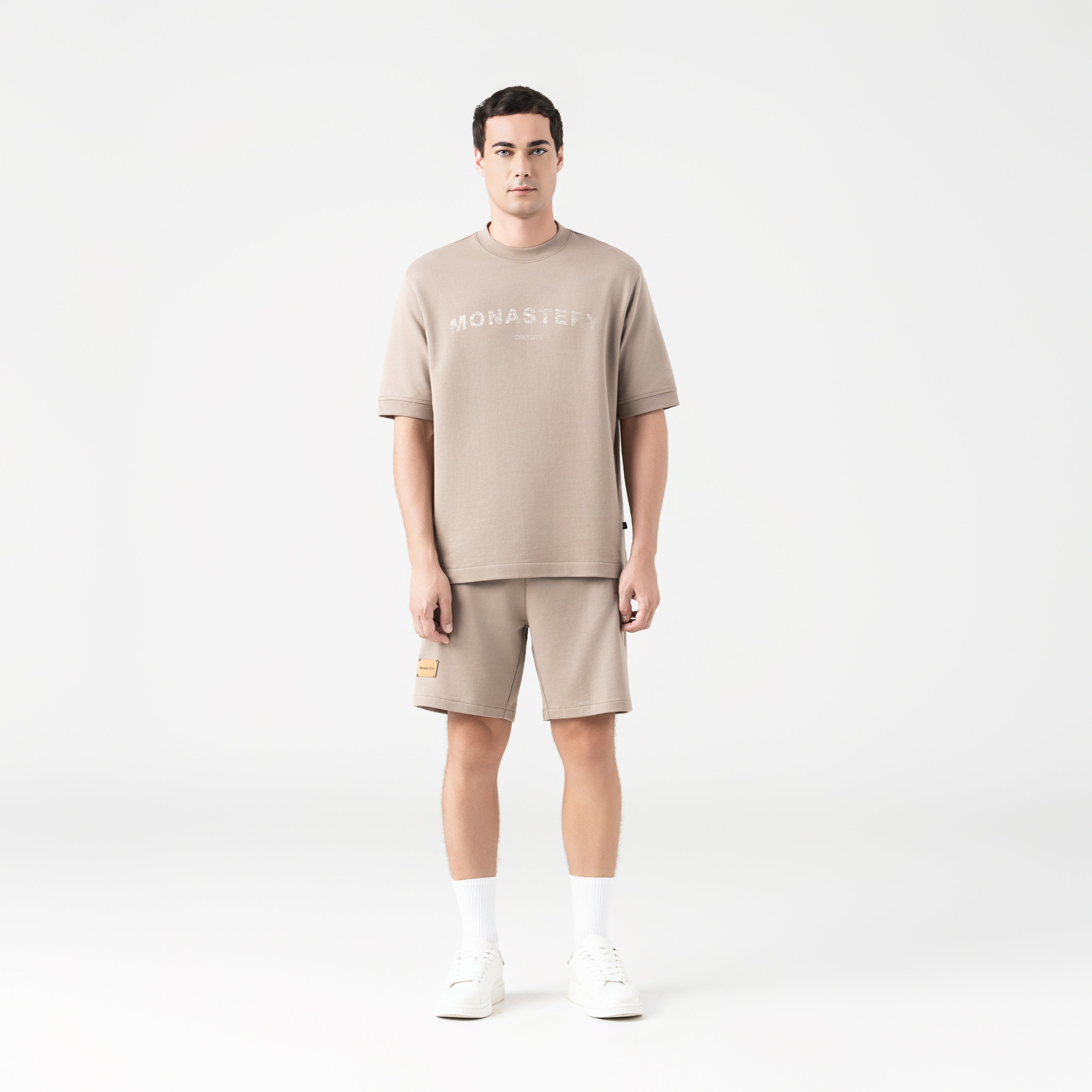 Vikrant is a Burda set, featuring an oversized T-shirt with a fluid drape and relaxed structure. Its design is enhanced by a semi-high-density print on the front and back. A pair of shorts complements the set with an oversized silhouette and high-end tailoring details. It features a matching drawstring with contrasting metal toe caps, providing a distinctive and functional accent. The design includes a semi-high-density print and polyurethane appliqué, a combination of comfort, structure, and meticulously designed details.