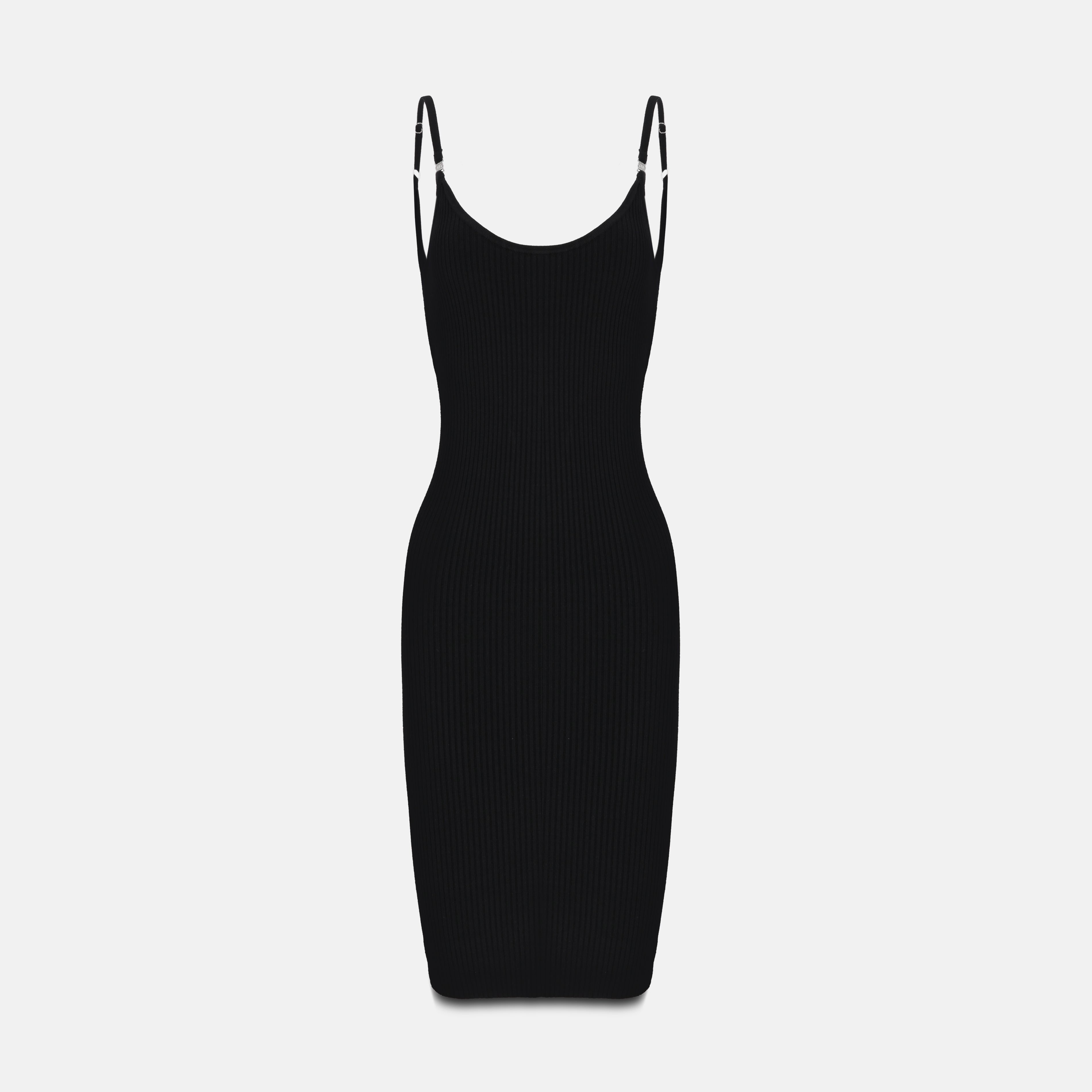 Feminine dress with a fitted silhouette, crafted from an exclusive Monastery fabric that provides structure and a subtle texture that stylizes the figure. Available in three shades—black, white, and Irish Cream, the collection's signature color. It features contrasting straps that reinforce the brand's identity and a deep back neckline, adorned with a metallic plaque that adds a sensual and contemporary touch. Its body-hugging fit makes it a versatile piece, ideal for casual looks with refined elegance.
